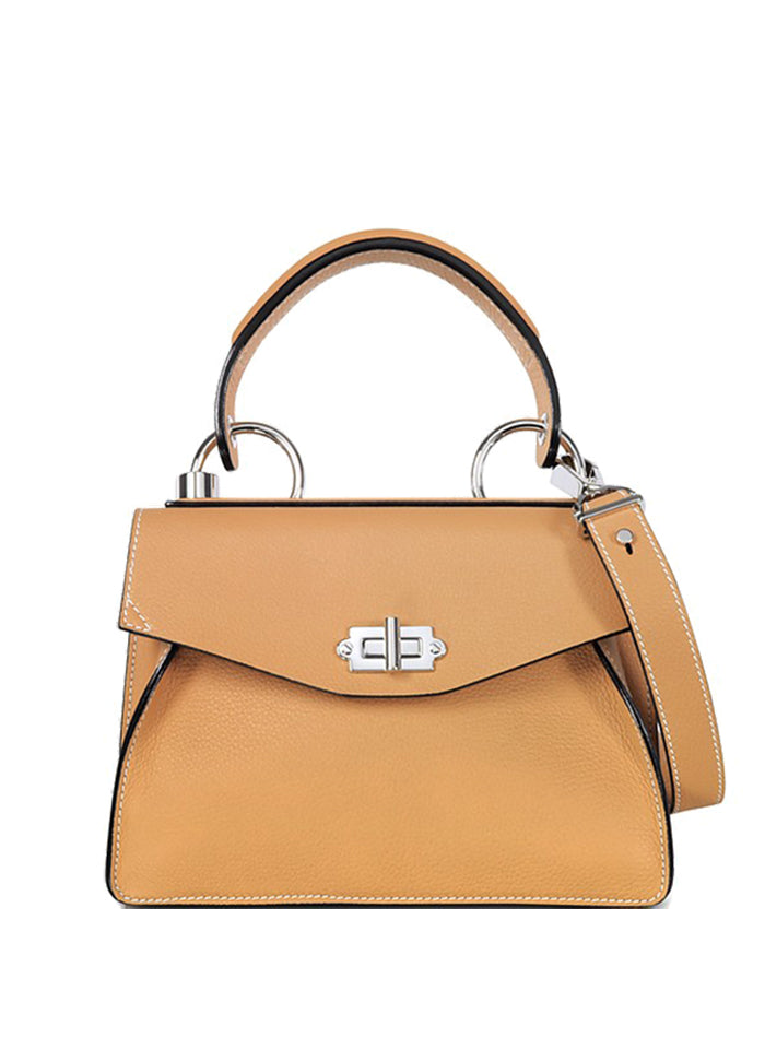 Grain leather small top handle handbag with painted edging. Includes adjustable, detachable shoulder strap. Leather lined with one internal pouch pocket and external back zip pocket. Features signature metal turn-lock closure, additional hidden toggle, and gusset detail.