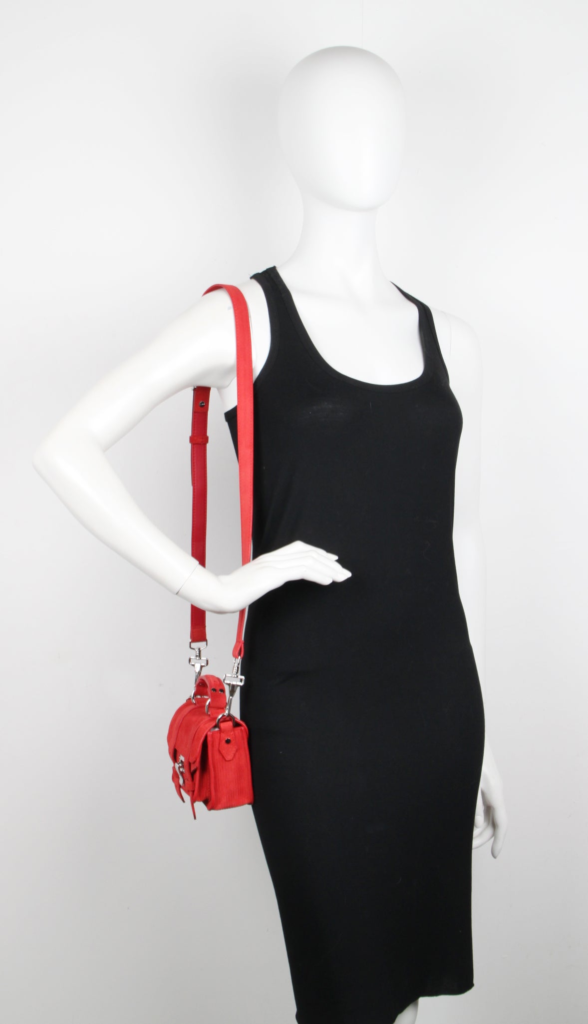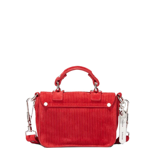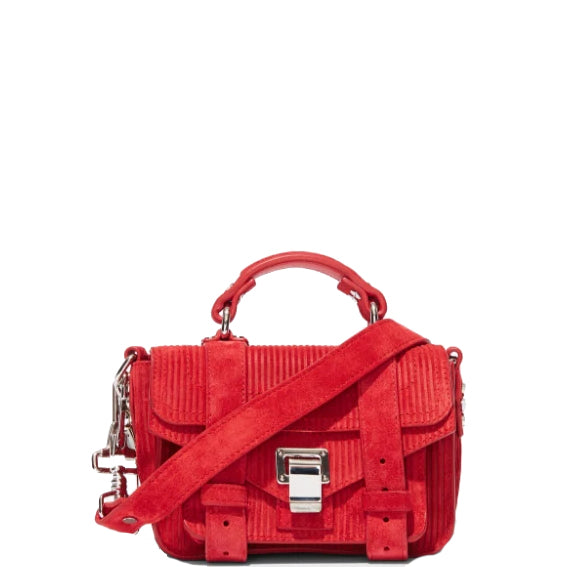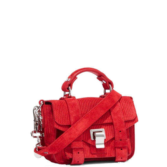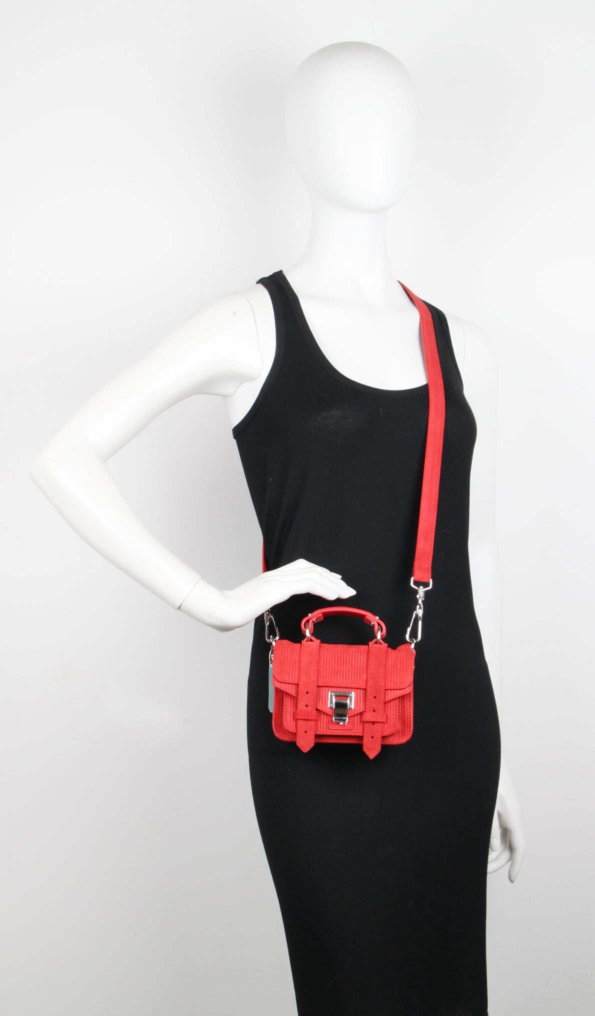 Crafted in red suede that is embossed to resemble corduroy, the Corduroy Suede PS1 Micro is secured by a signature silver-tone tab closure and belted straps. The exterior features a gusseted compartment on the front. Includes a sculpted top handle and a removable, adjustable shoulder strap. Embossed logo tag. Canvas interior lining.