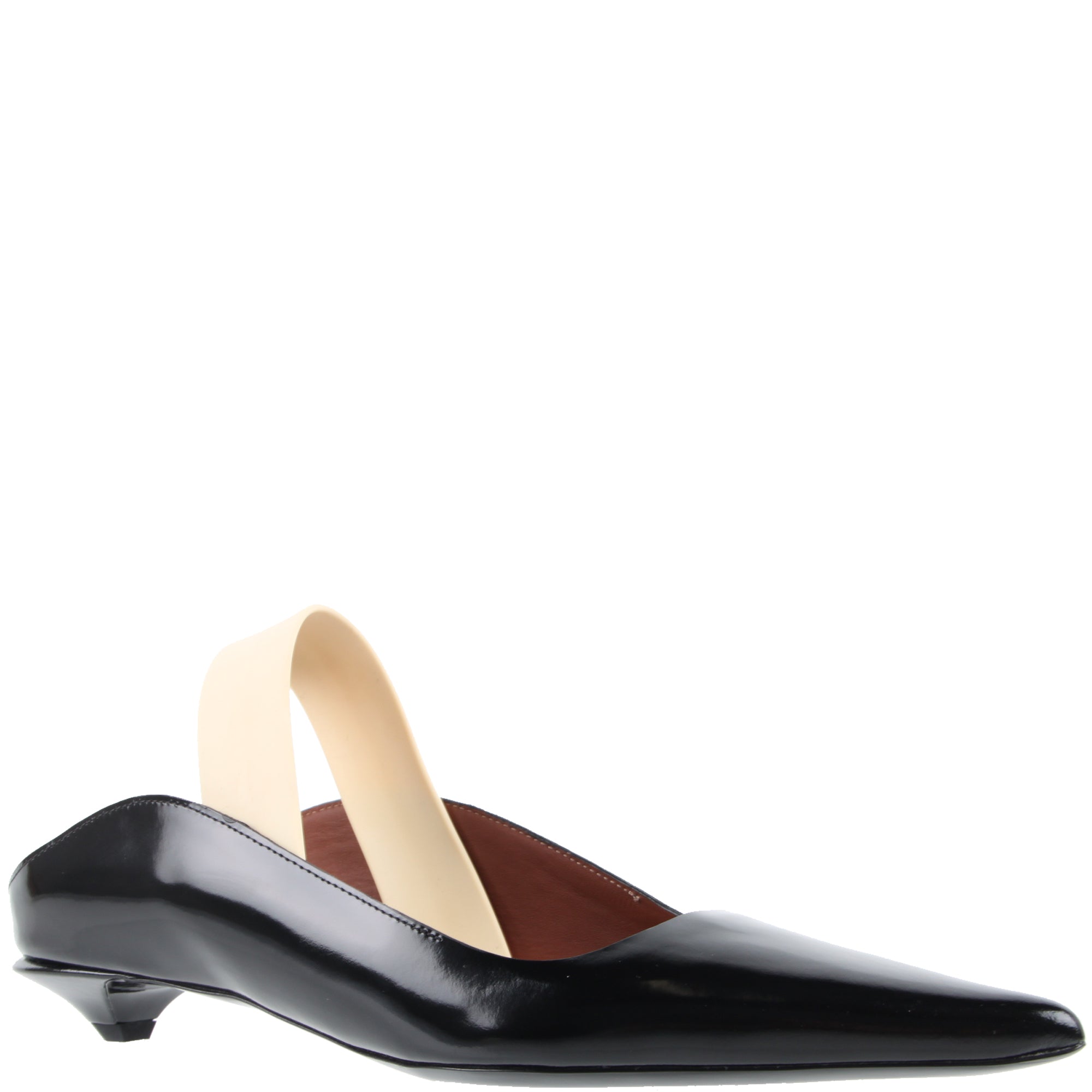 The Slingback Wave Pumps reimagine the classic pump silhouette with a gestural wave design and an angular kitten heel. They are crafted in smooth polished black leather and secured with a rubberized slingback.