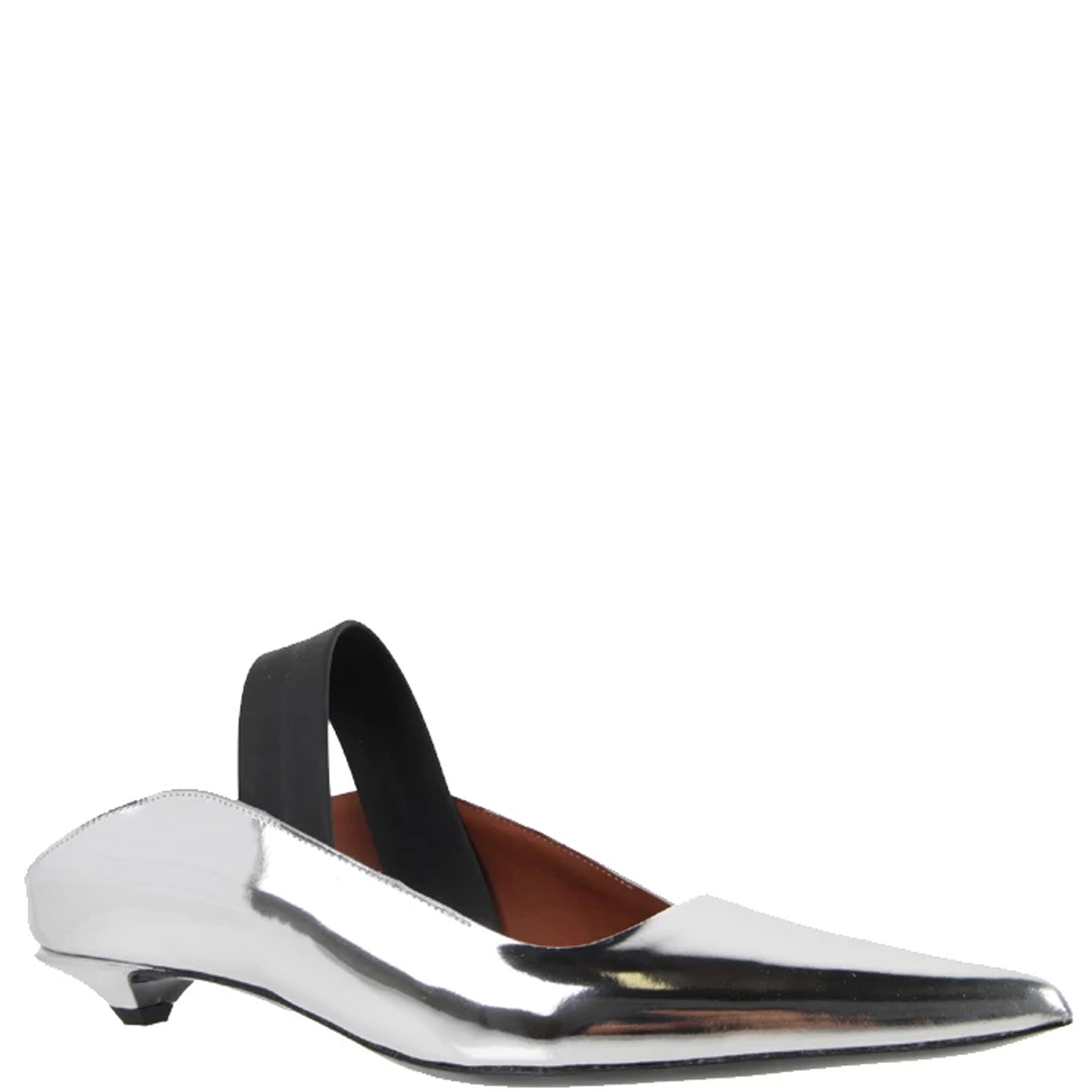 The Slingback Wave Pumps reimagine the classic pump silhouette with a gestural wave design and an angular kitten heel. They are crafted in smooth patent silver leather and secured with a rubberized slingback.