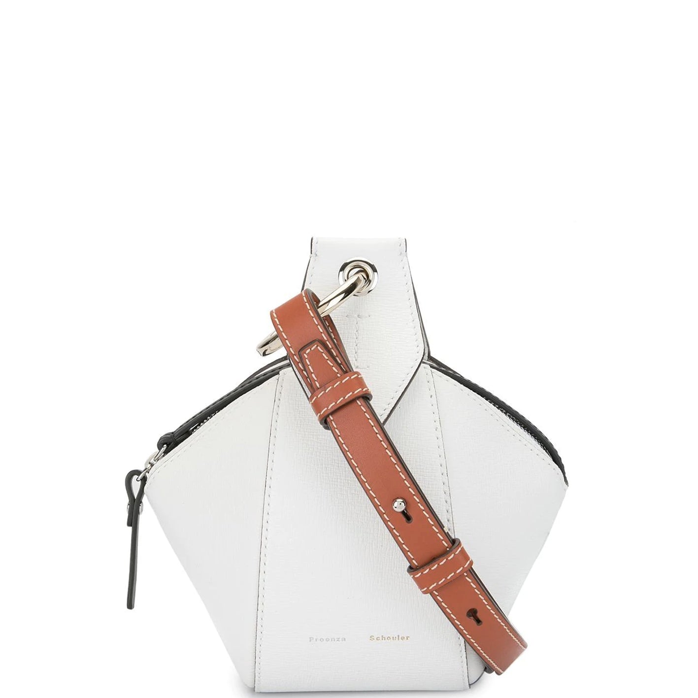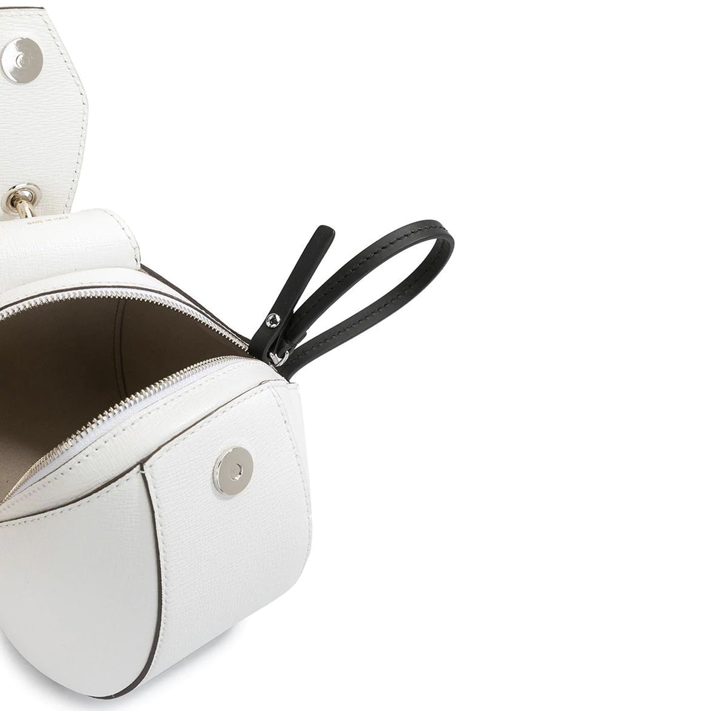 The Zipper Pochette in white combines grained calf leather with a graphic, structured silhouette and mixed metal hardware. Designed with a removable top handle in snakeskin-embossed calf leather and a contrasting adjustable shoulder strap with topstitching details. Magnetic fastening and top zip closure. Contrast black painted edges. Signature dual-toned logo stamp in silver and gold tones. Calf leather.