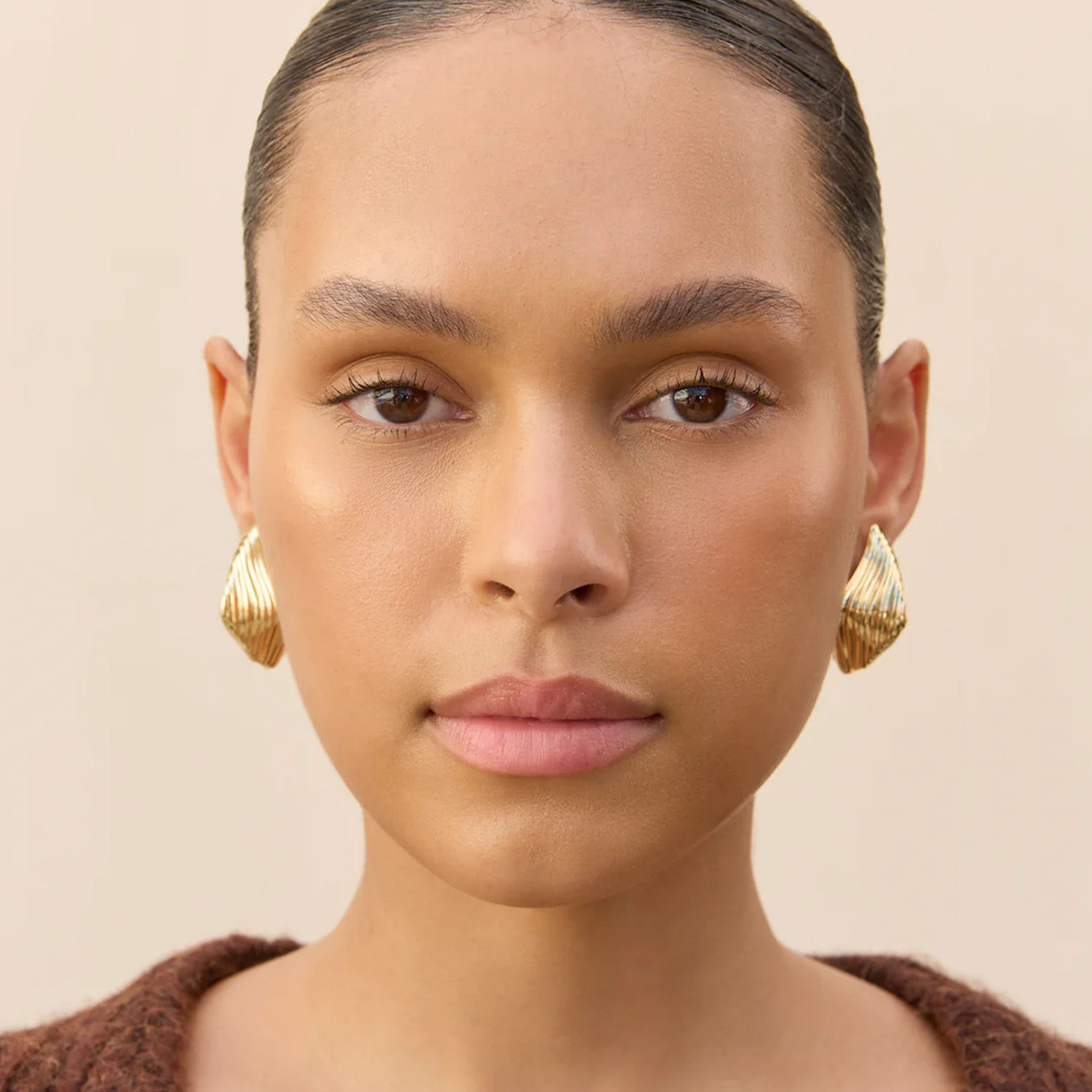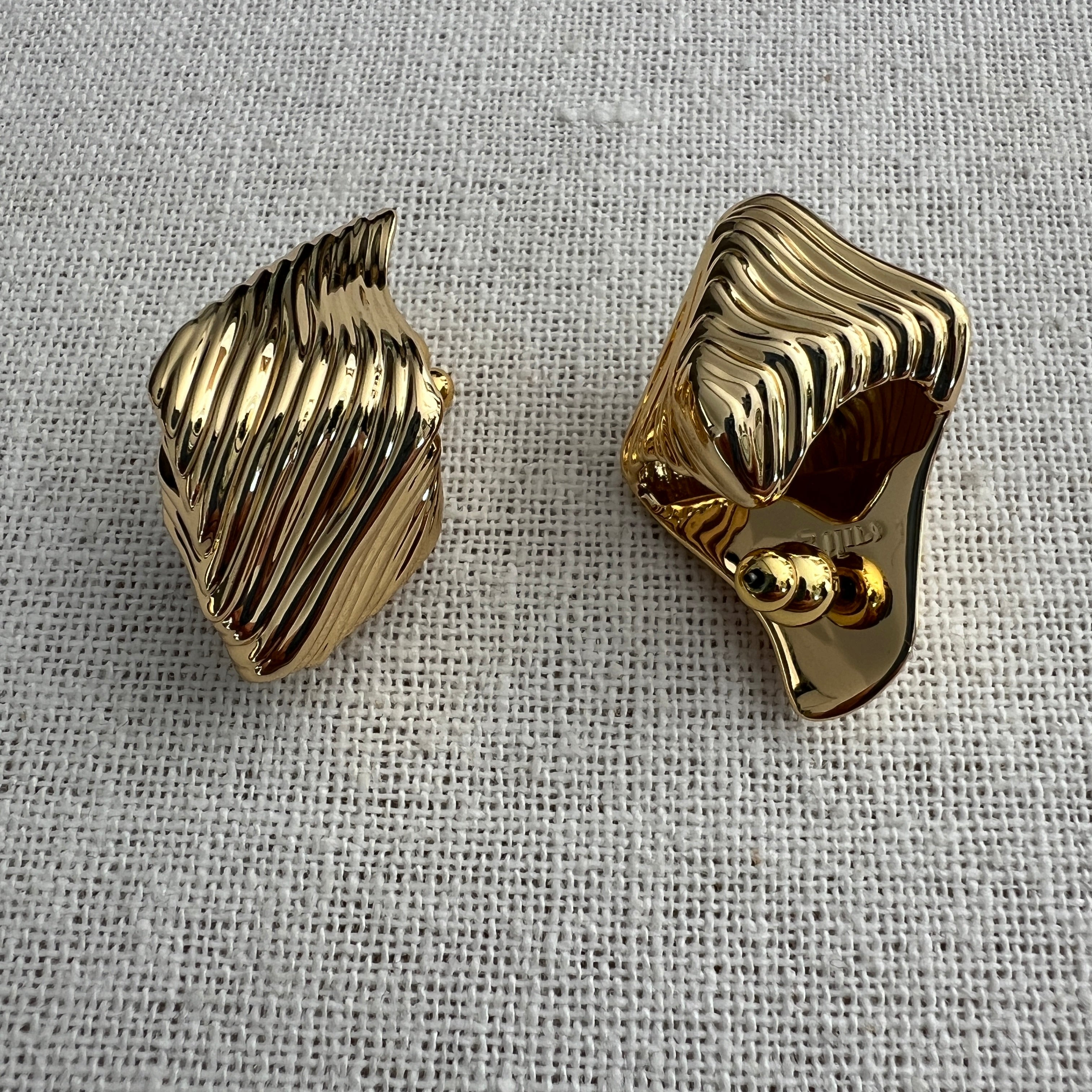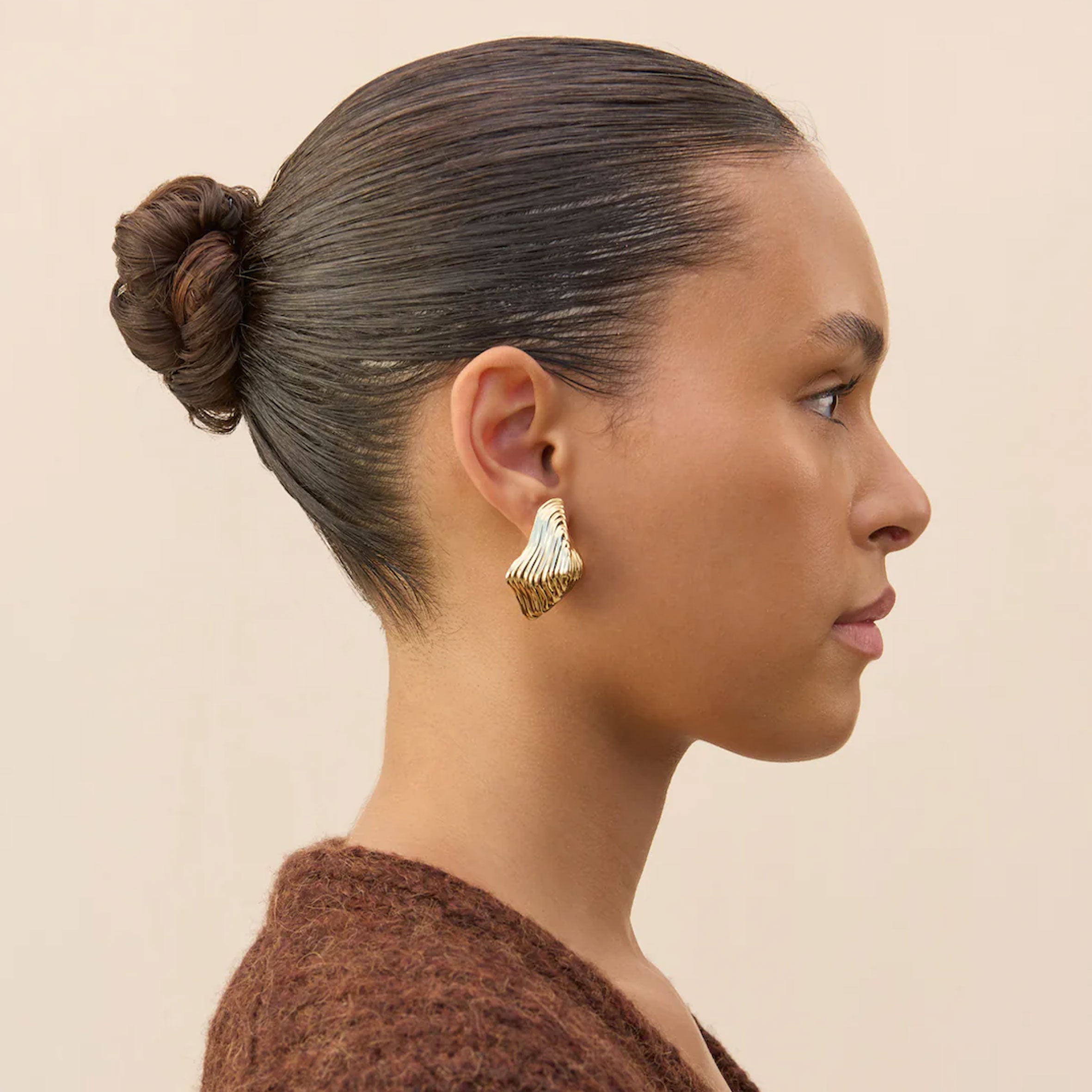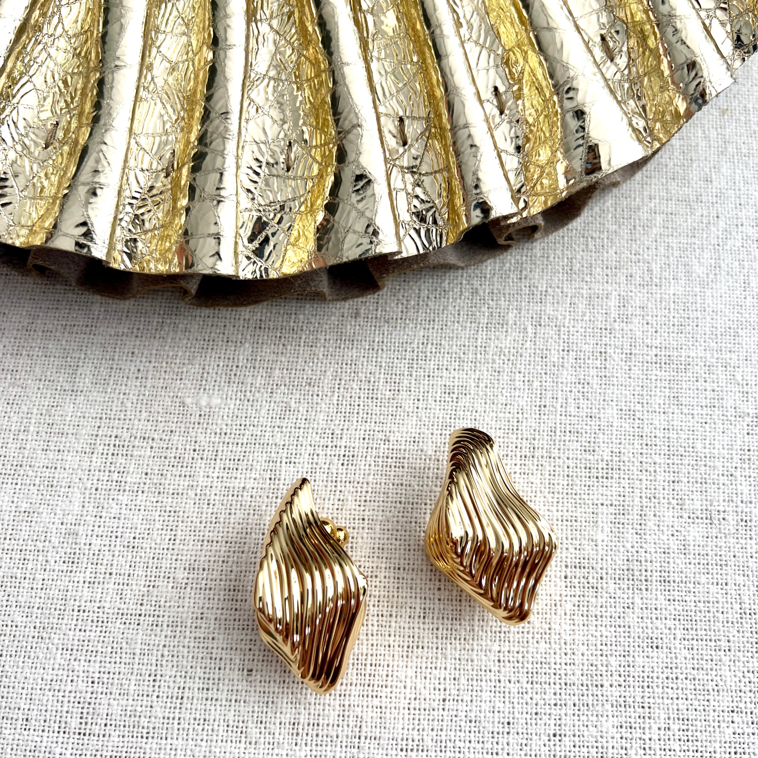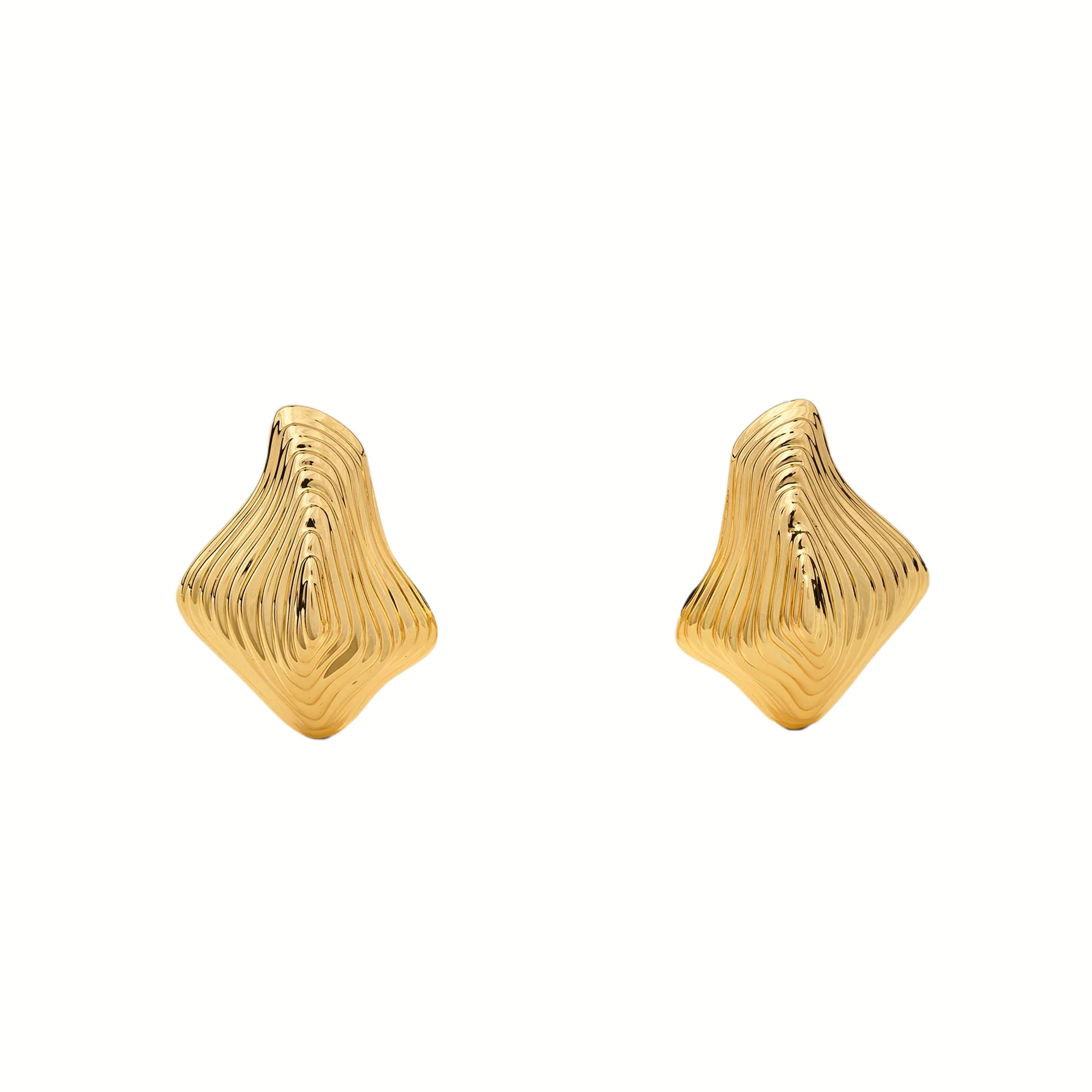 An organic gold toned earring with abstract embossed rings.