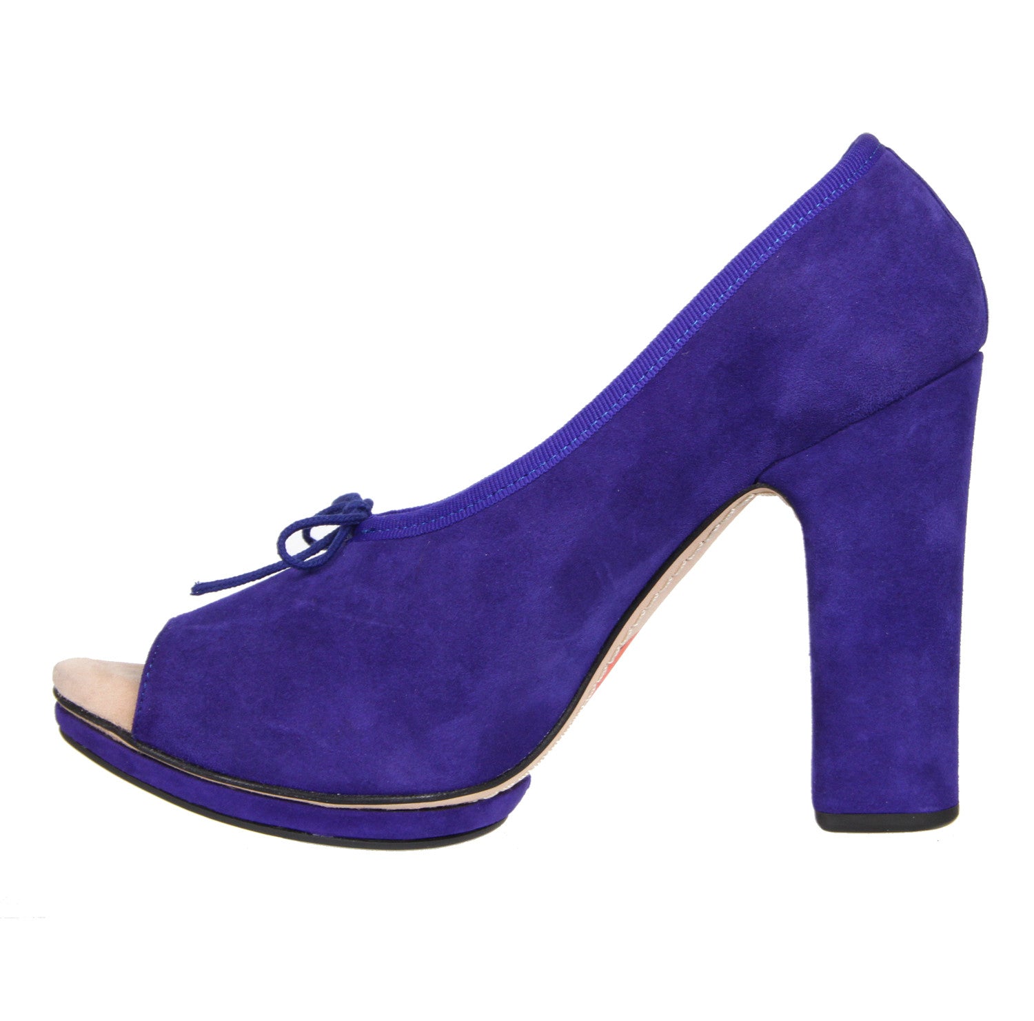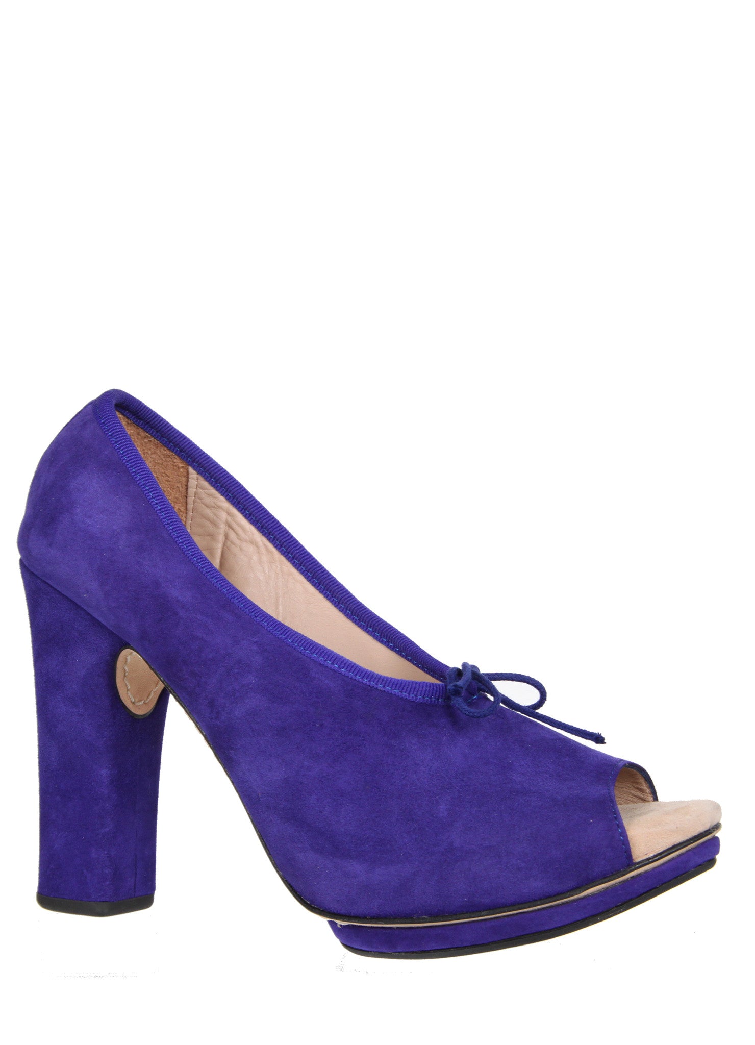 Platform Peep-Toe heel with suede upper. Cushioned foot bed. Open toe with grosgrain trim and bow detail. Rubber grips at base.