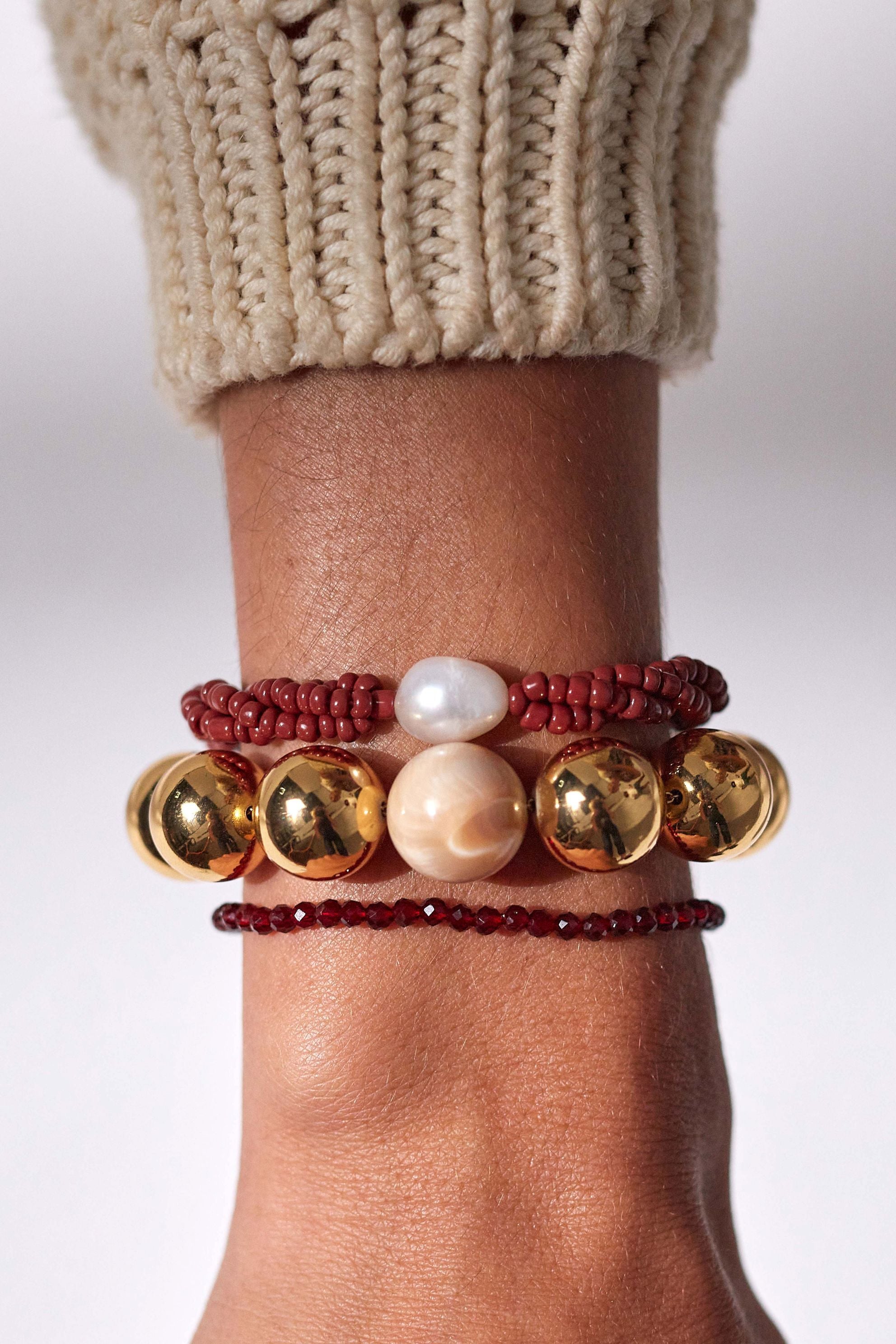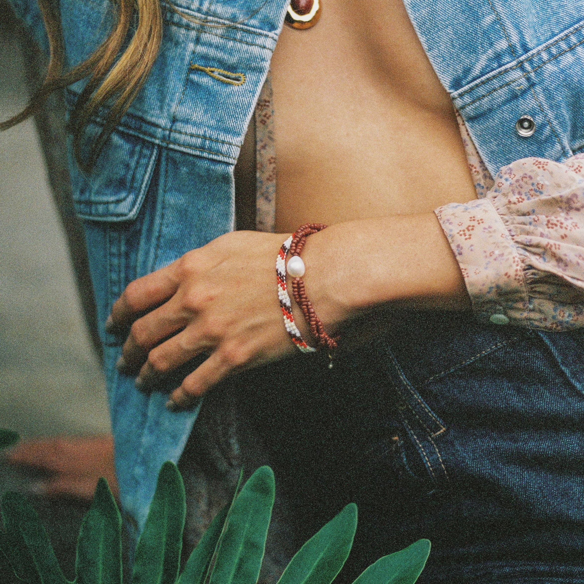 Deep burgundy beads and pearls — Rodeo is bold and unafraid, like boots hitting the dance floor for a line dance. A statement piece with a playful kick