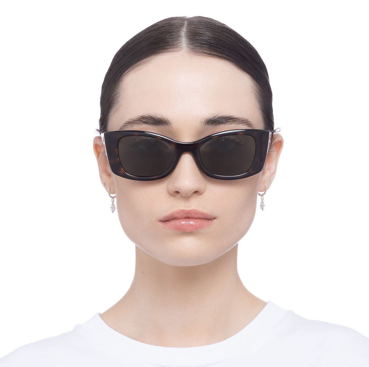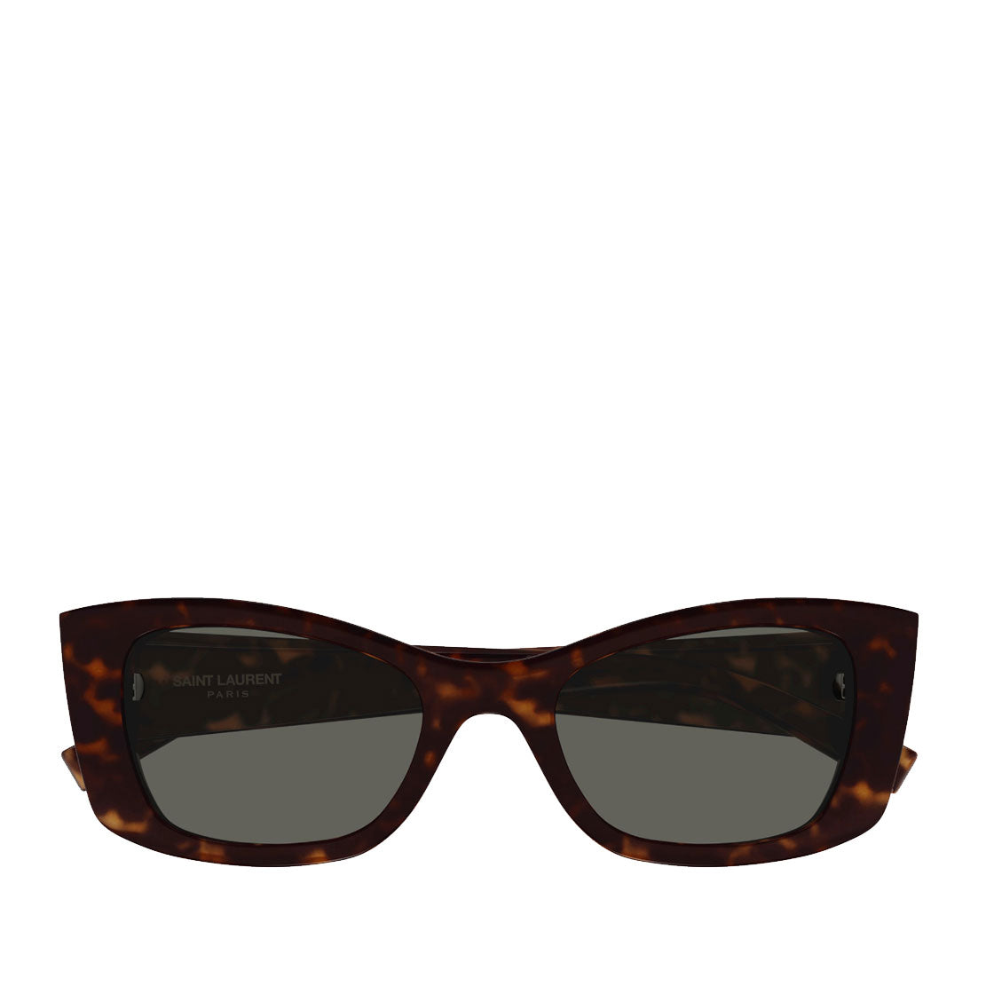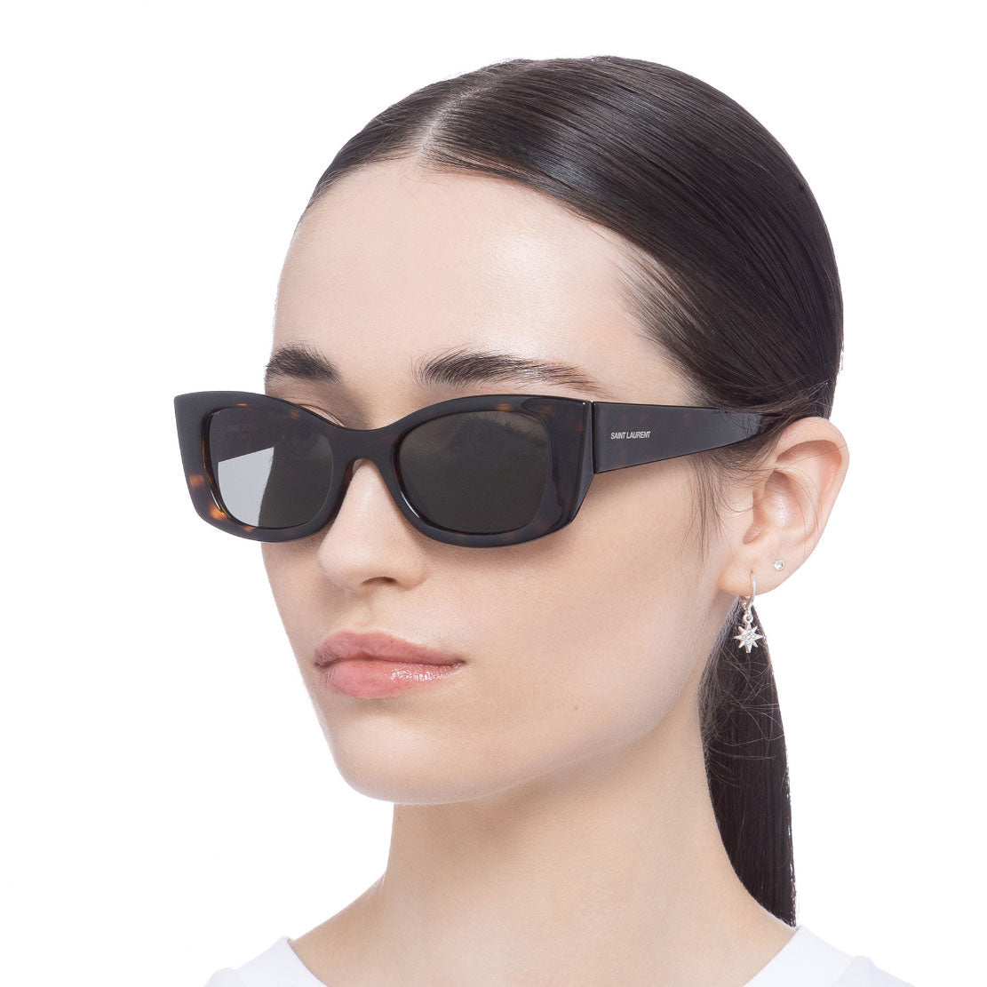 Cat eye Saint Laurent sunglass in a dark havana frame with grey mirror lenses. An ultra cat eye feminine style characterized by a narrow shape with pointy angles. The style is enriched by an exaggerated play of volumes throughout front and temples. The logo is engraved and enriched with gray enamel.
