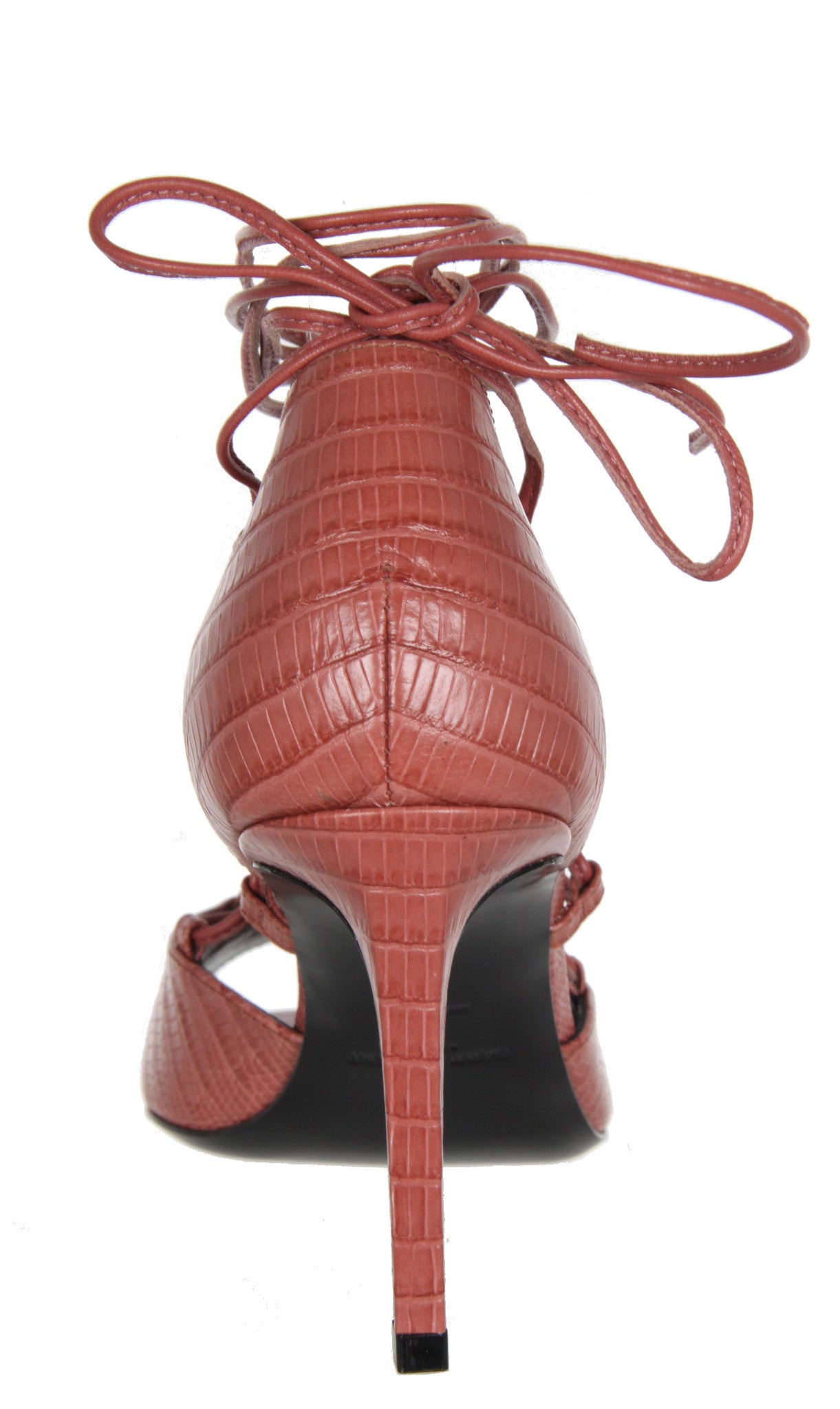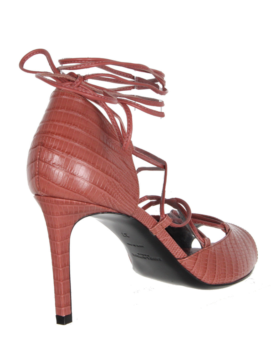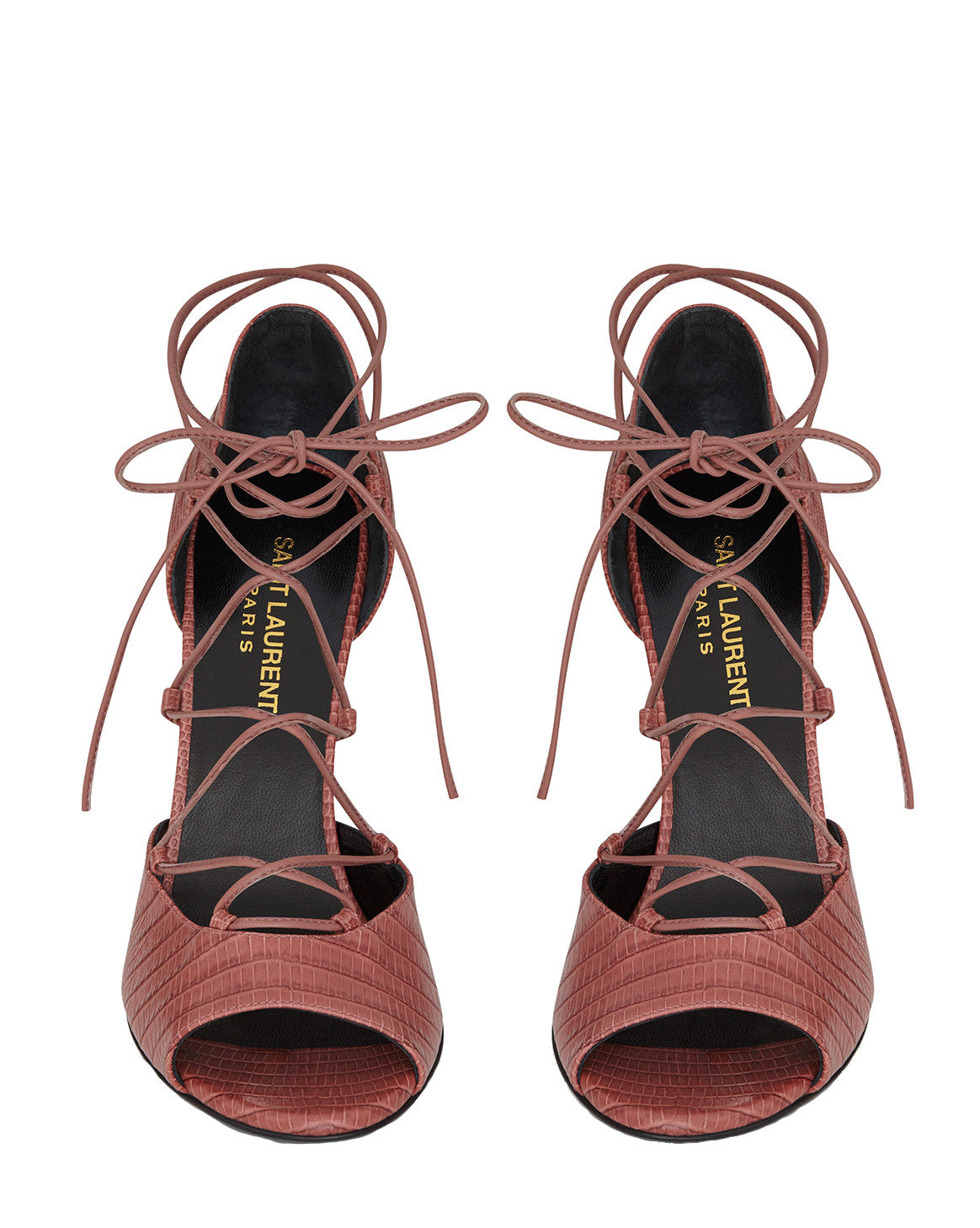 Jane 80 peep toe lace-up sandal in dark pink lizard embossed leather. Mid heel stiletto sandal with intertwining straps.