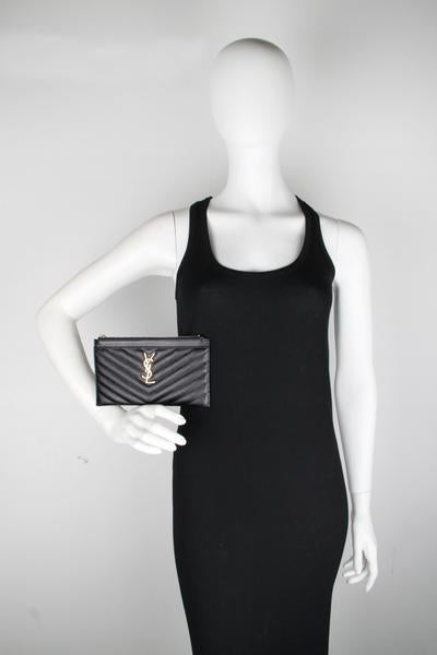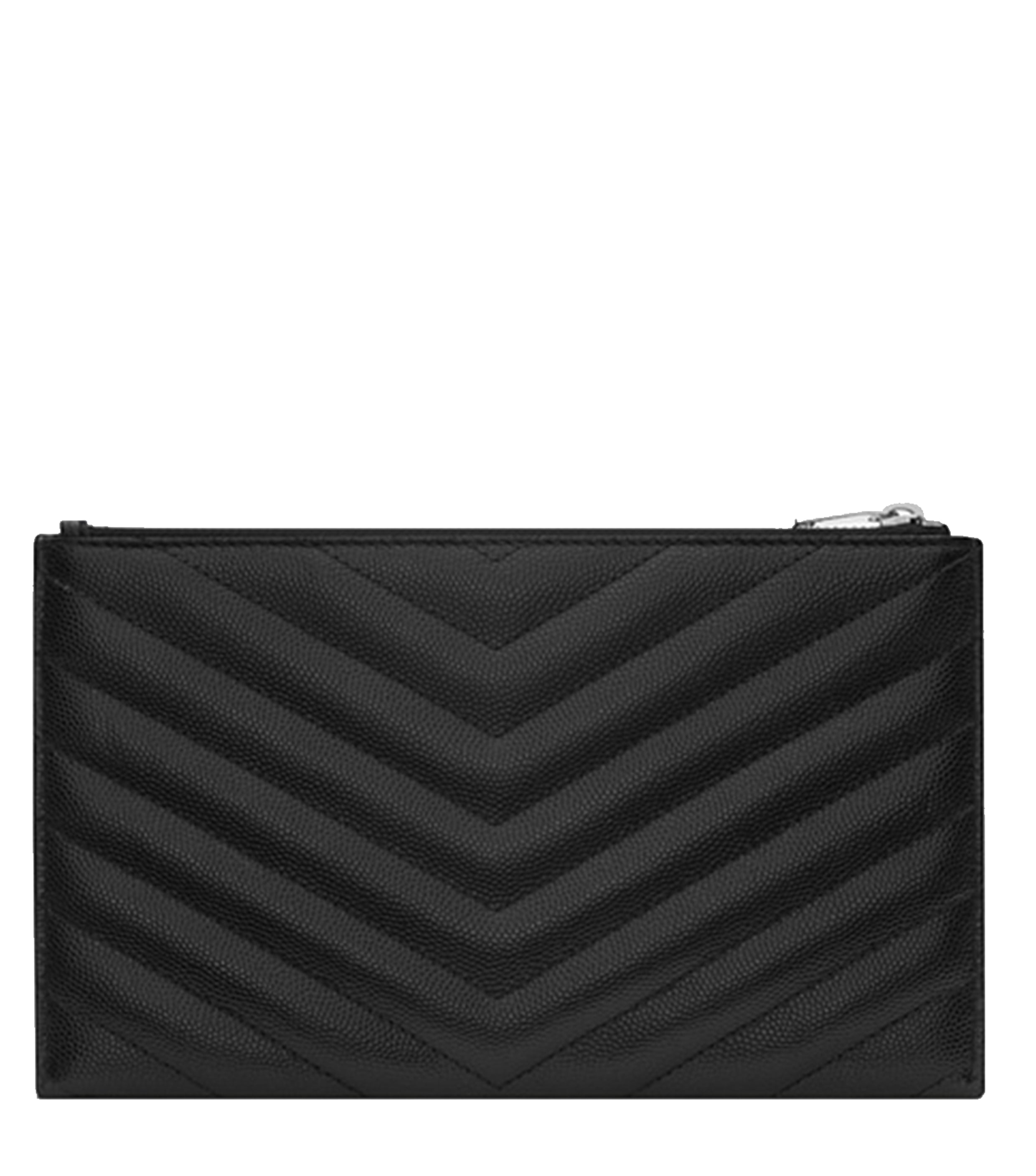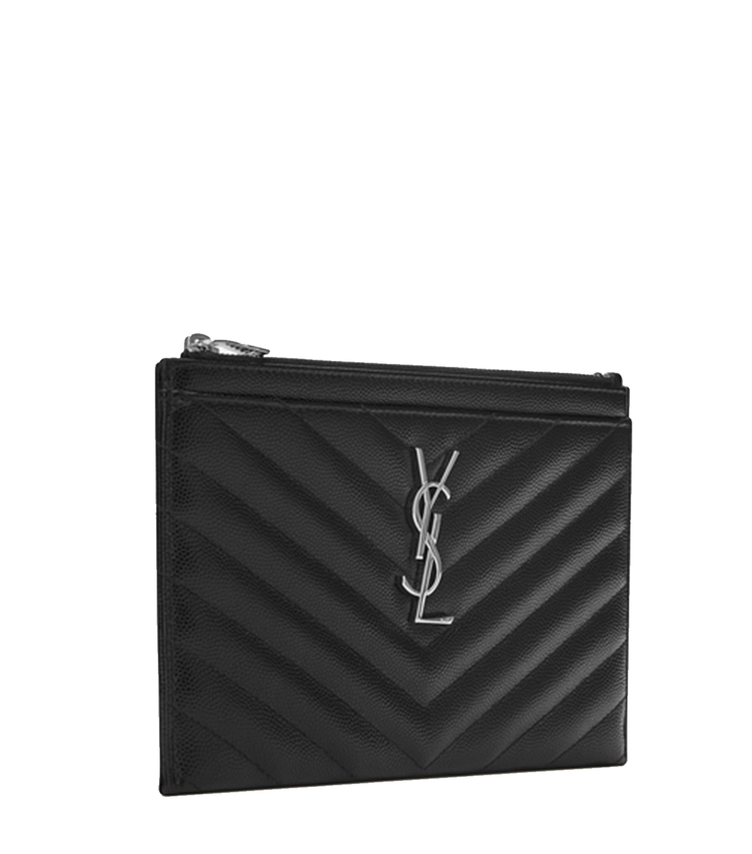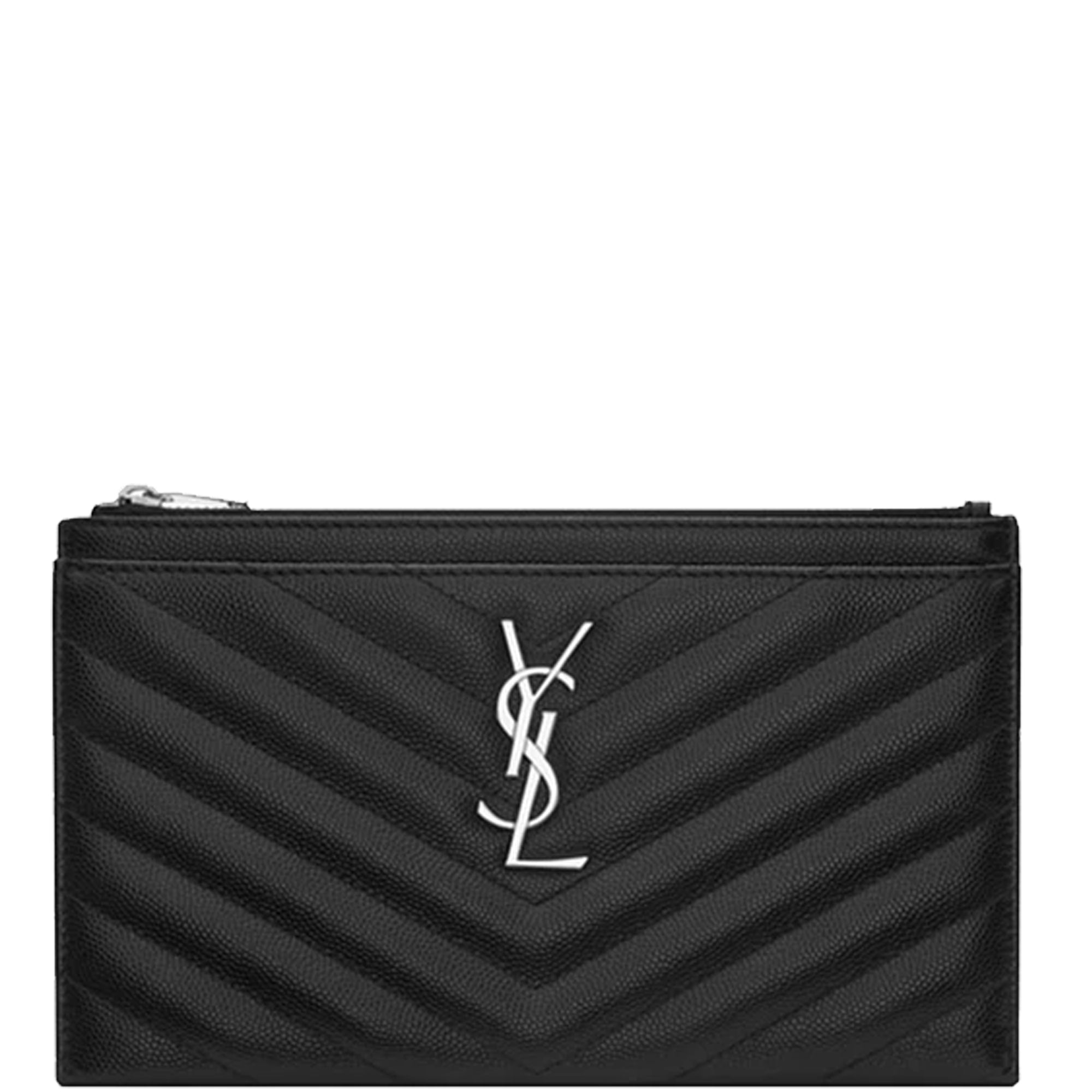 Zippered pouch adorned with central metal YSL monogram and quilted overstitching. Silver-tone metal hardware, grosgrain lining and one flat pocket on outside.