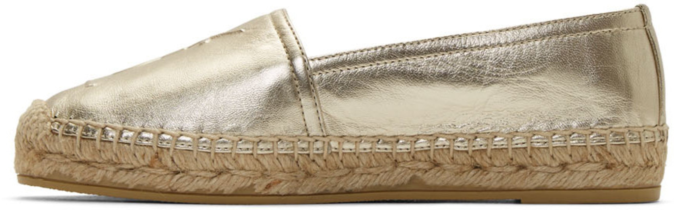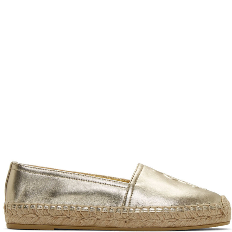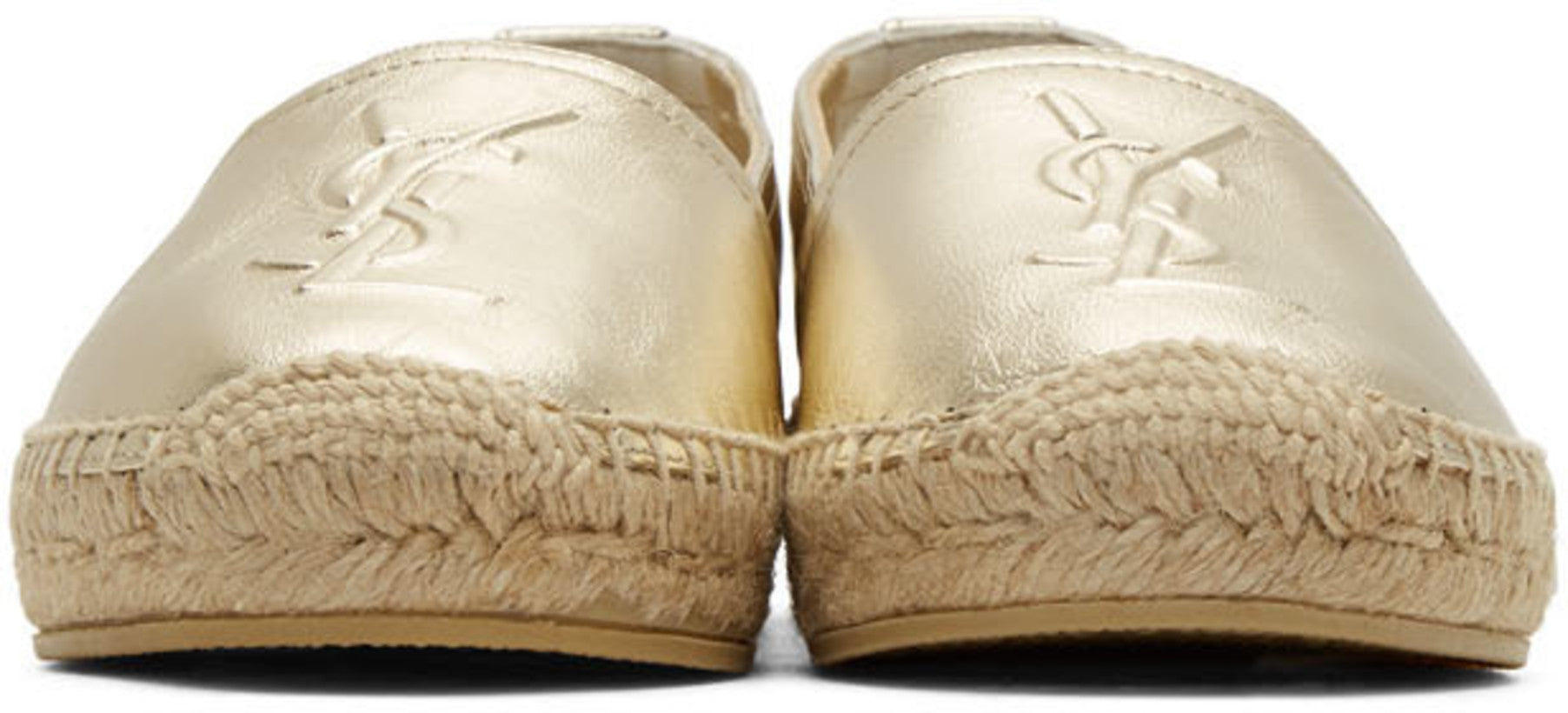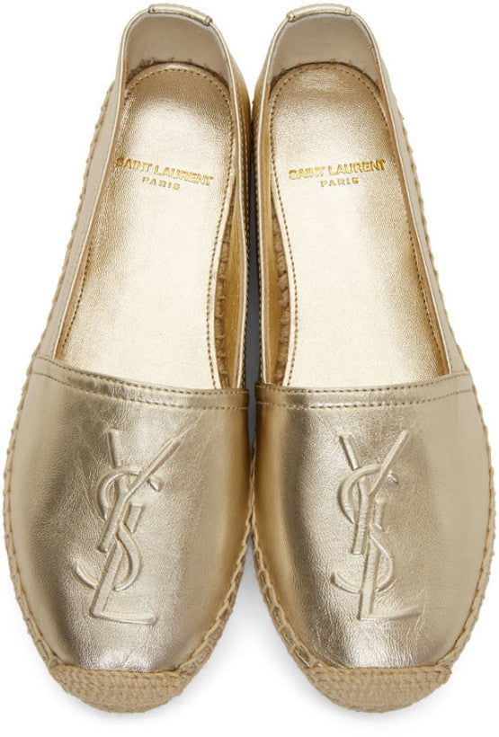 Saint Laurent lambskin espadrille with embossed interlocking YSL signature, rubber sole, gross grain pull-on tab, jute rope mid-sole and foot-bed.