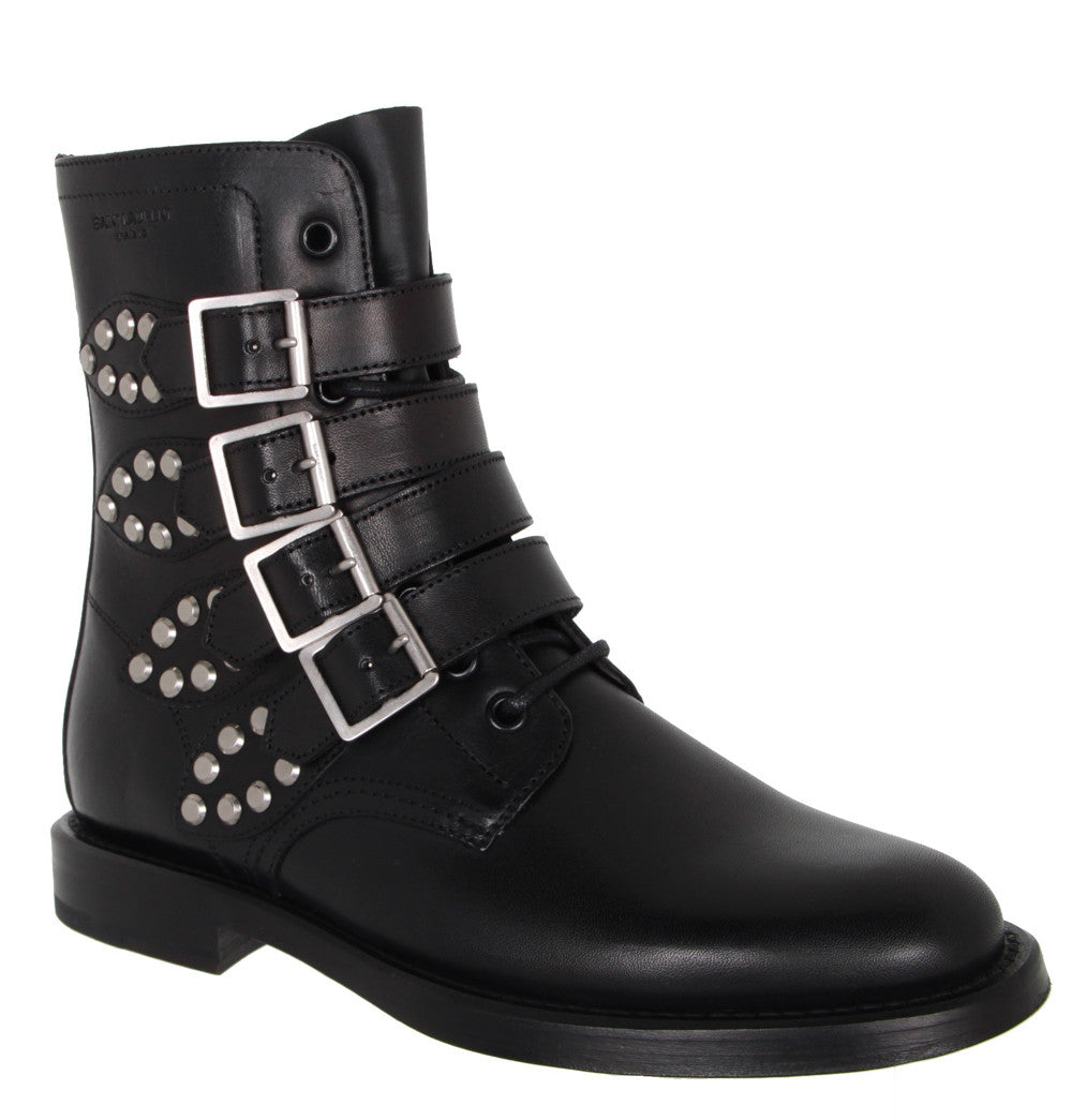 Classic lace-up utilitarian boot with 4 adjustable straps with saint laurent engraved buckles and flat studs and on the strap of each strap.