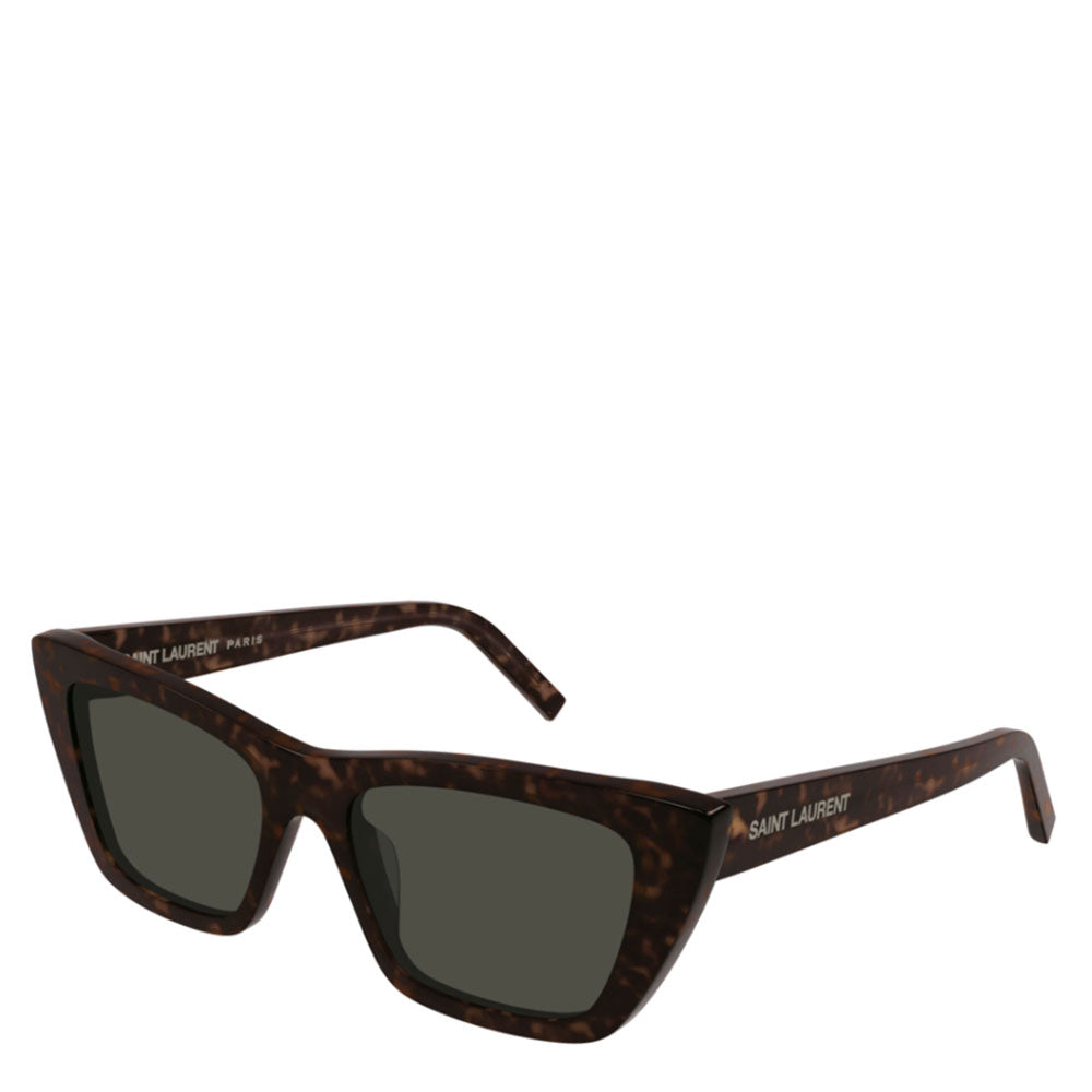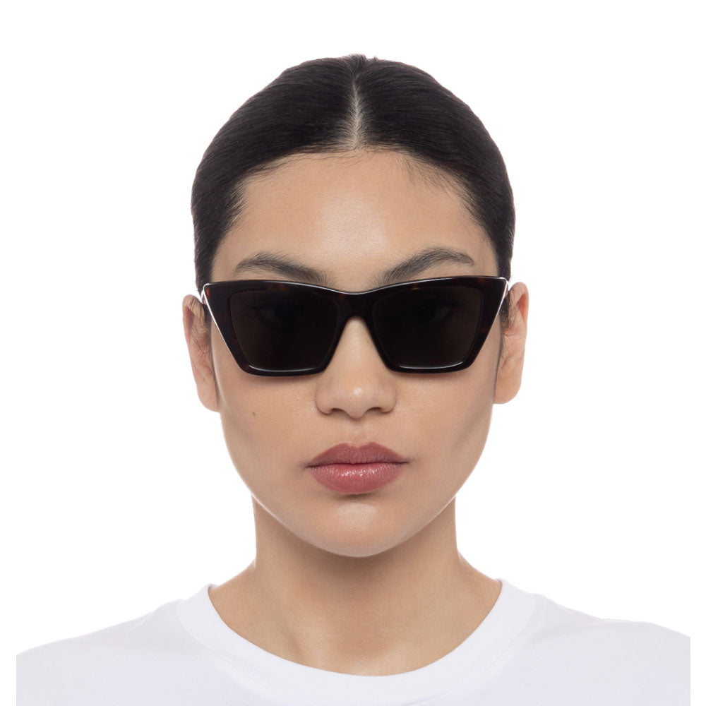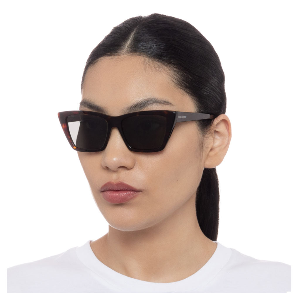 A classic cat eye style with a glossy black frame, stamped with the label's logo in silver along the arms and fitted with tonal lenses.