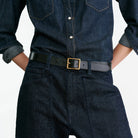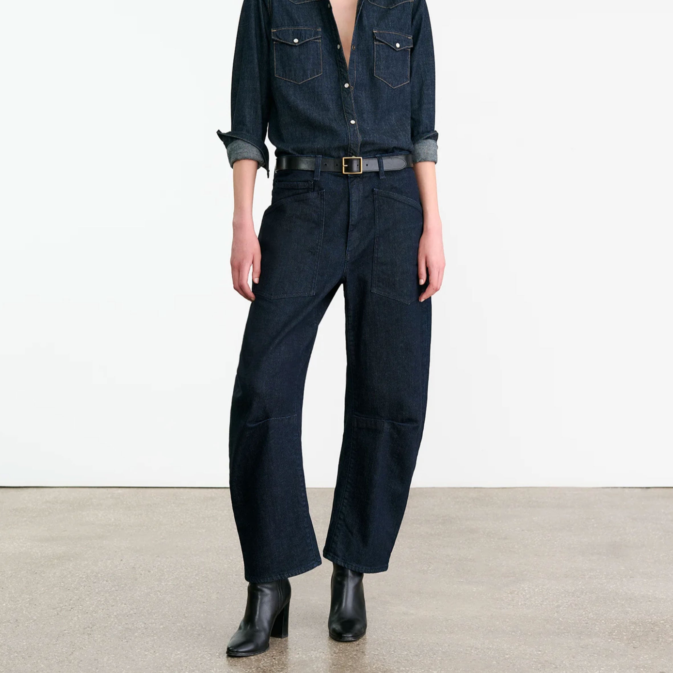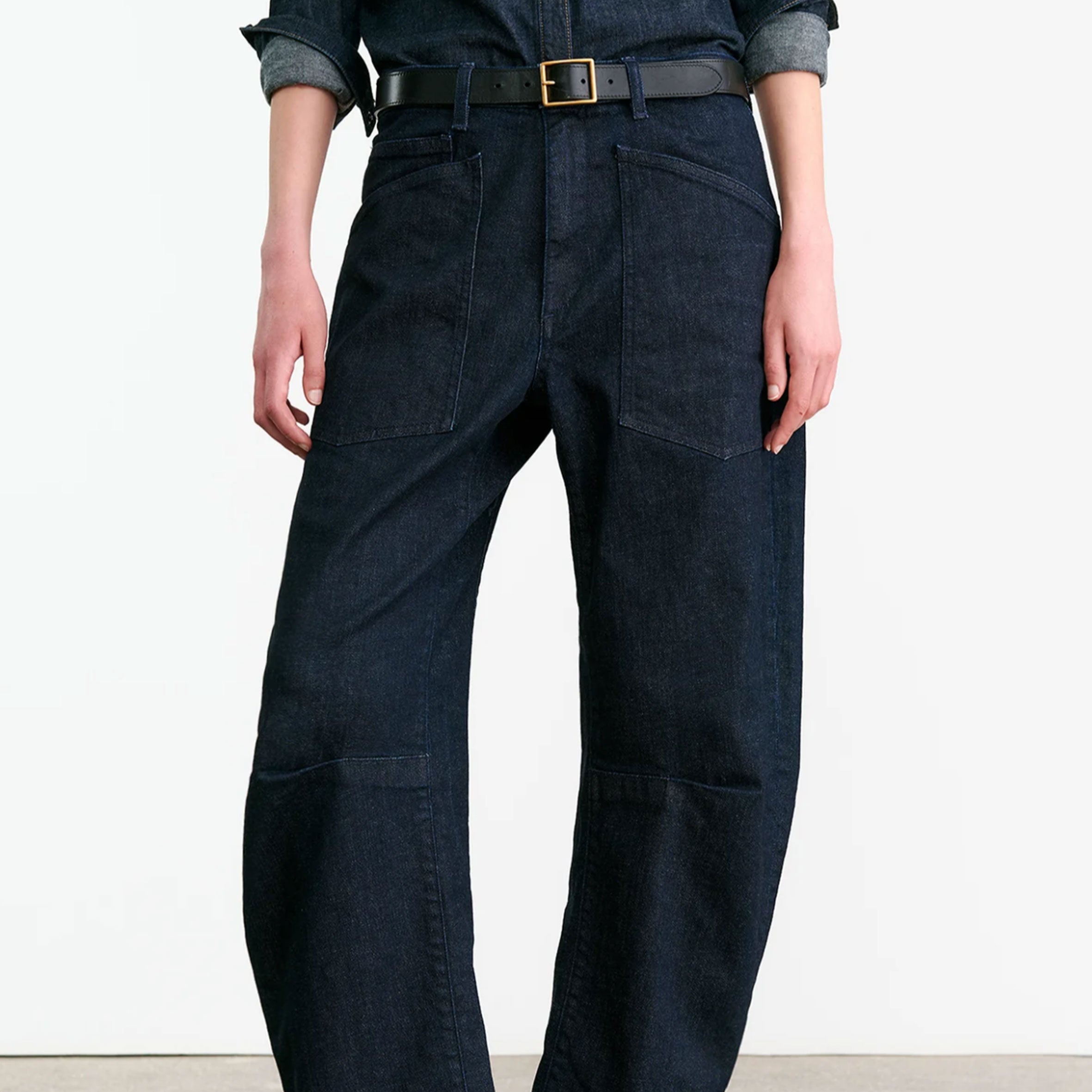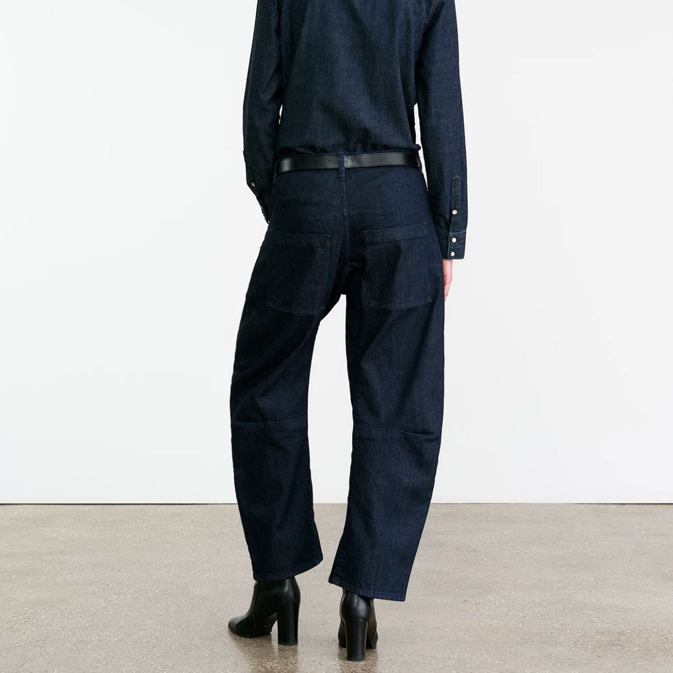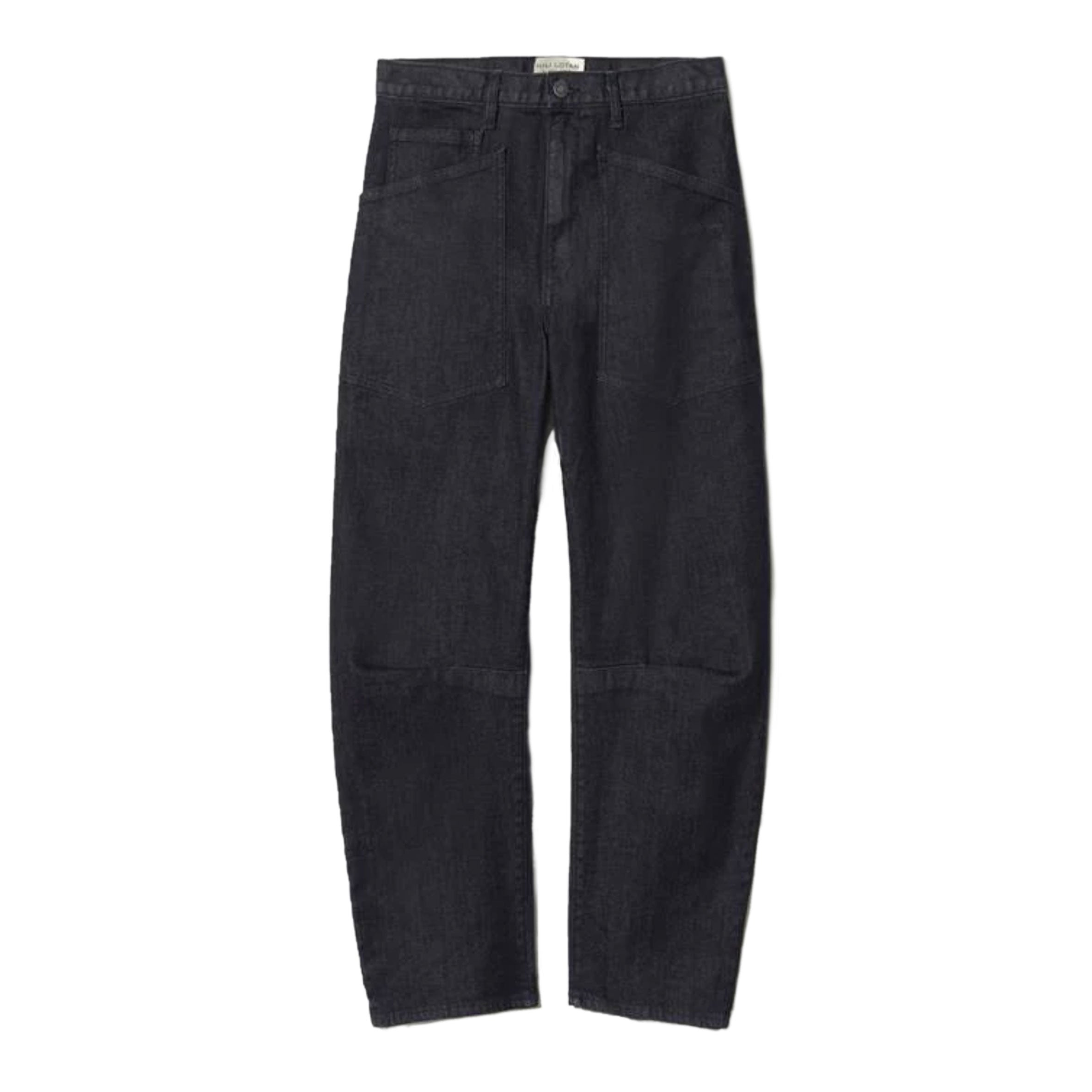 Mid-rise, relaxed fit barrel leg jean in Japanese stretch denim. Uniquely curved silhouette. Seam detail at knees. Gusset at inseam. Zip fly. Shank closure. Top-stitched front and back patch pockets. Belt loops.