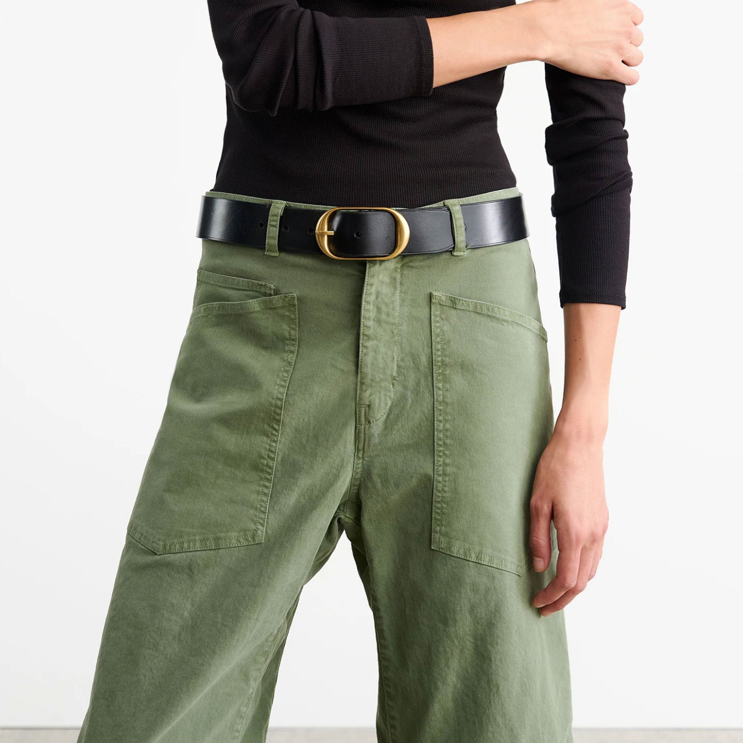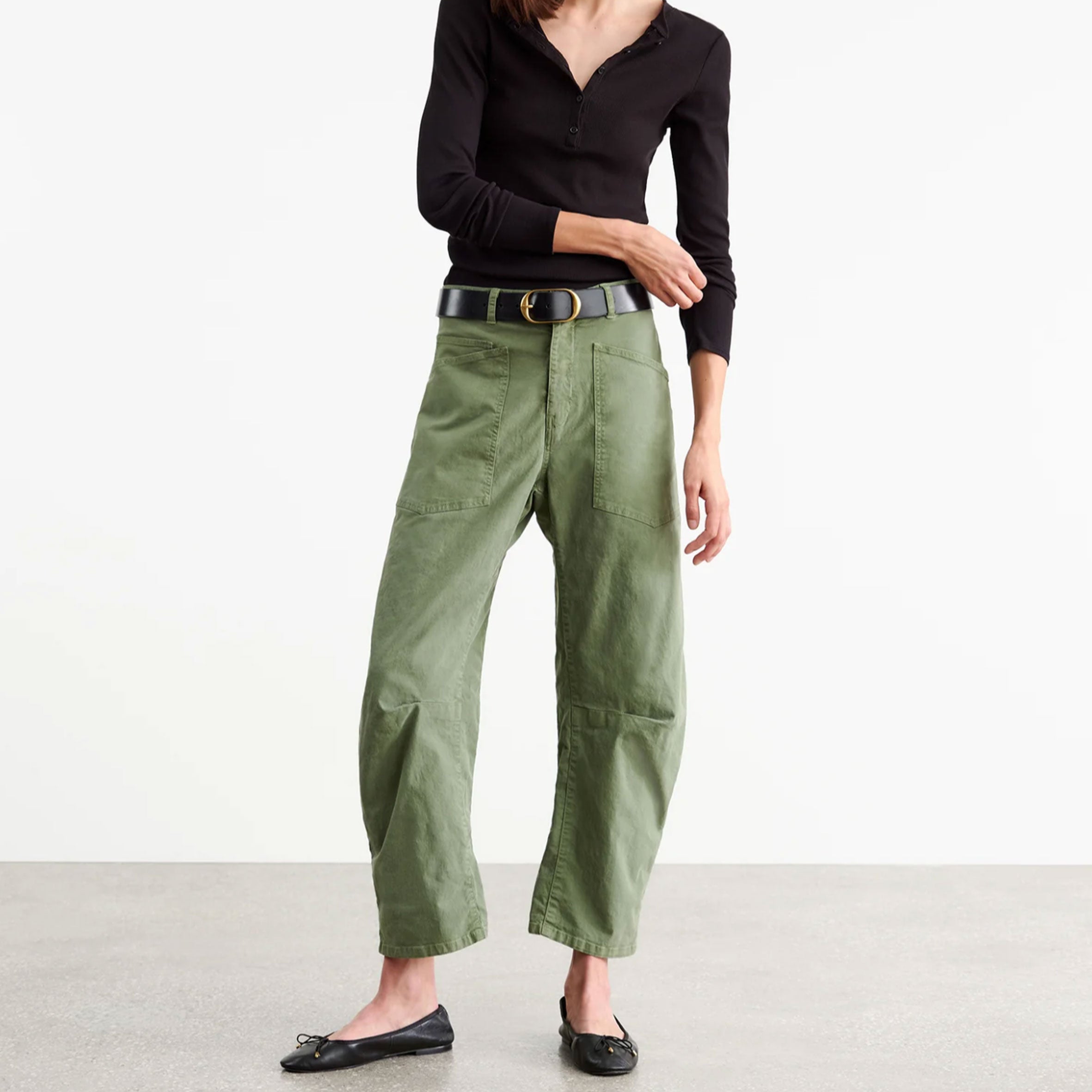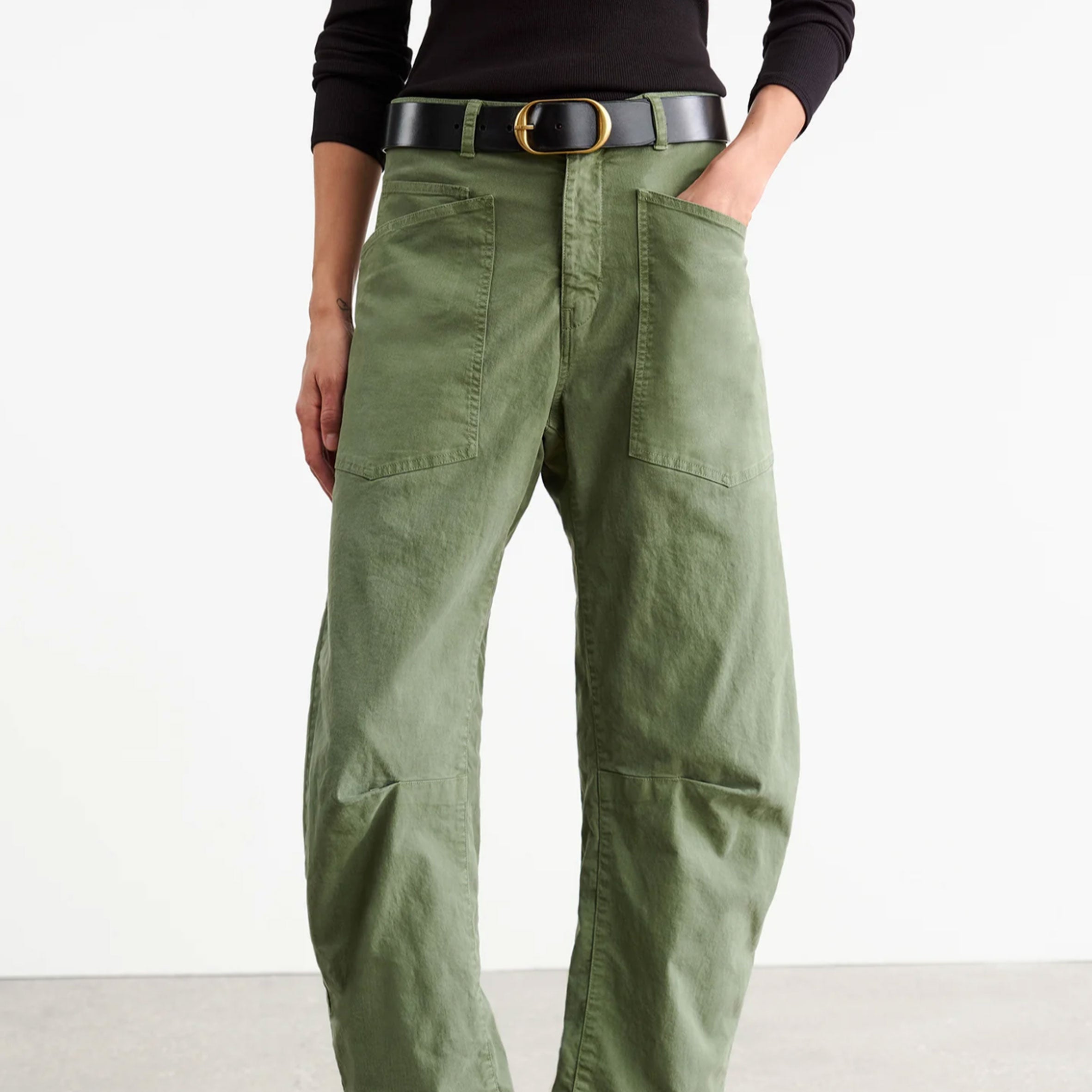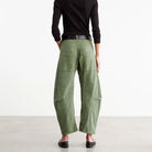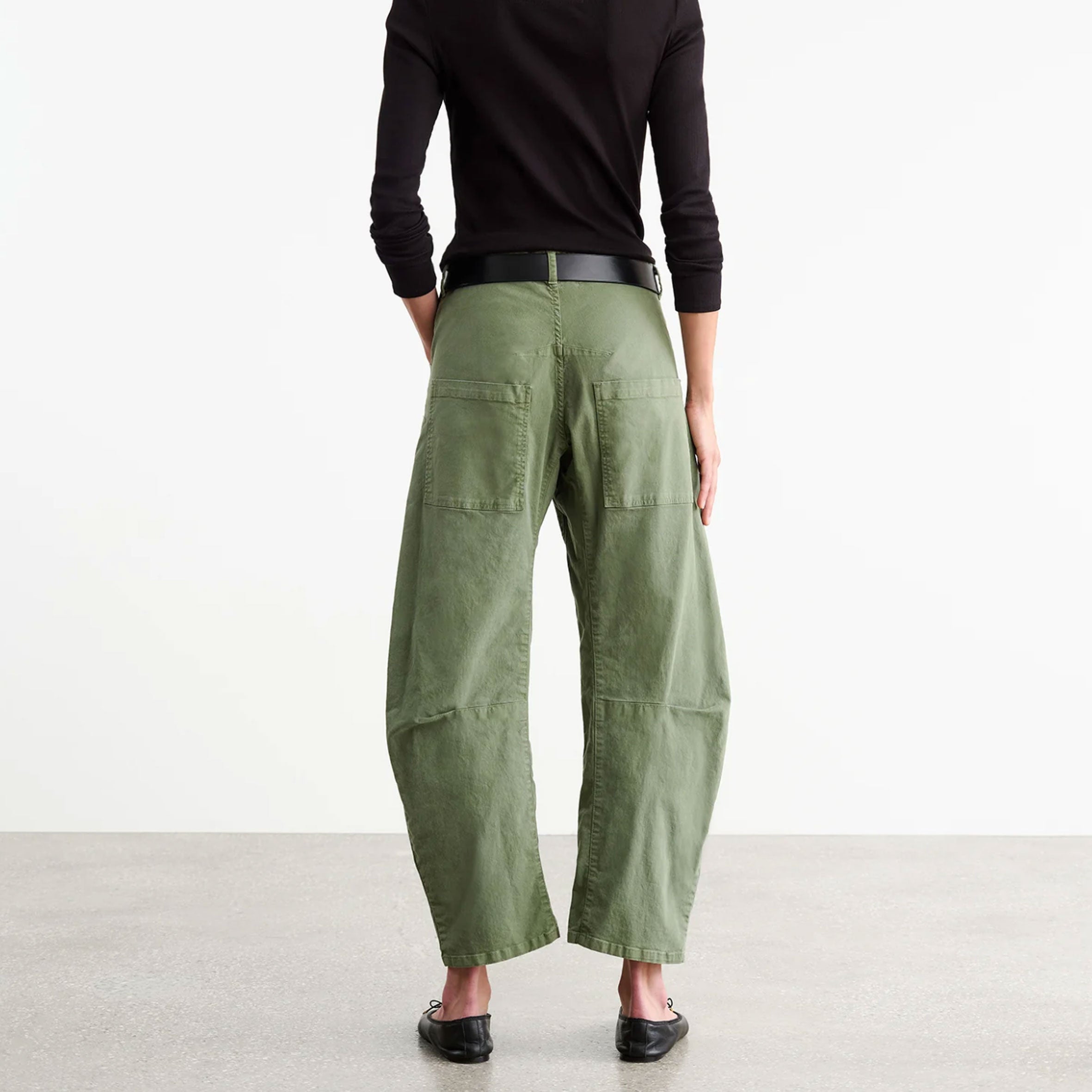 Mid-rise, relaxed fit barrel leg pant. Uniquely curved silhouette. Seam detail at knees. Gusset at inseam. Zip fly. Hidden hook-and-bar closure. Hidden stay button closure. Top-stitched front and back patch pockets. Belt loops.