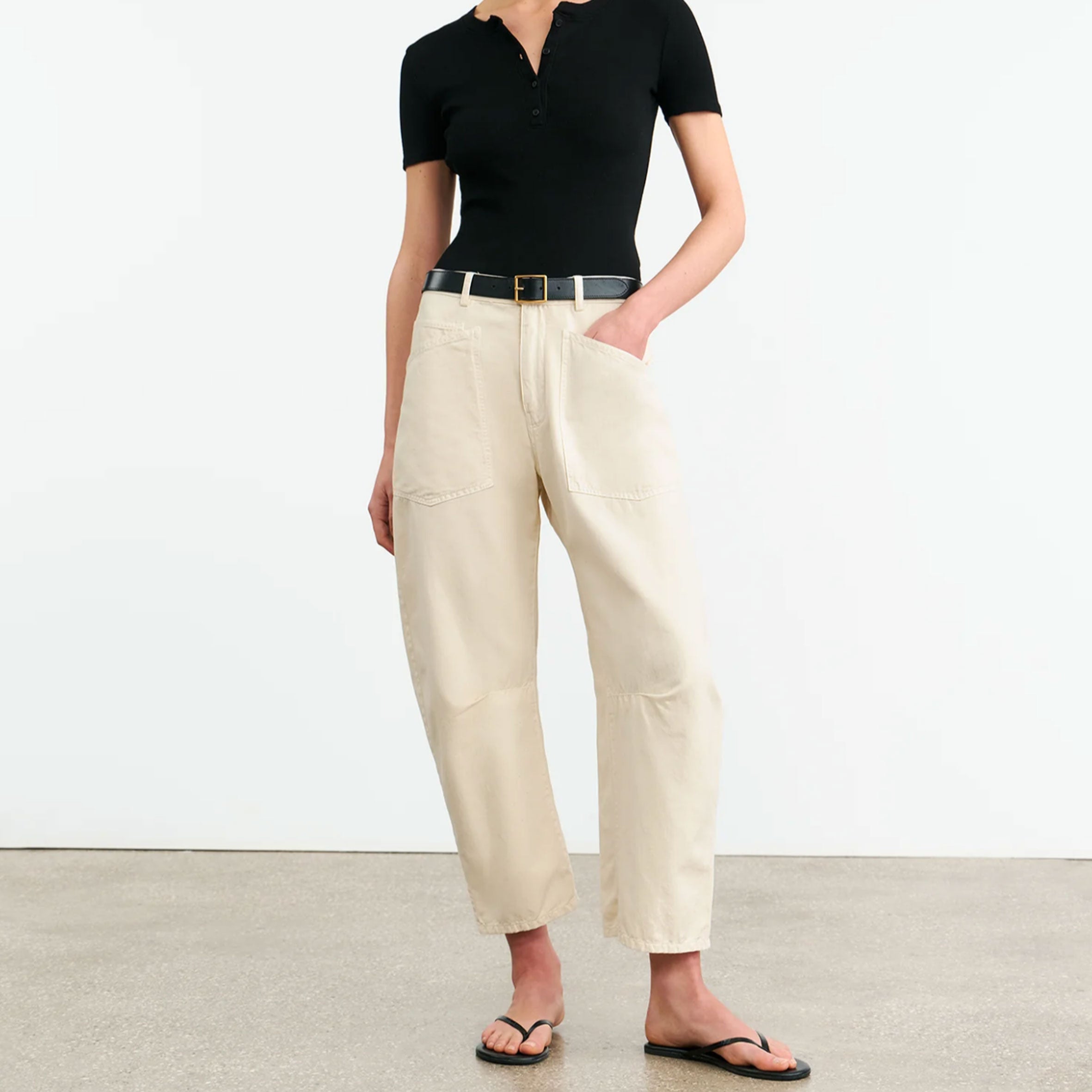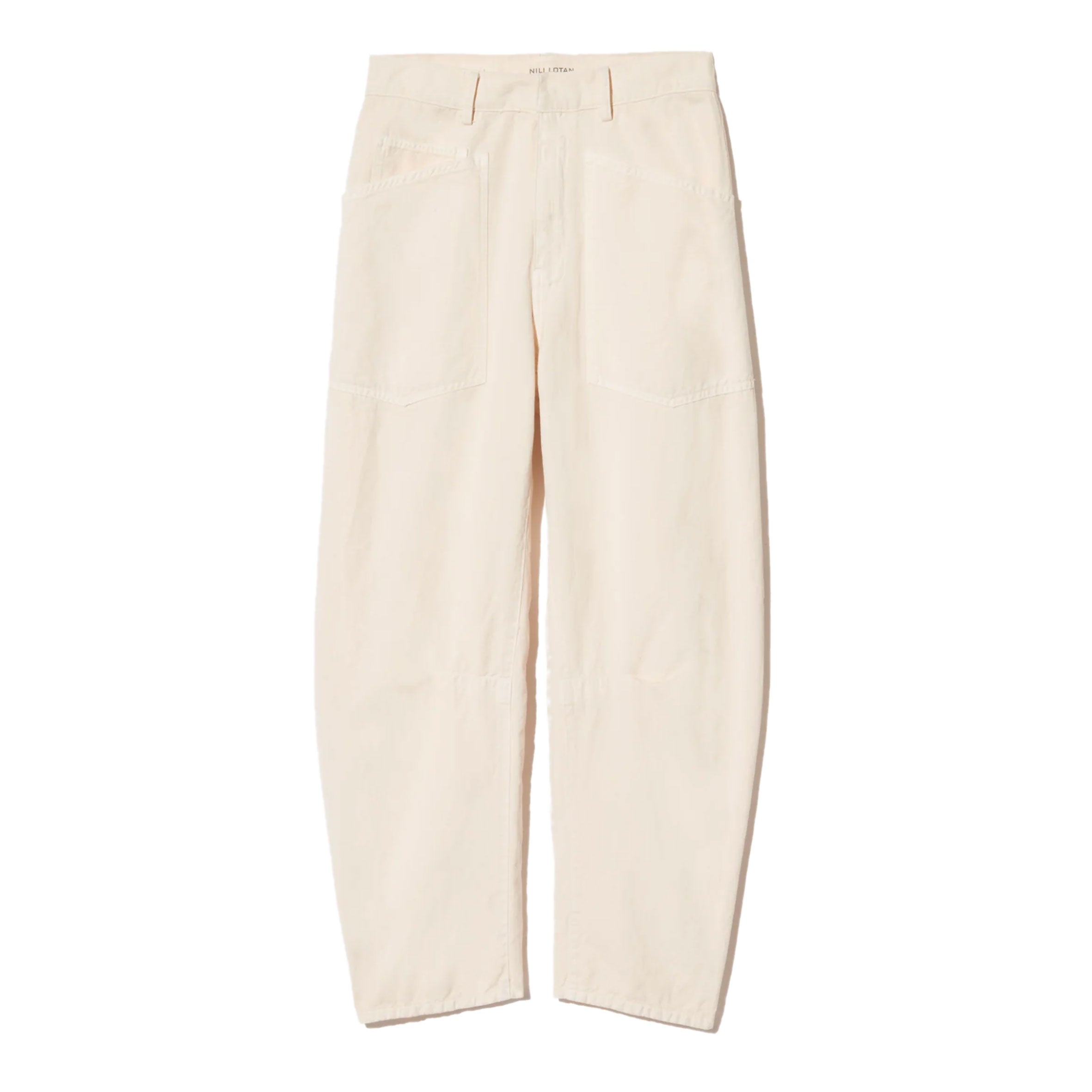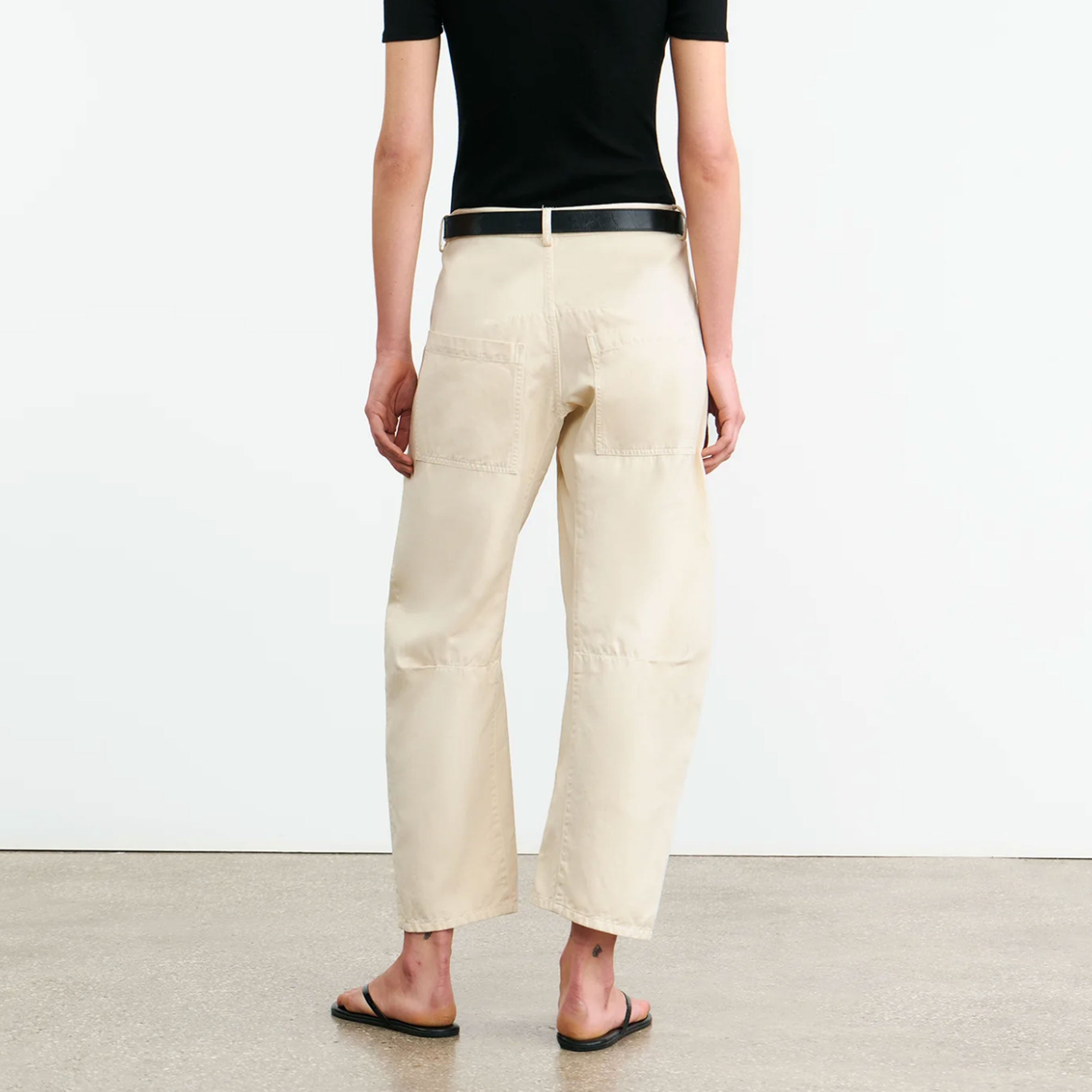 Mid-rise, relaxed fit barrel leg pant. Uniquely curved silhouette. Seam detail at knees. Gusset at inseam. Zip fly. Hidden hook-and-bar closure. Hidden stay button closure. Top-stitched front and back patch pockets. Belt loops. The Stone colour has a cool grey undertone whilst the eggshell is a warm white (last photo shows the stone on top of the eggshell).