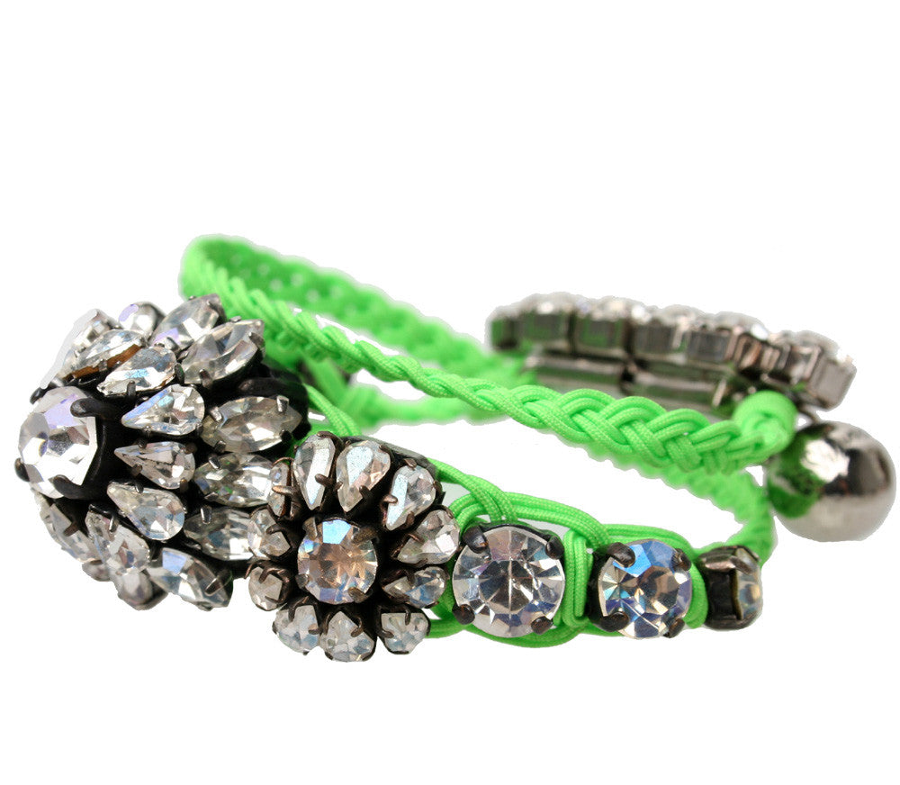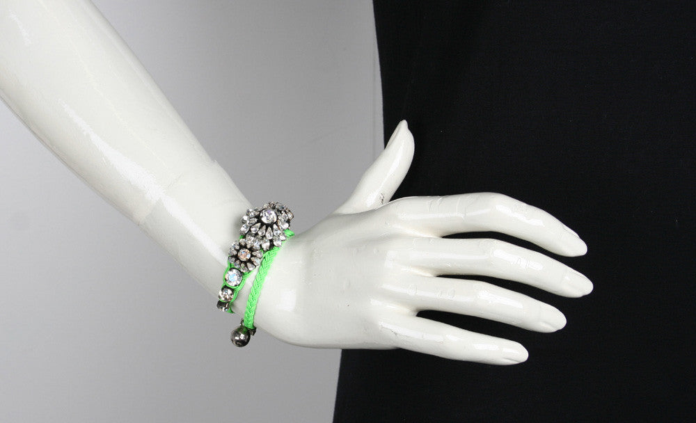 Neon green rope bracelet which wraps around the wrist twice with floral crystal centre design and crystal clasp.