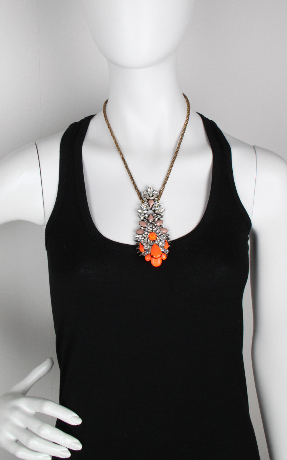 The Leitmotiv Zambia pendant necklaceby Shourouk features a large floral motif embroidered with a mix of clear crystals, neon-orange and pale-pink hand painted enameled crystals. Brass chain withlobster claw fastening and logo engraved silver ball charm.