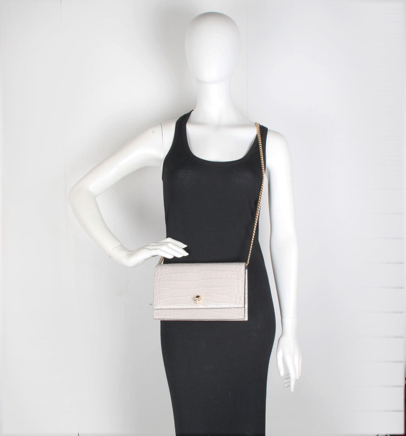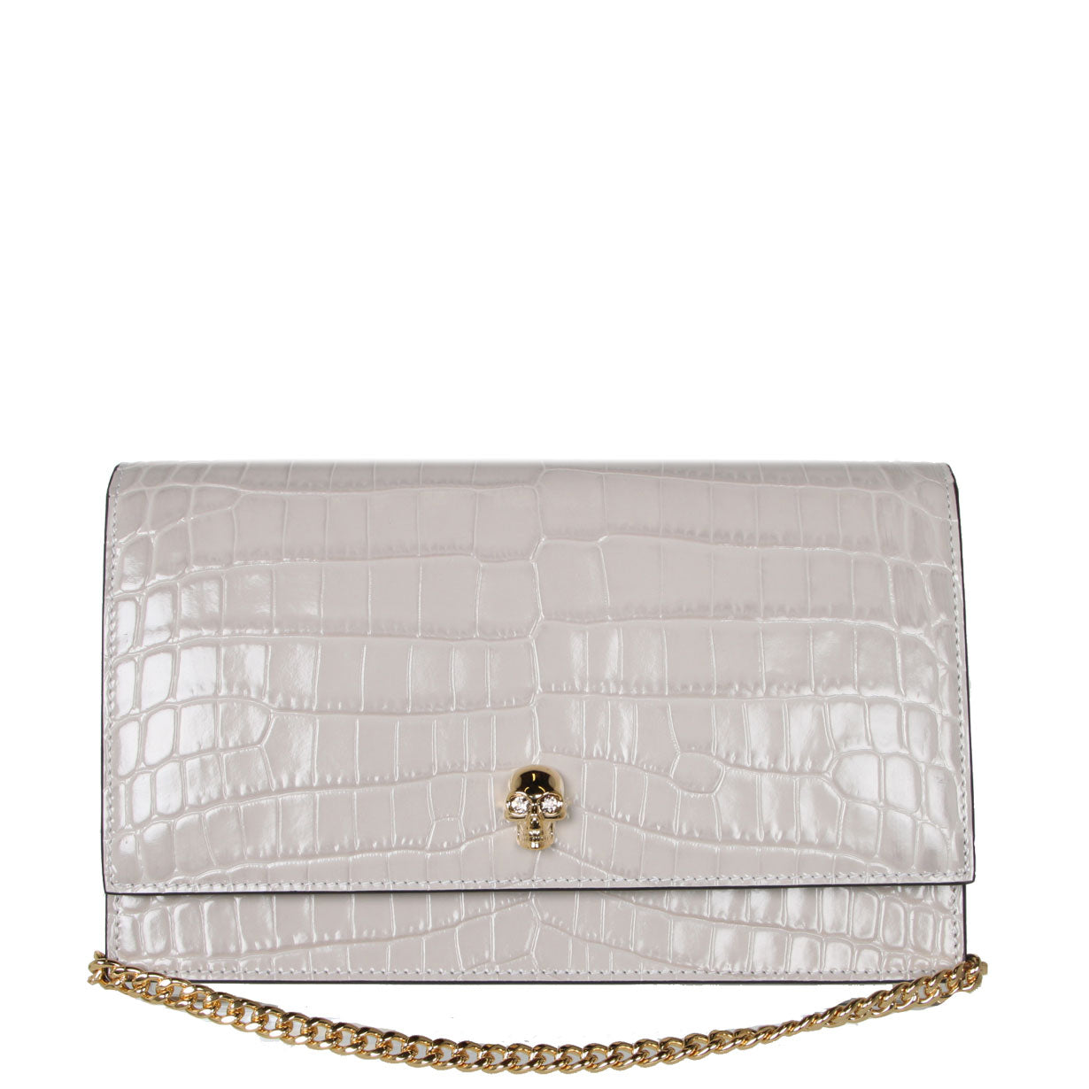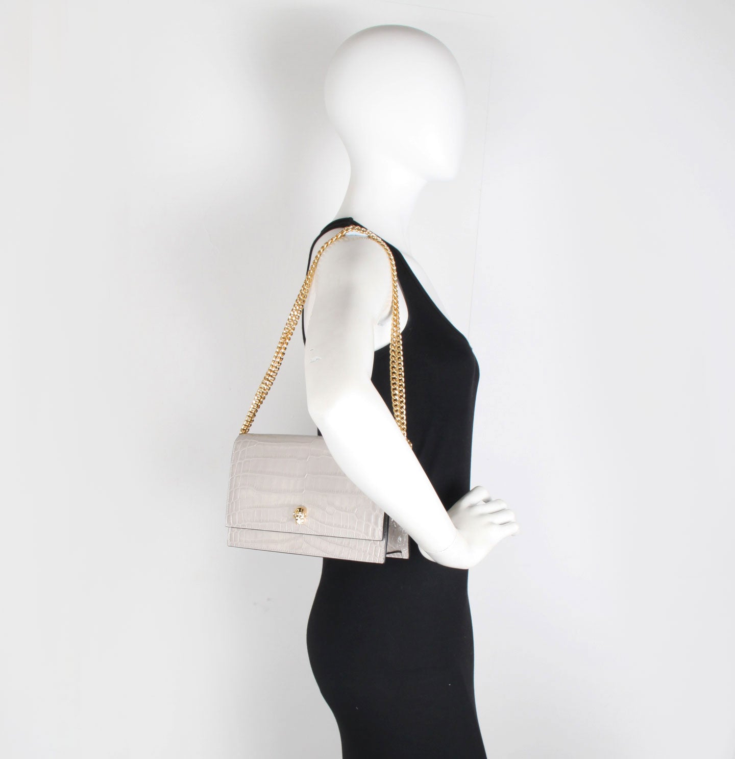 Alexander McQueen grey shiny croc-effect leather Medium Skull bag with a gold finished skull and chain strap. This bag features one central compartment, one card pocket and snap button closure. Accomodates smartphones.