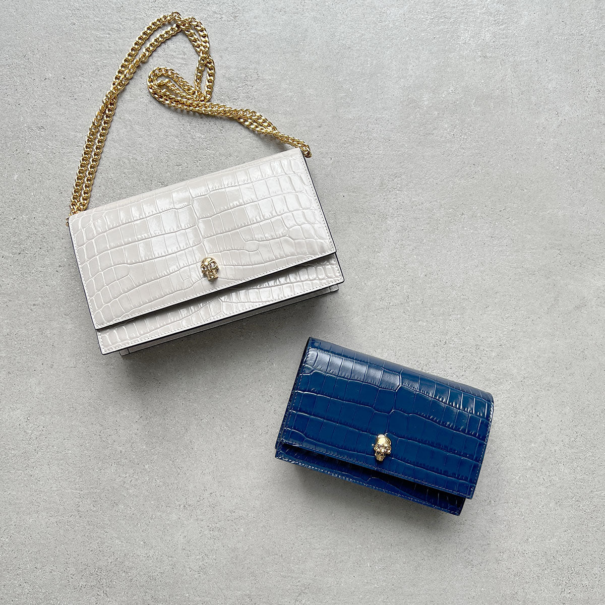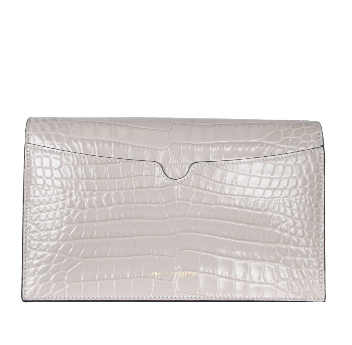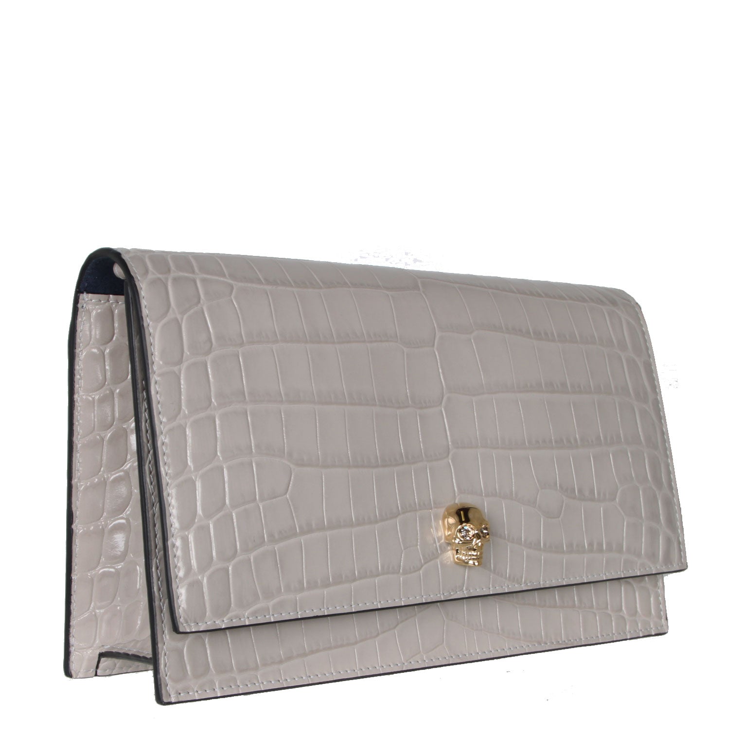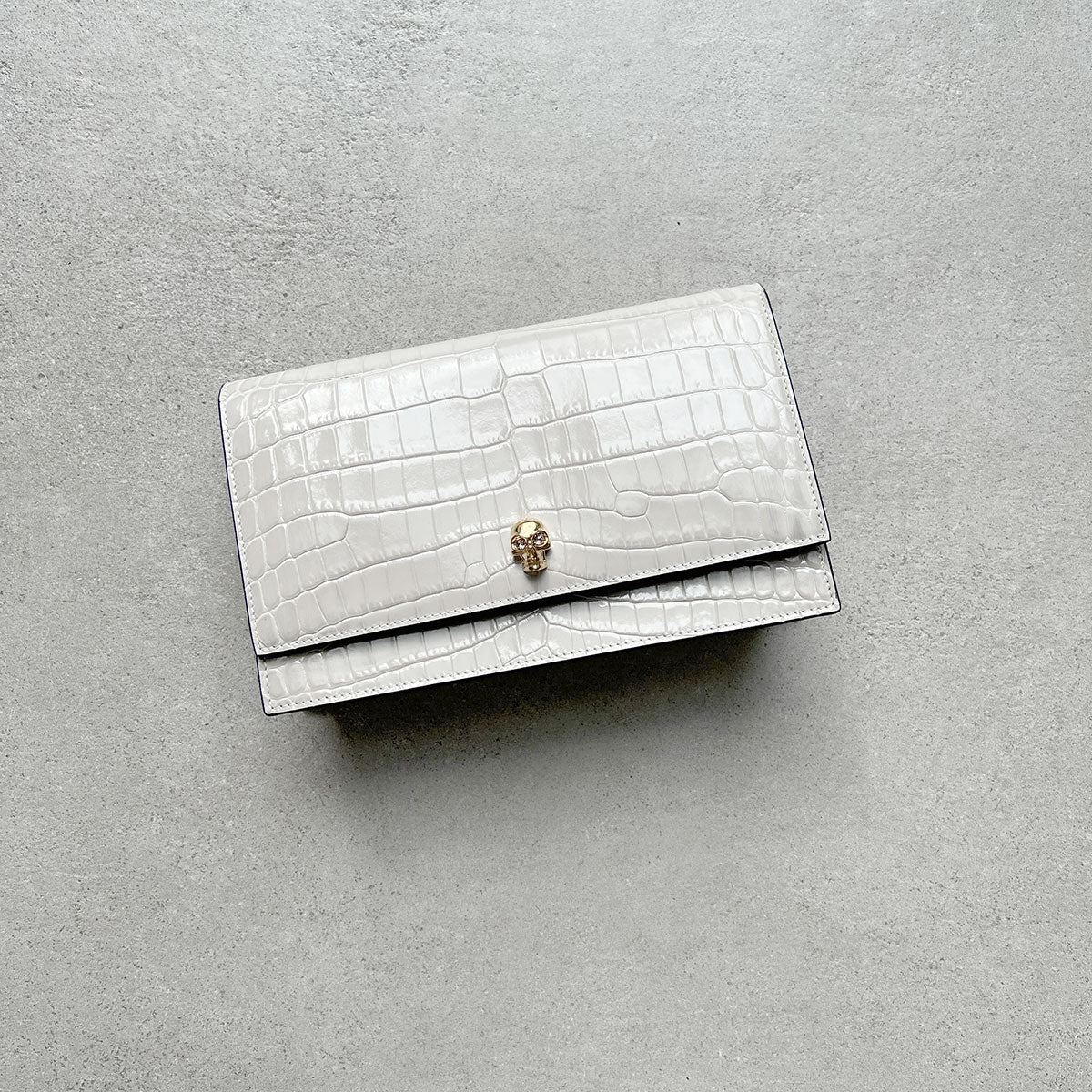 Alexander McQueen grey shiny croc-effect leather Medium Skull bag with a gold finished skull and chain strap. This bag features one central compartment, one card pocket and snap button closure. Accomodates smartphones.