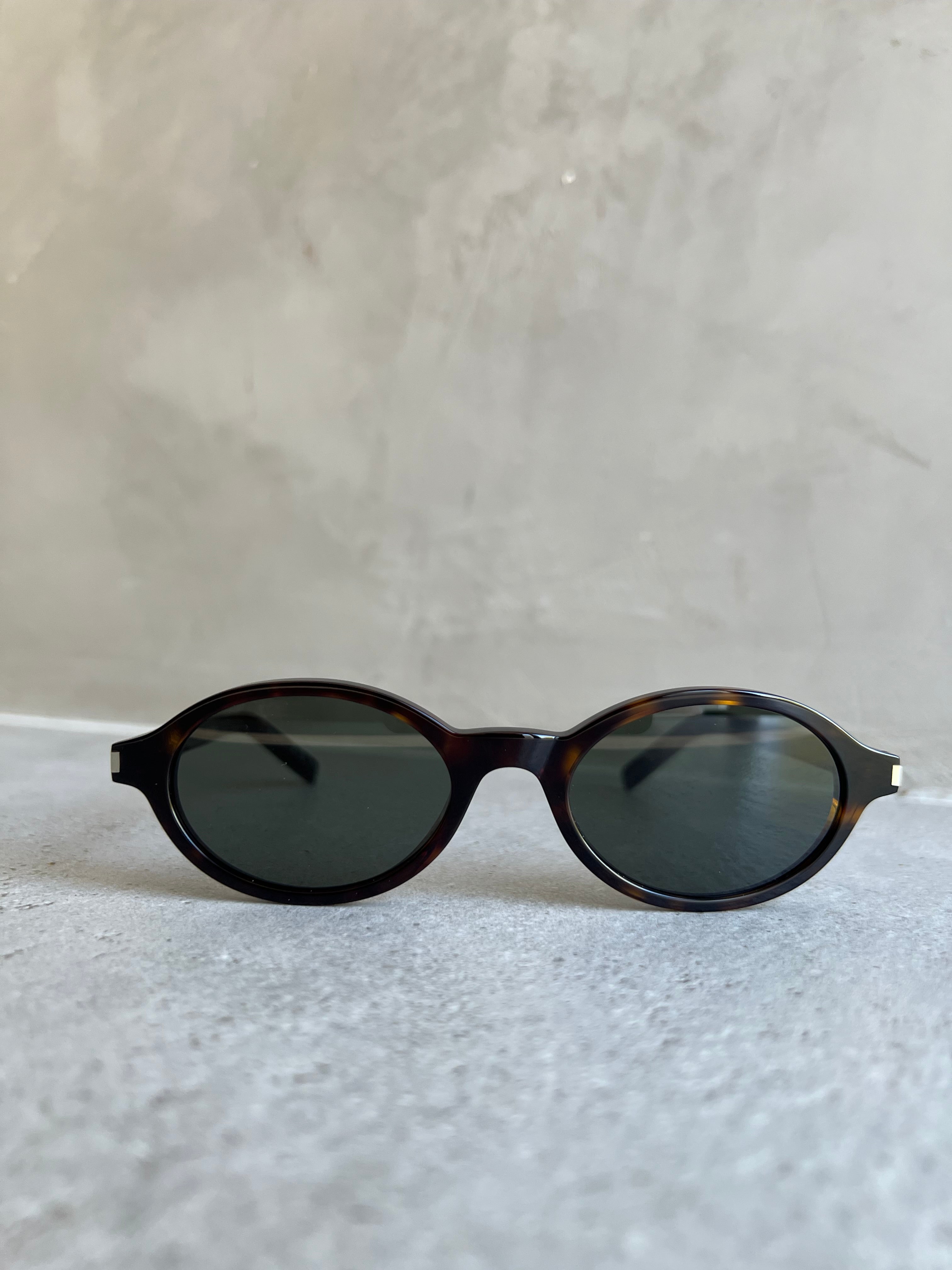Sunglasses with a narrow elongated cat-eye frames in acetate with nylon lenses.