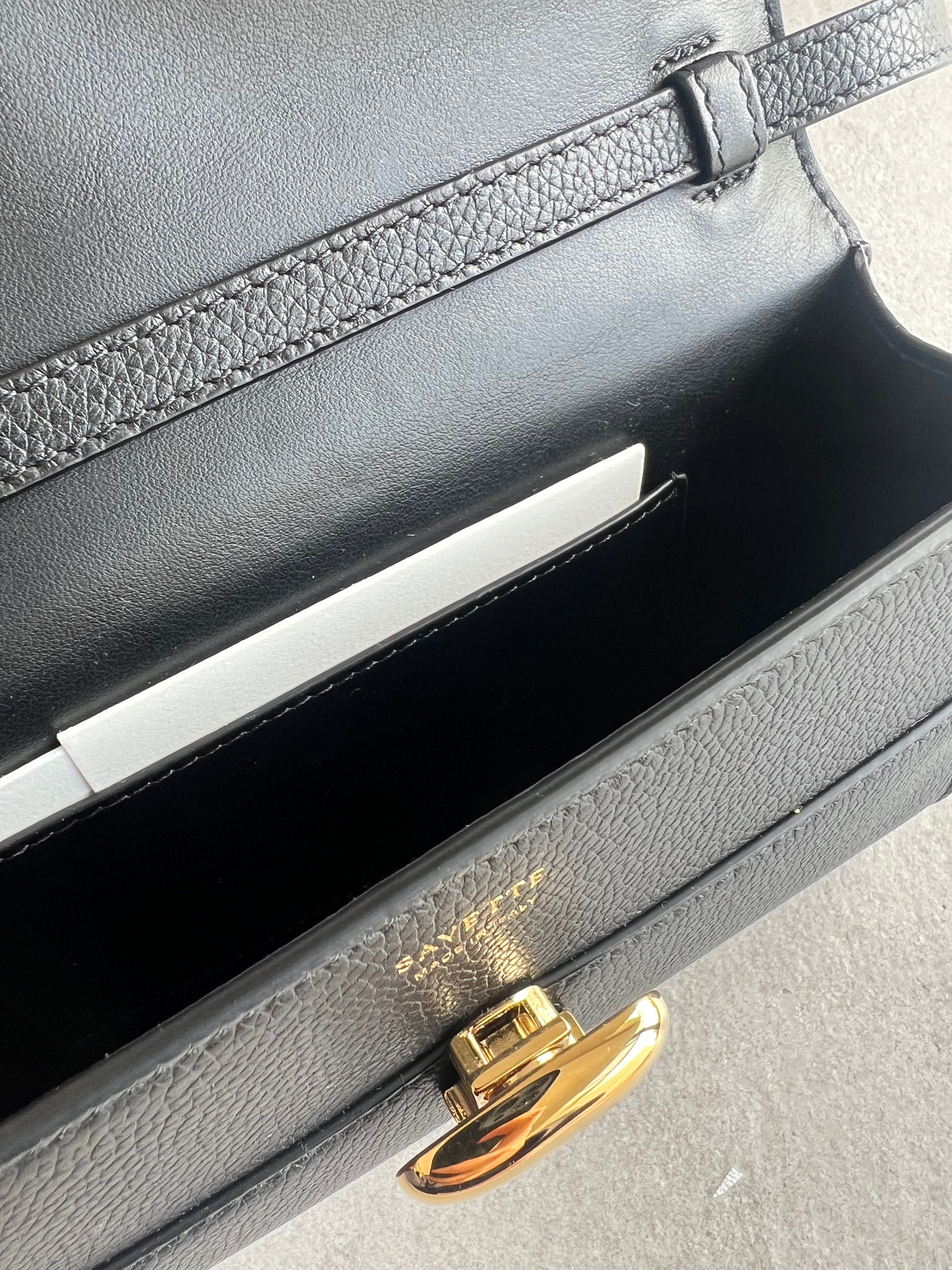 It features our signature Symmetry turnlock, one interior pocket, and a leather handle.
