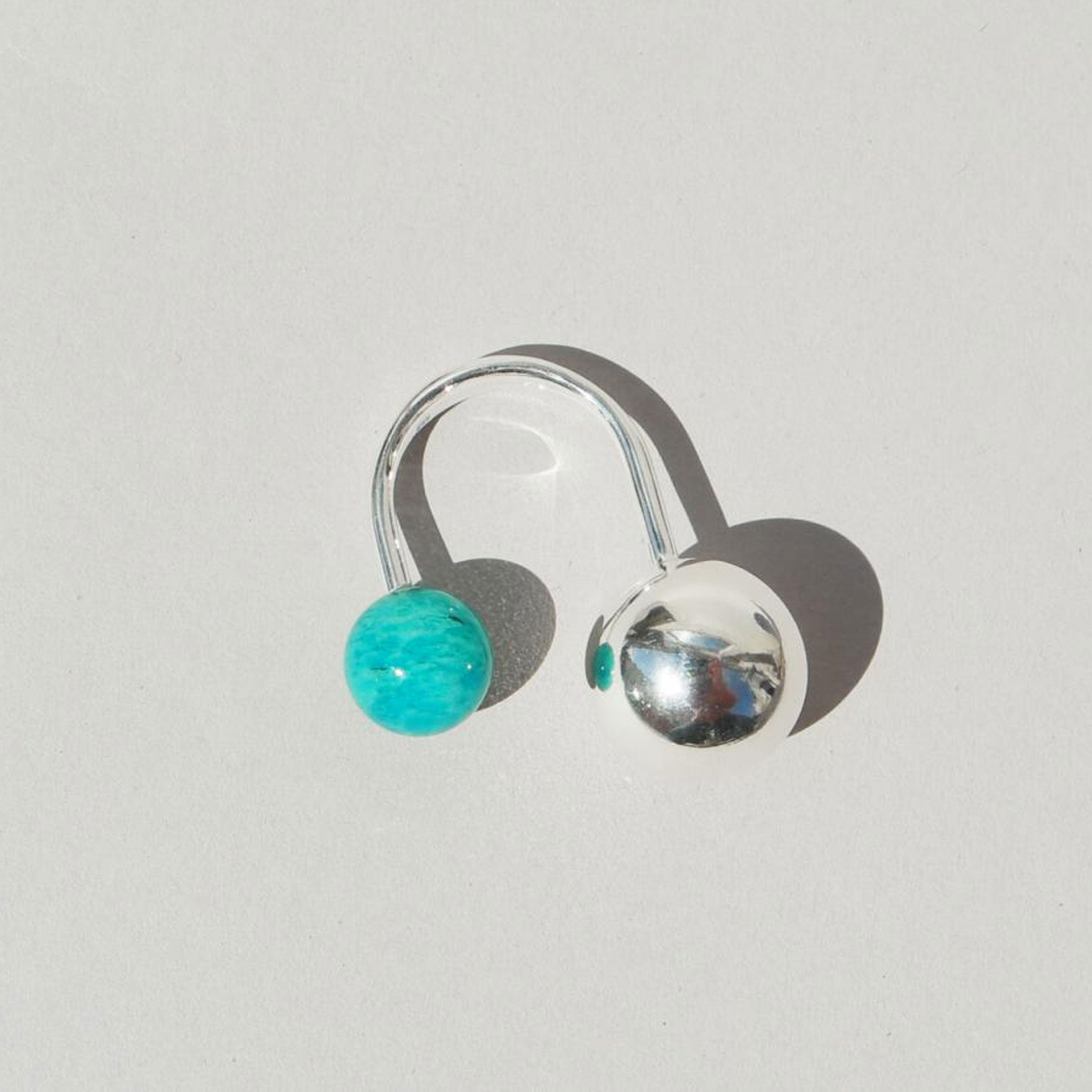 An open ring with two spheres, one of them in semi precious amazonite and the other made out of recycled 925 sterling silver. The model wears amazonite & turquoise.