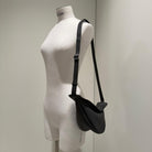 Small Slouchy Banana Bag. Curved crossbody bag in grained calfskin leather with adjustable strap and zipper closure.