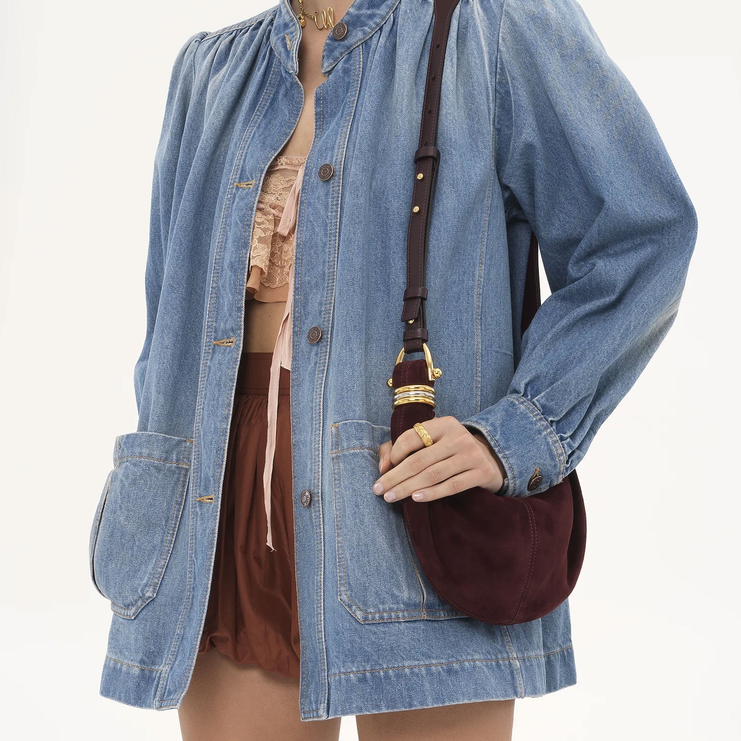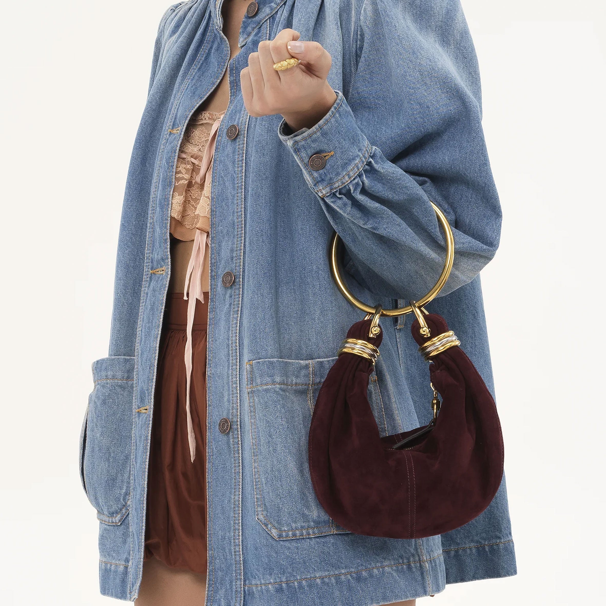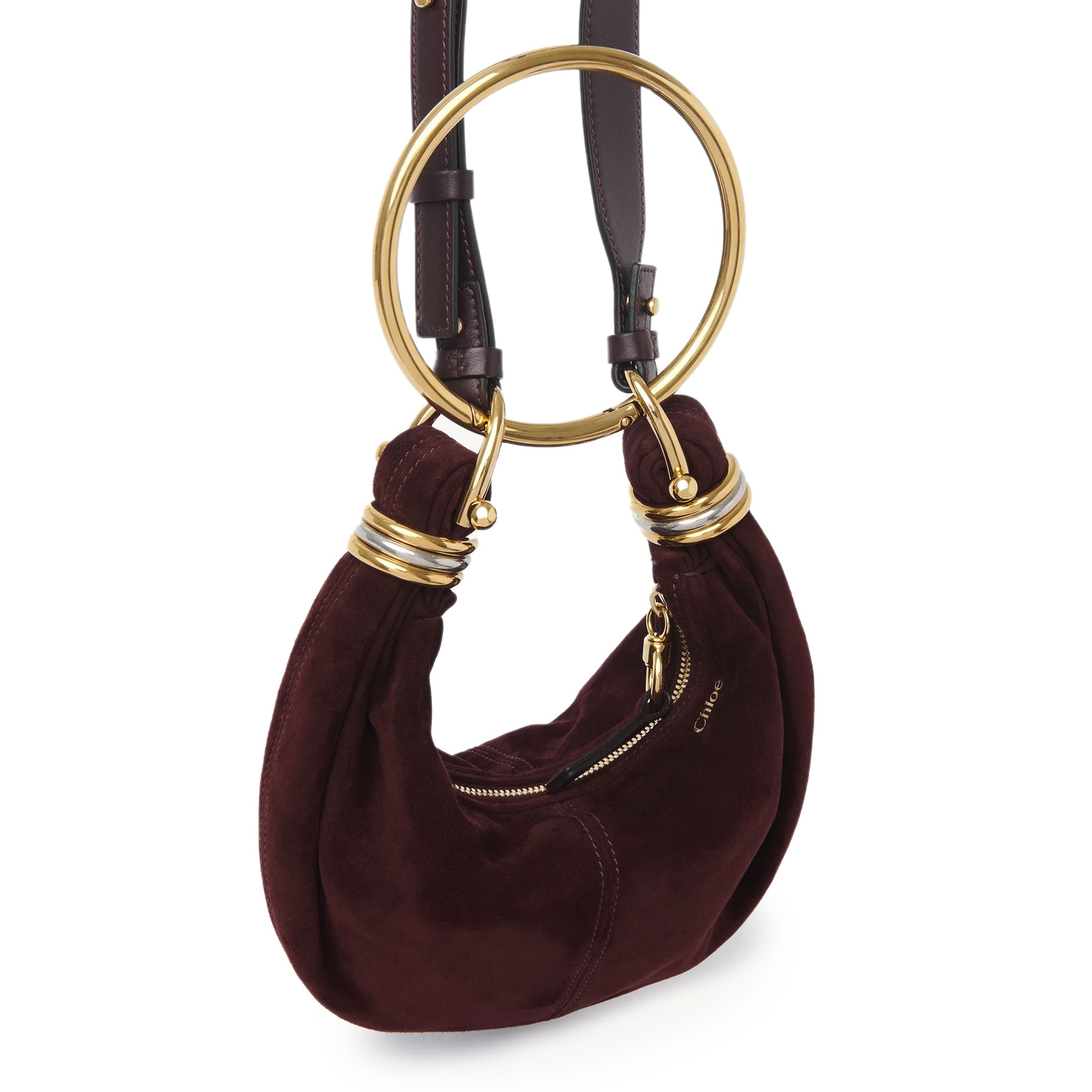 Inspired by the Maison's Archives, this mini Bracelet Hobo bag is crafted from suede lambskin. The supple, rounded shape is elevated by a bracelet handle and stacked bi-color rings at the ends.