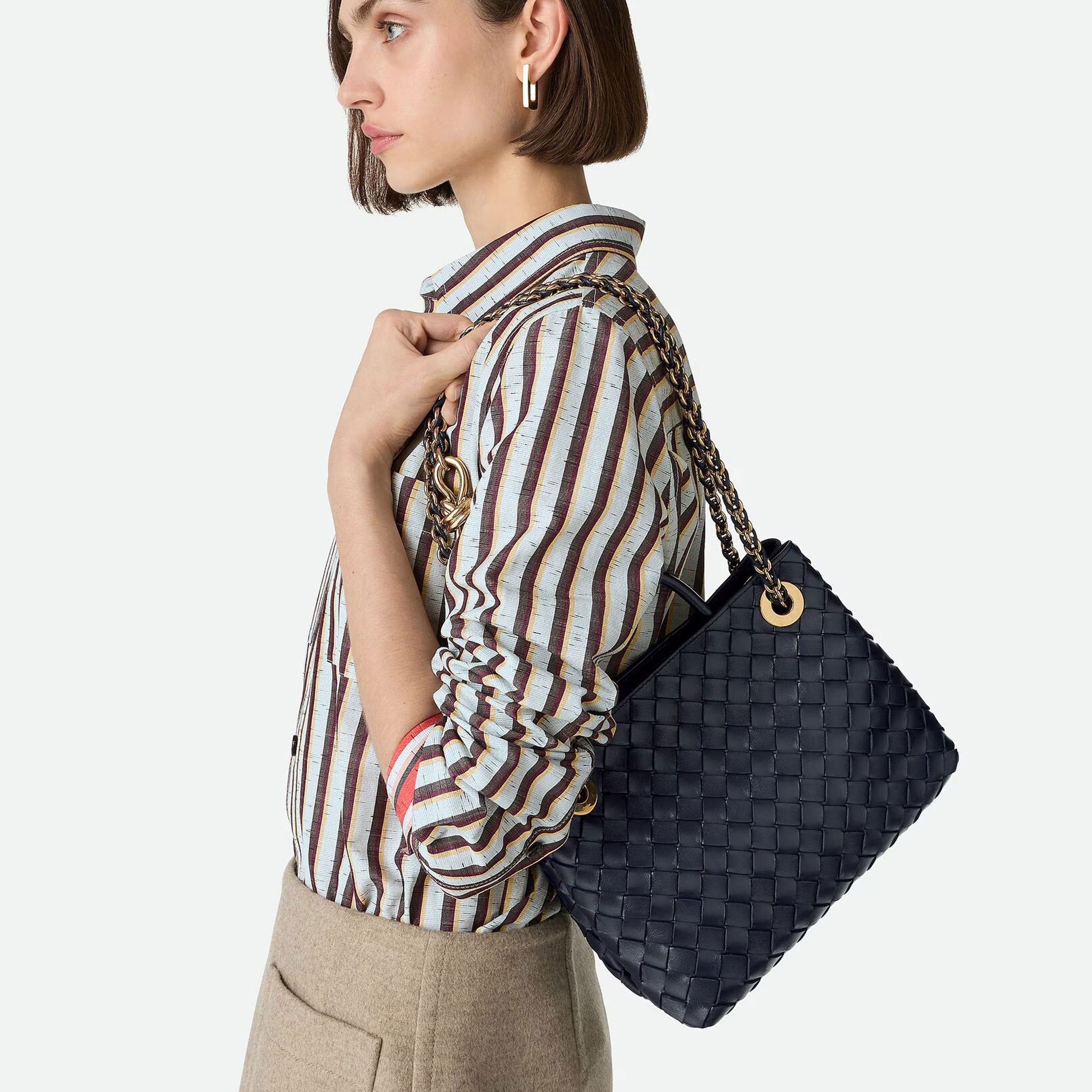 Andiamo is a new expression of the signature Intrecciato weave realised by the expert craftsmanship of artisans in the house’s atelier. Its name, Andiamo, “Let’s go” in Italian, embodies the spirit of the bag, a tribute to going places and the concept of craft in motion. The bag features a timeless Intrecciato silhouette woven by hand. A metal knot adorns and fastens its sliding braided straps, allowing it to be adjusted over the shoulder or across the body, giving the bag a soft tapered volume. This version also features a tubular