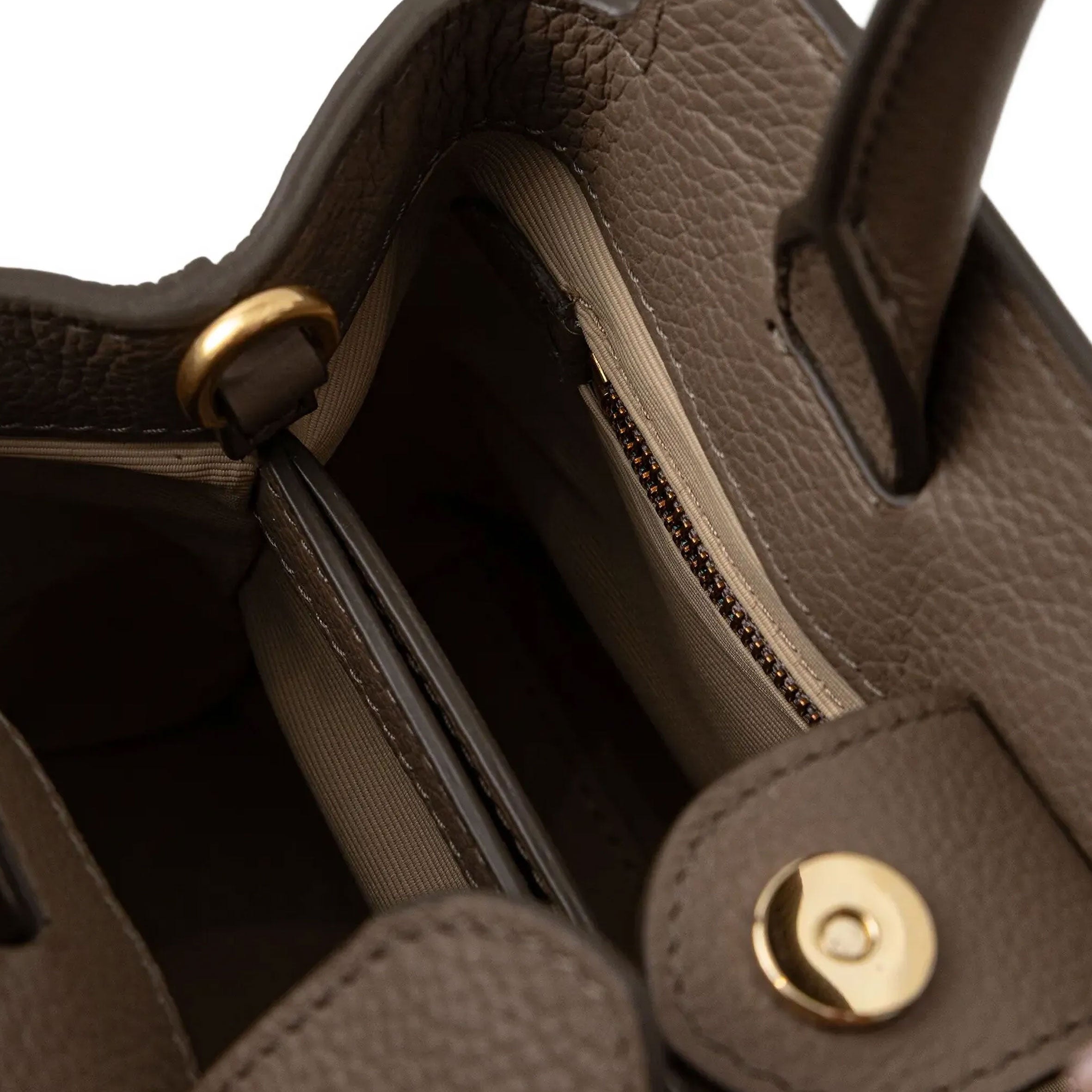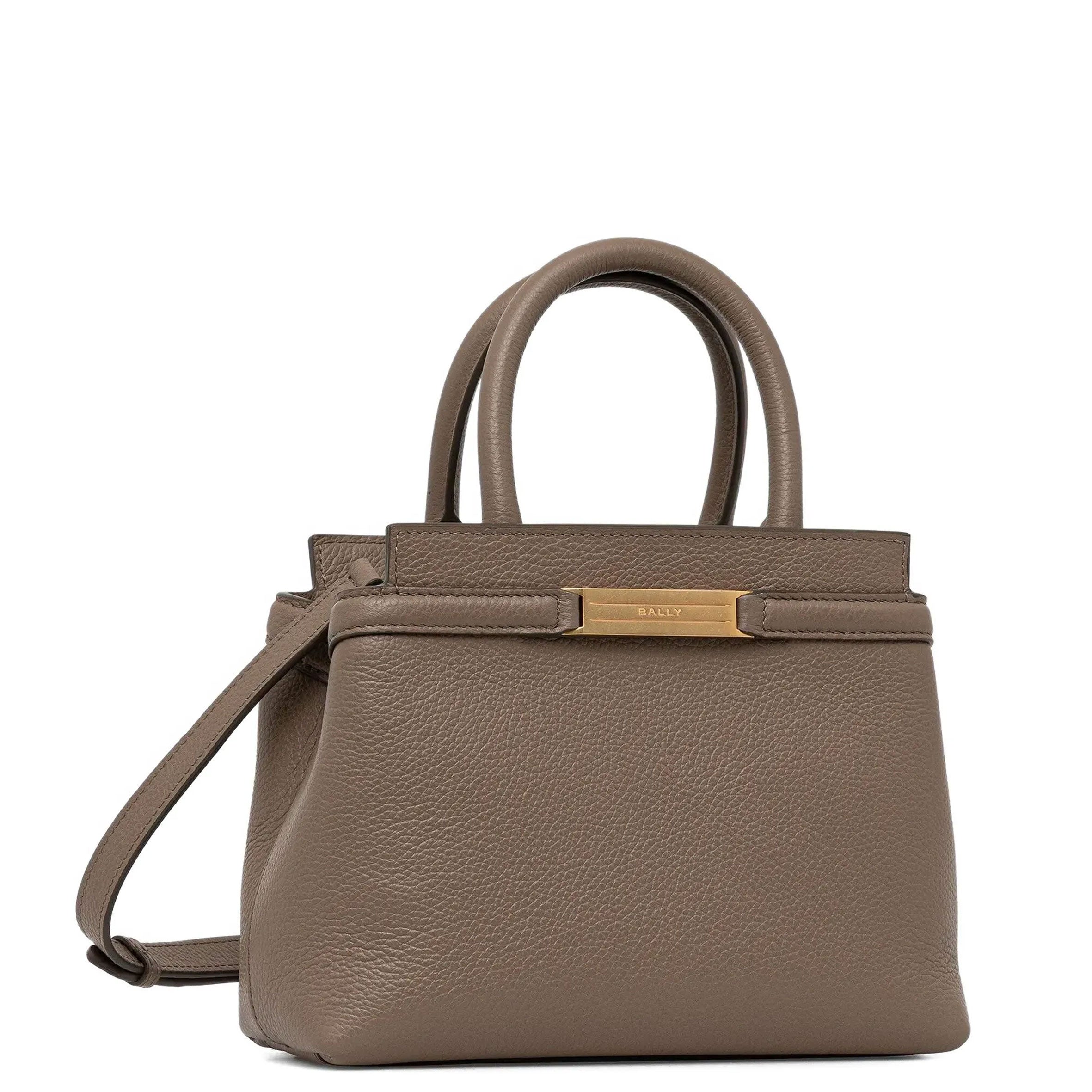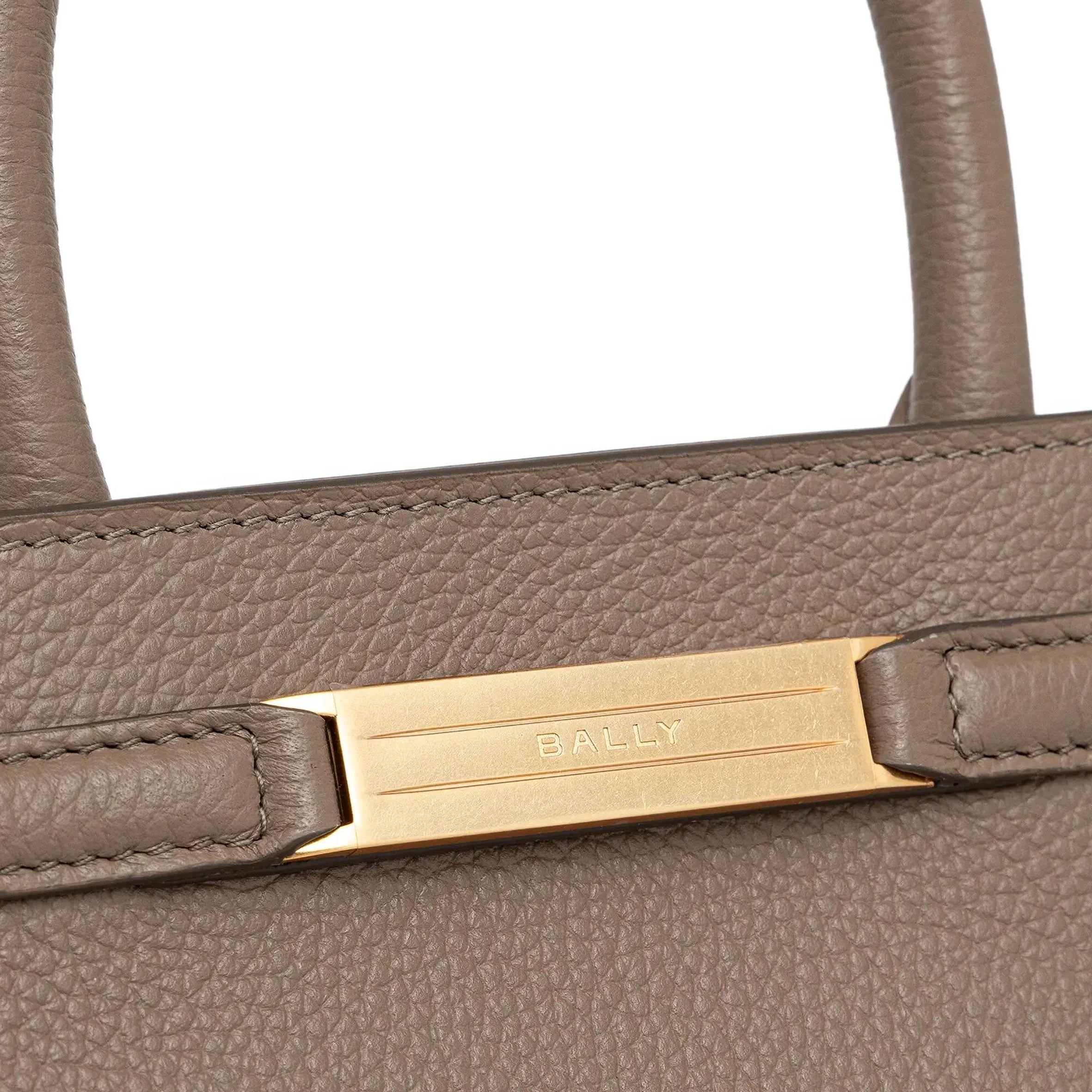 This small Deco tote bag in supple sepia calfskin is trimmed by a metal plaque, a simple signifier that recalls the Bally Ribbon. Top handles and a removable shoulder strap offer multiple carry options.