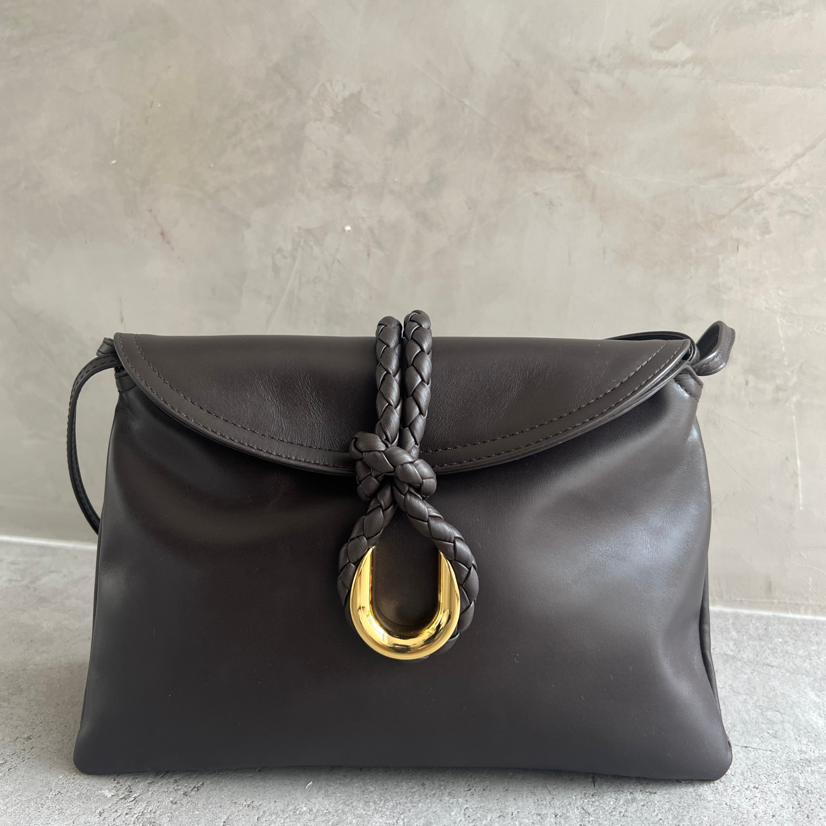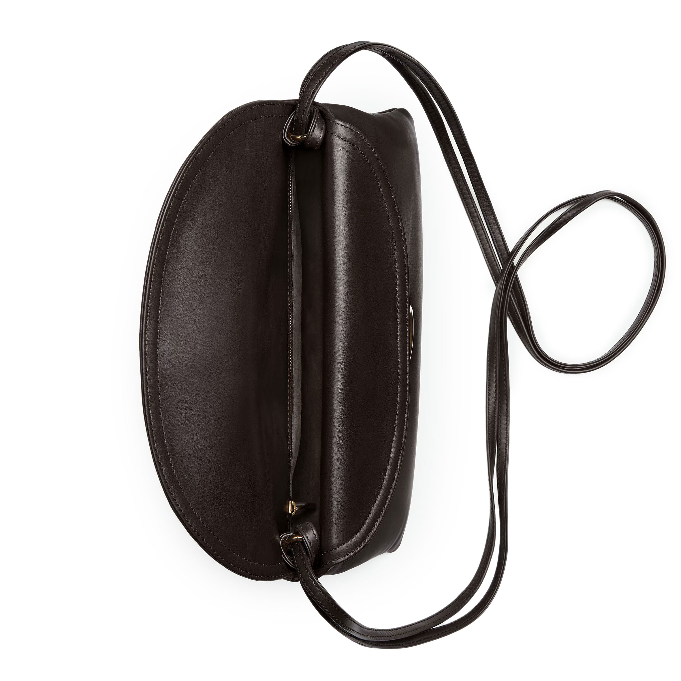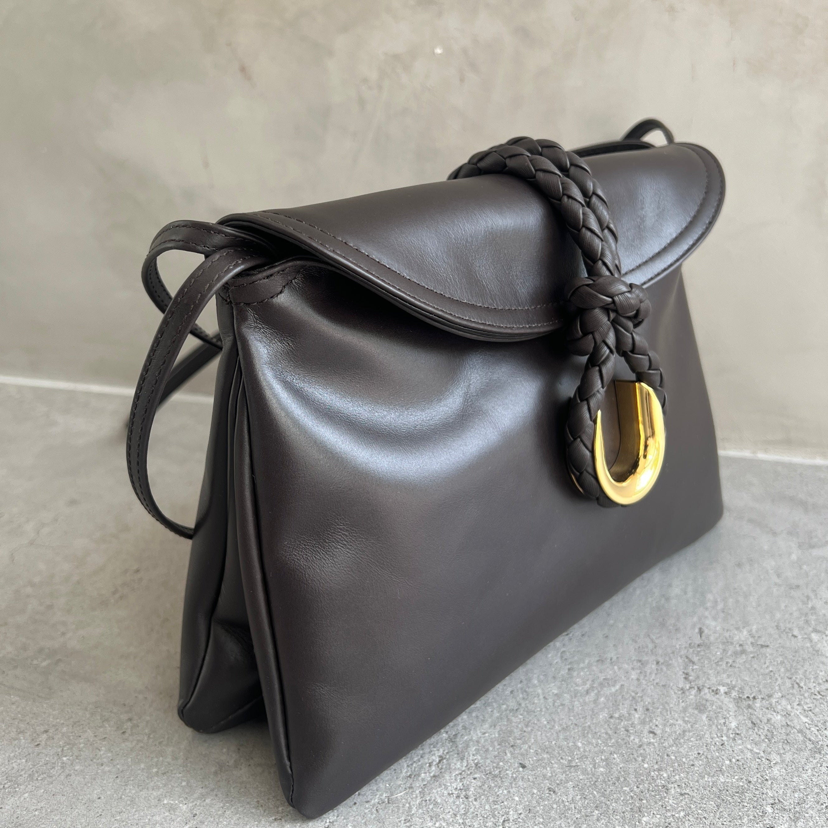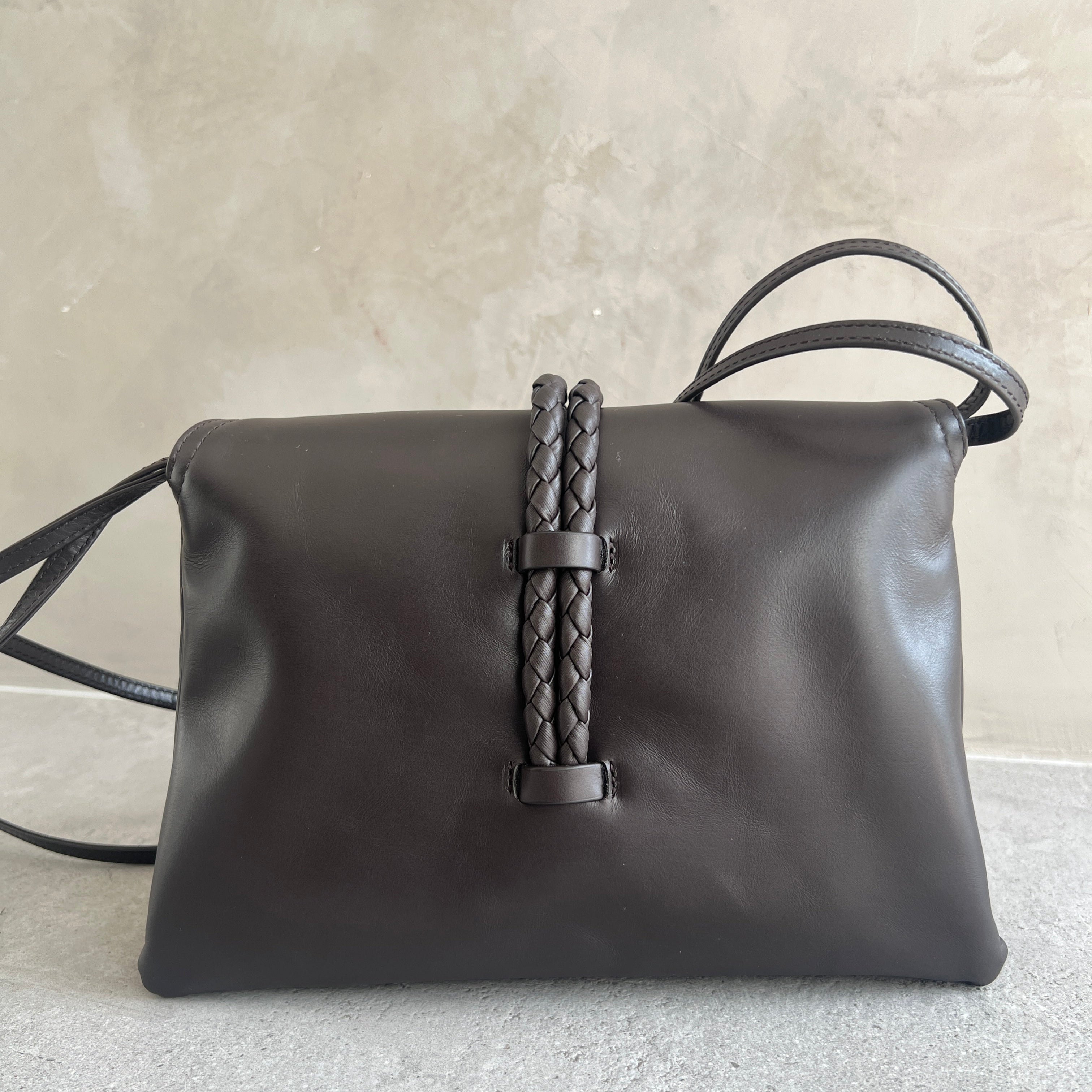 Cross-body bag in smooth calf leather with double flap. Fastened with a sculptural metal closure and leather coaxial cord.