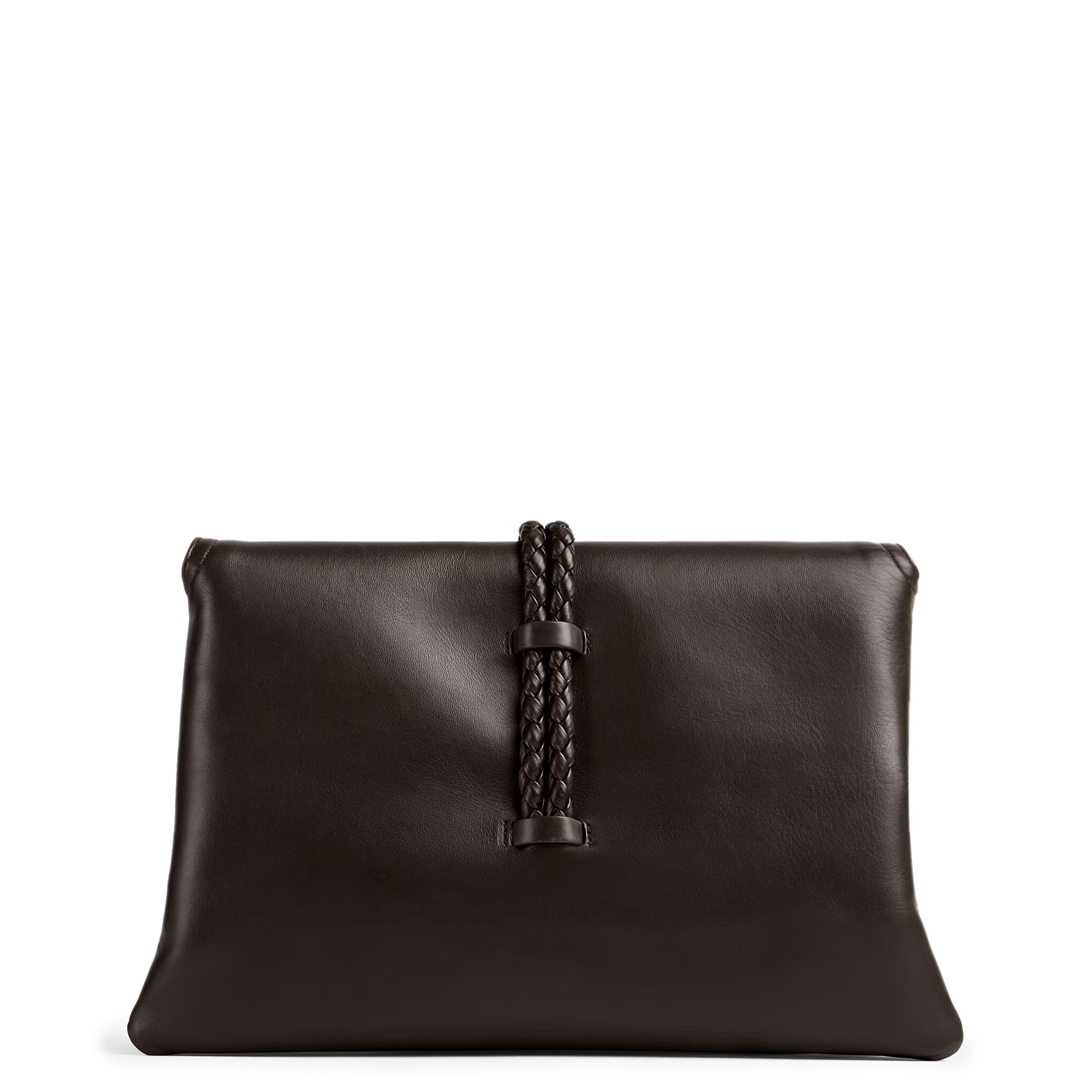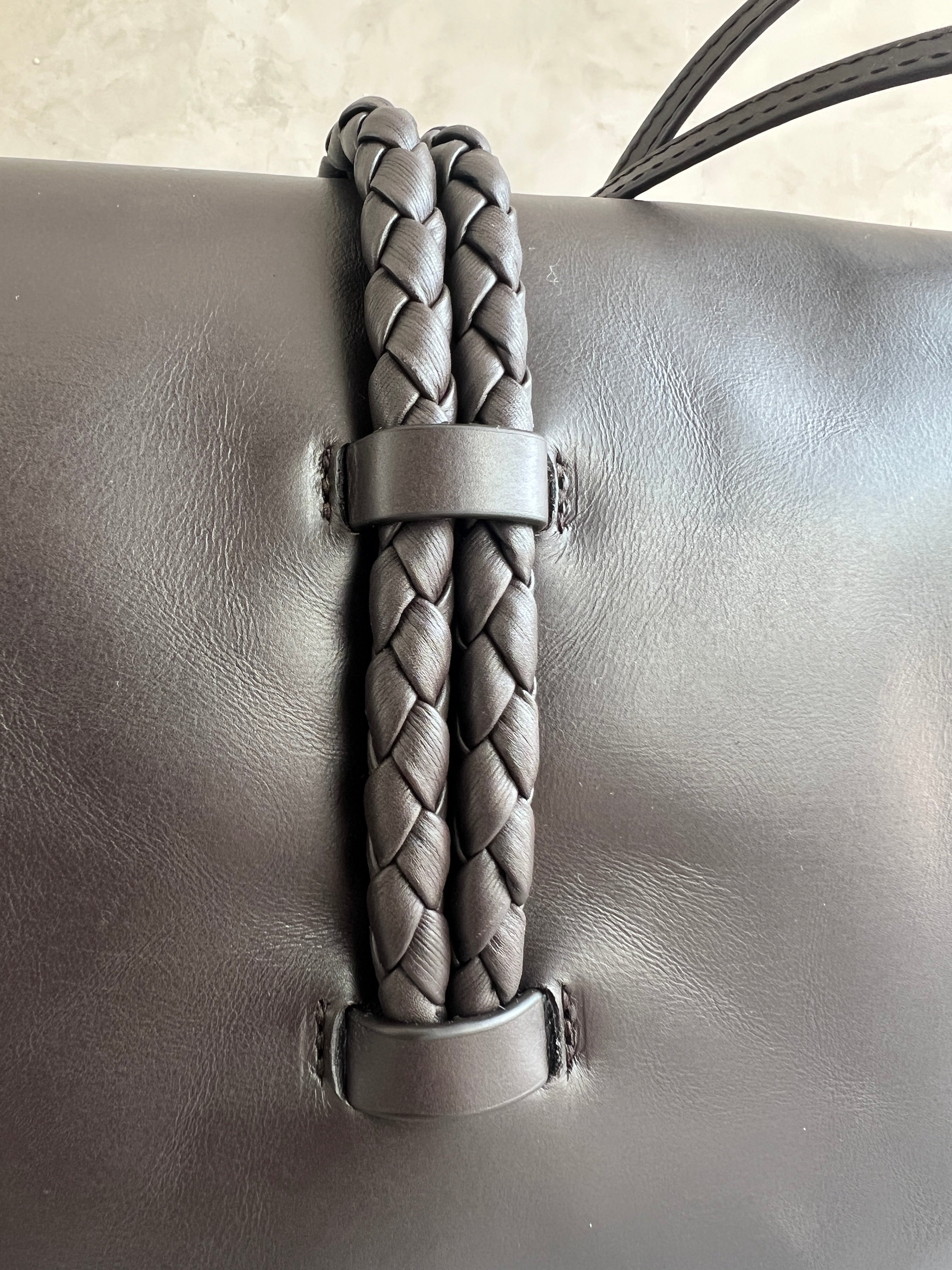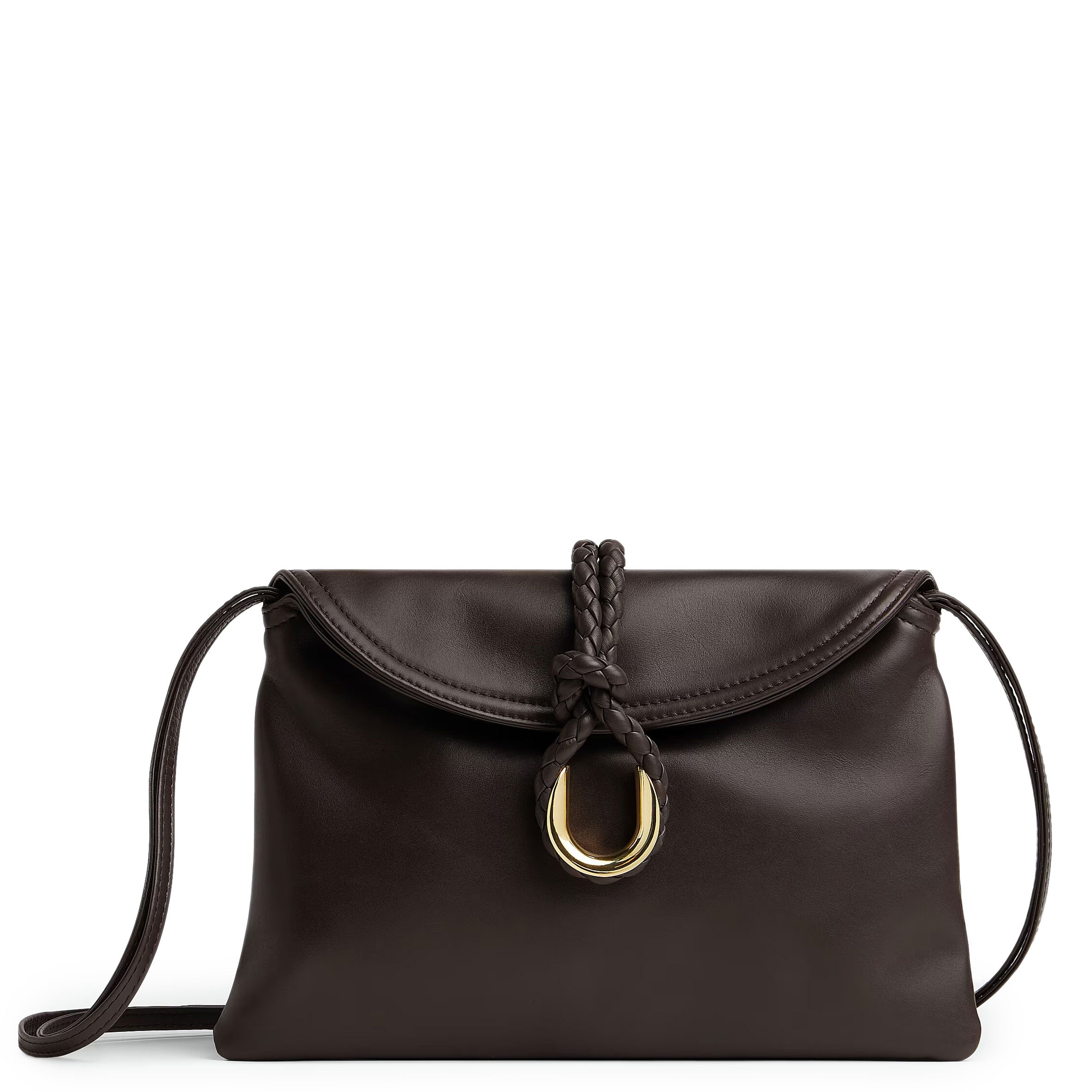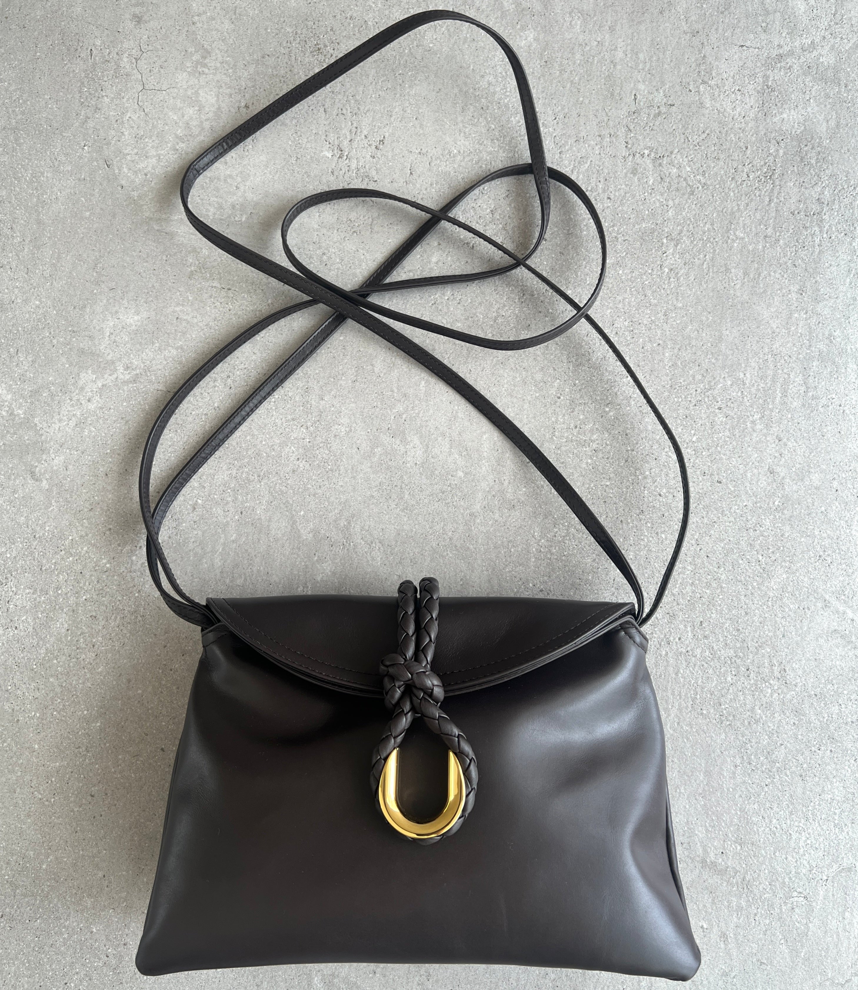 Cross-body bag in smooth calf leather with double flap. Fastened with a sculptural metal closure and leather coaxial cord.