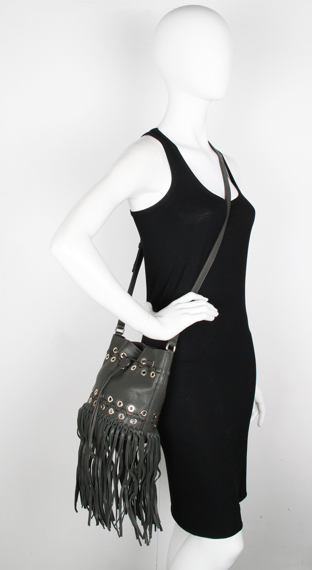 Invest in this seasons hottest fringe design with Sonia Rykiel's cross body bucket bag. Featuring a washed leather finish; light gold eyelets; cotton twill lining; and small interior pouch pocket for mobile phone or keys.