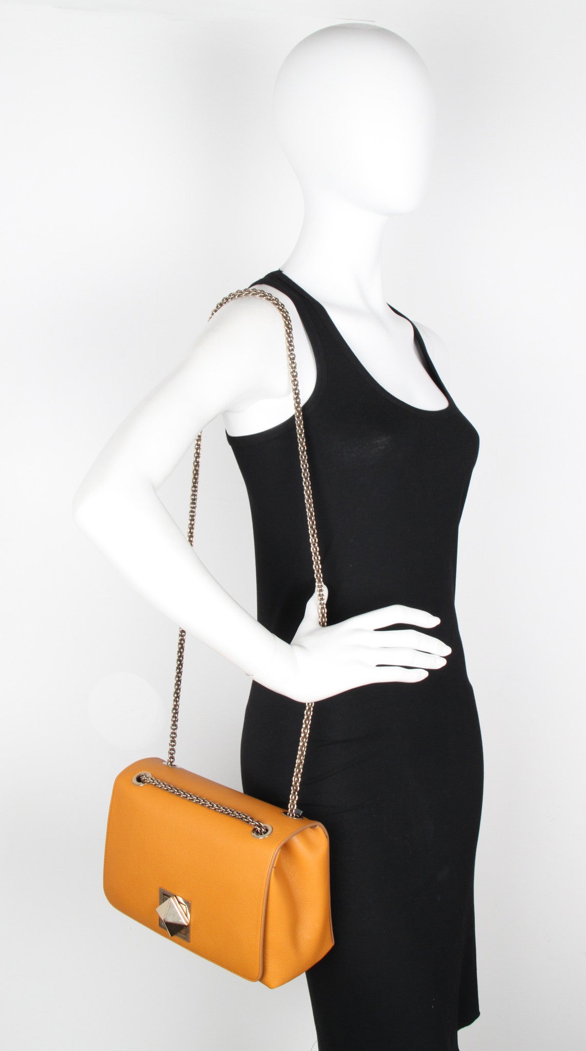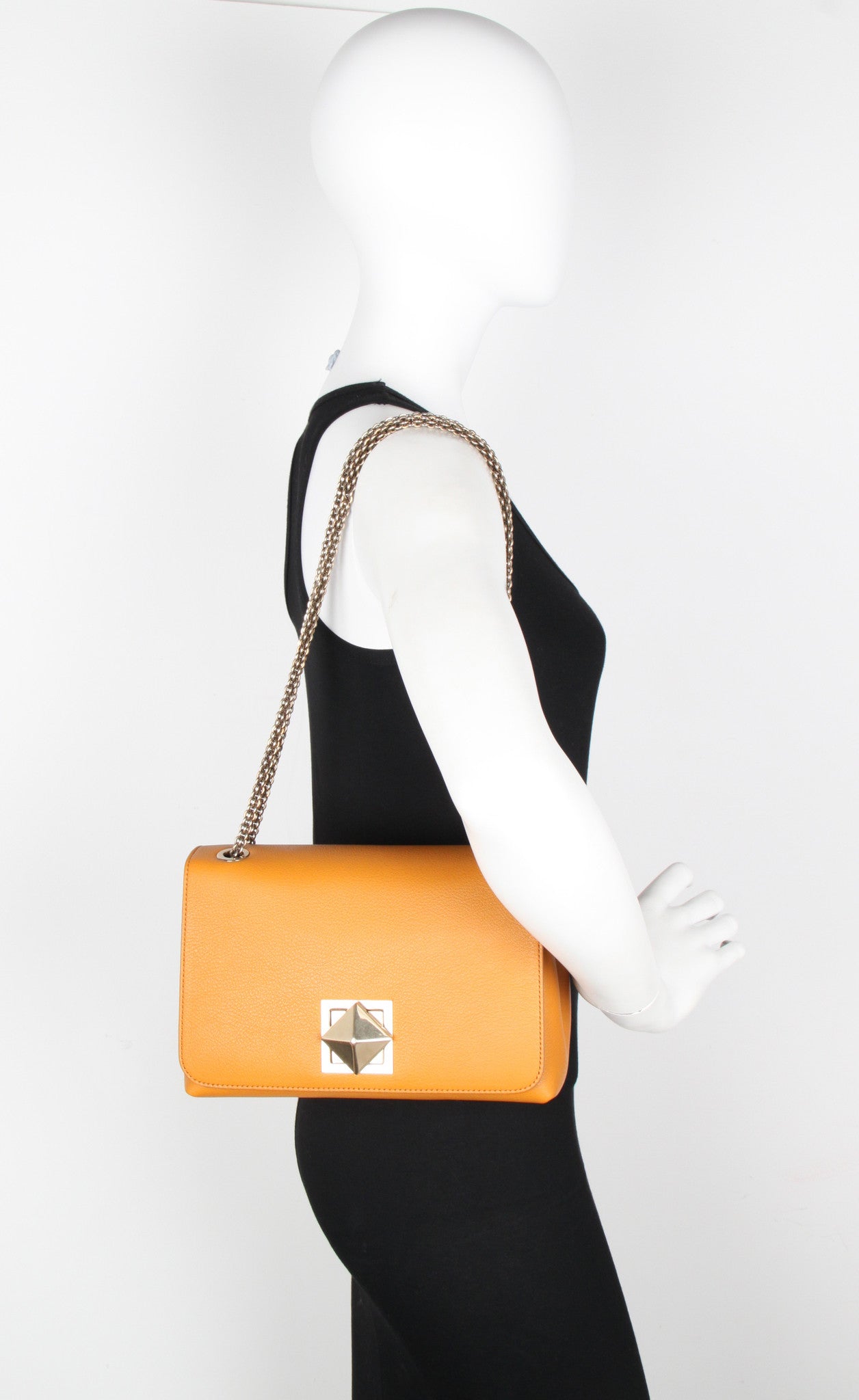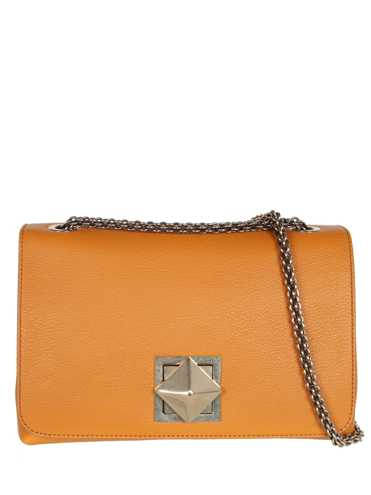 Sonia Rykiel medium flap bag, suede lined, and interior and exterior flat pocket and internal zip pocket, twist clasp closure. Chain can be doubled over and worn as a shoulder bag or lengthened to be cross body.