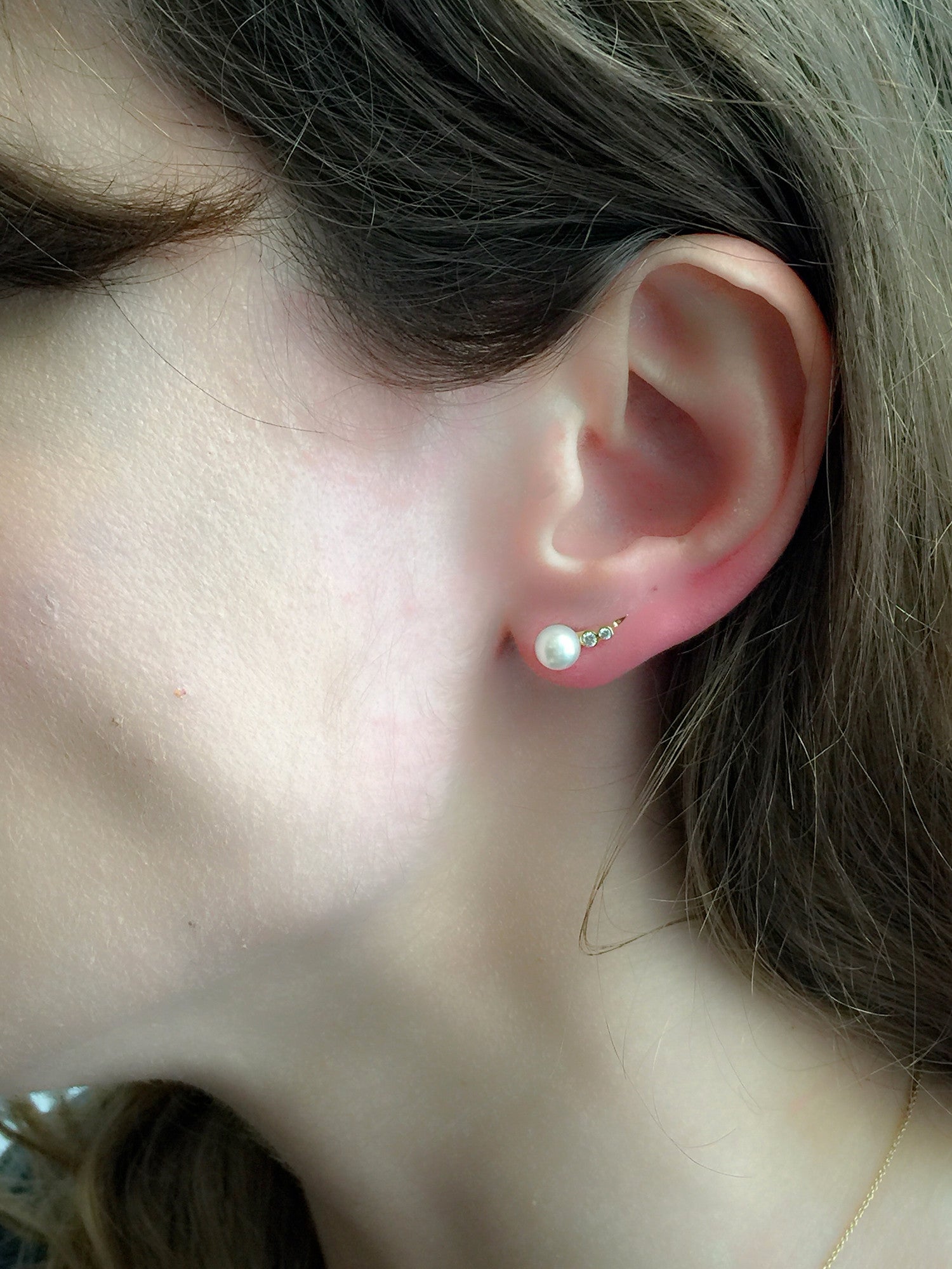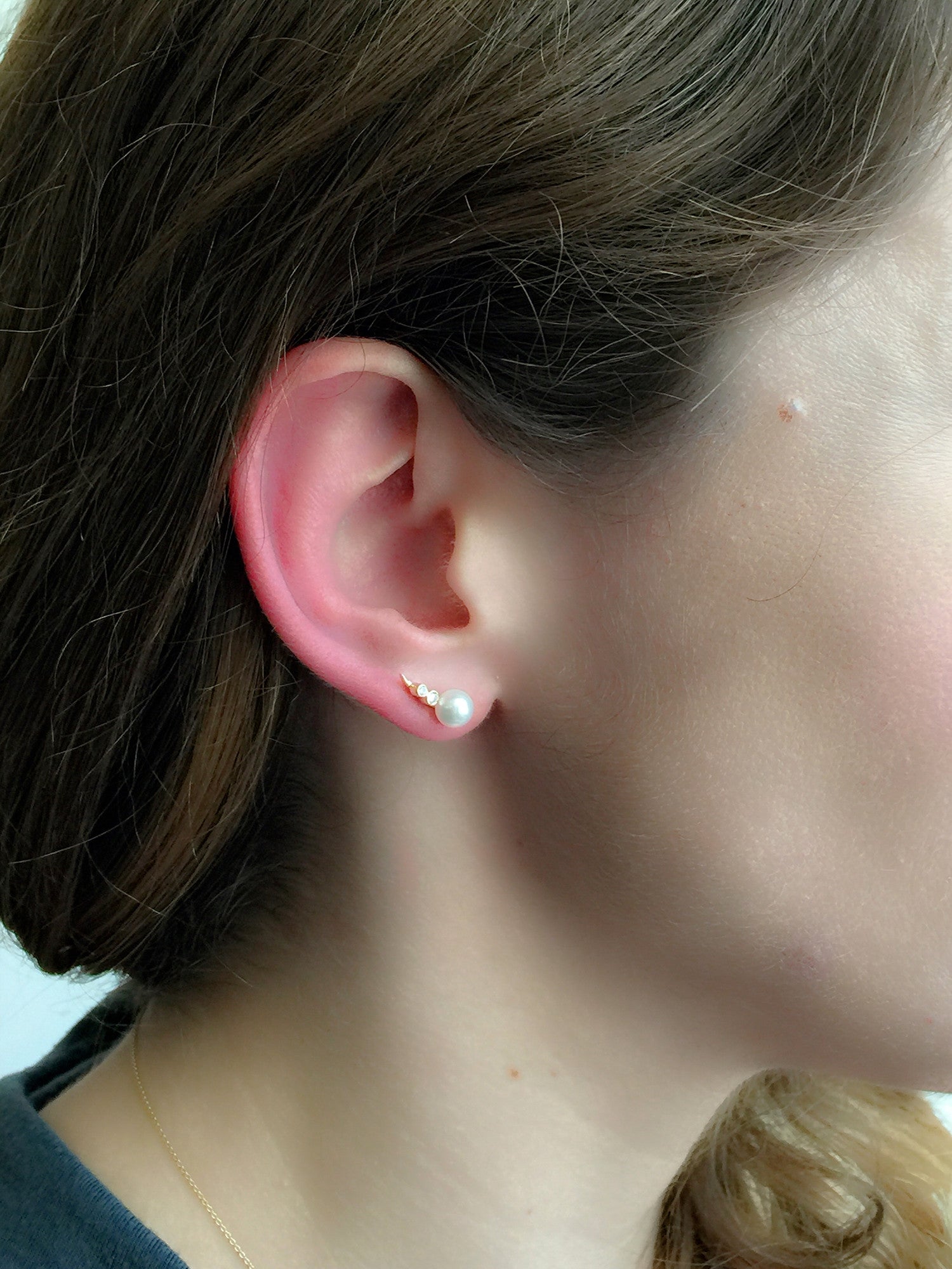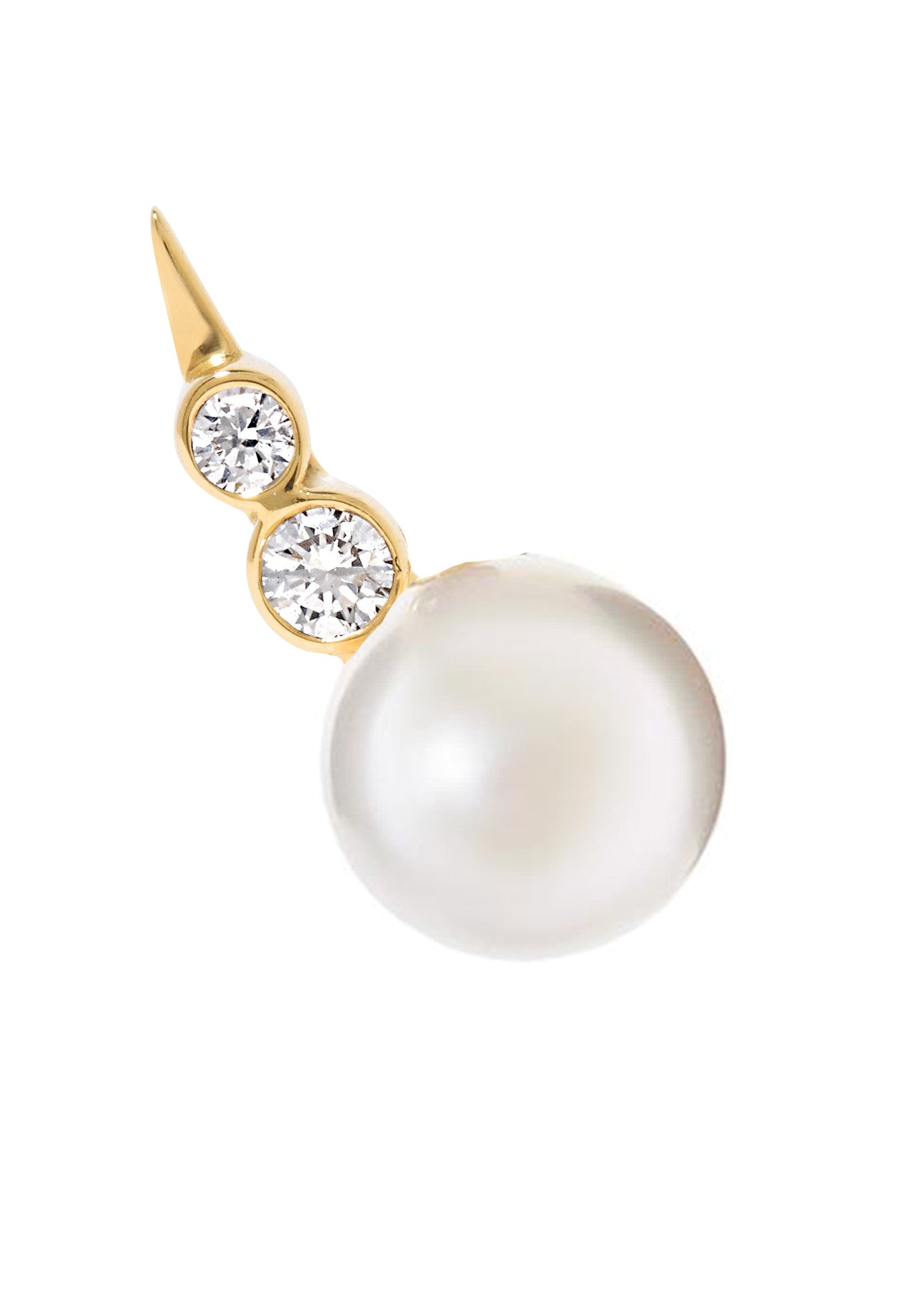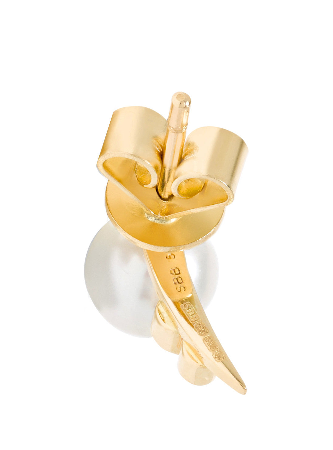 This single earring features the moon as an Akoya pearl and the stars in the form of two exquisitely cut diamonds, set in 18-karat yellow gold. For pierced ears. Wear it solo, pair it or even couple it with a completely different Sophie Bille Brahe earring for an individual, purposely mismatched look.