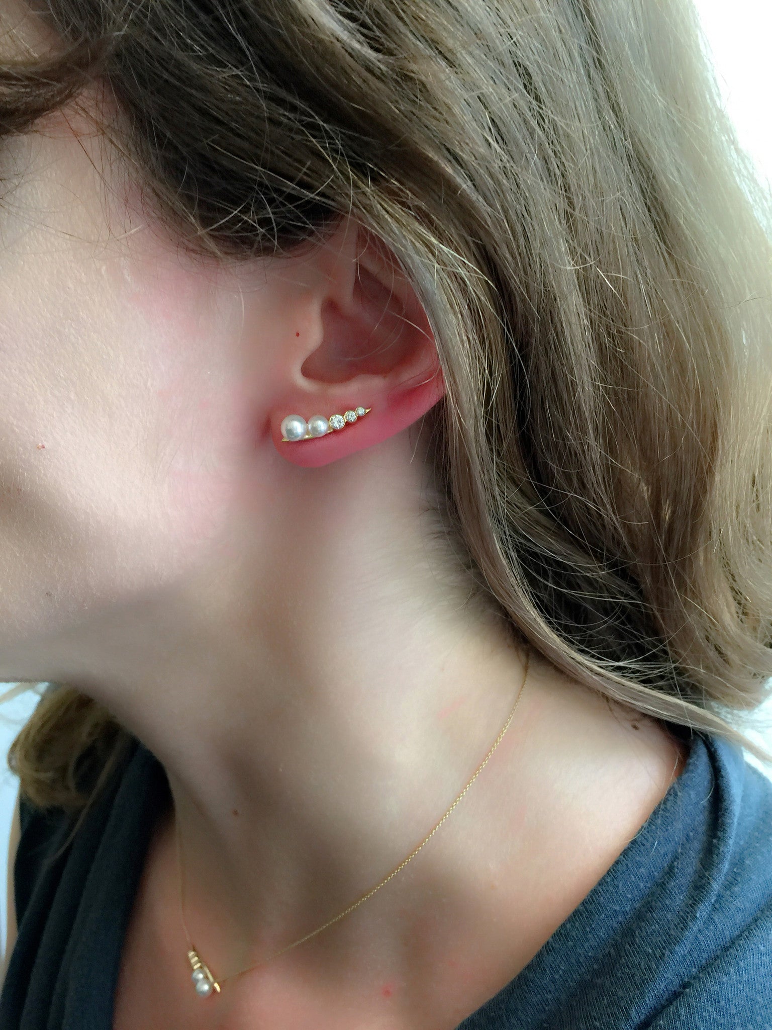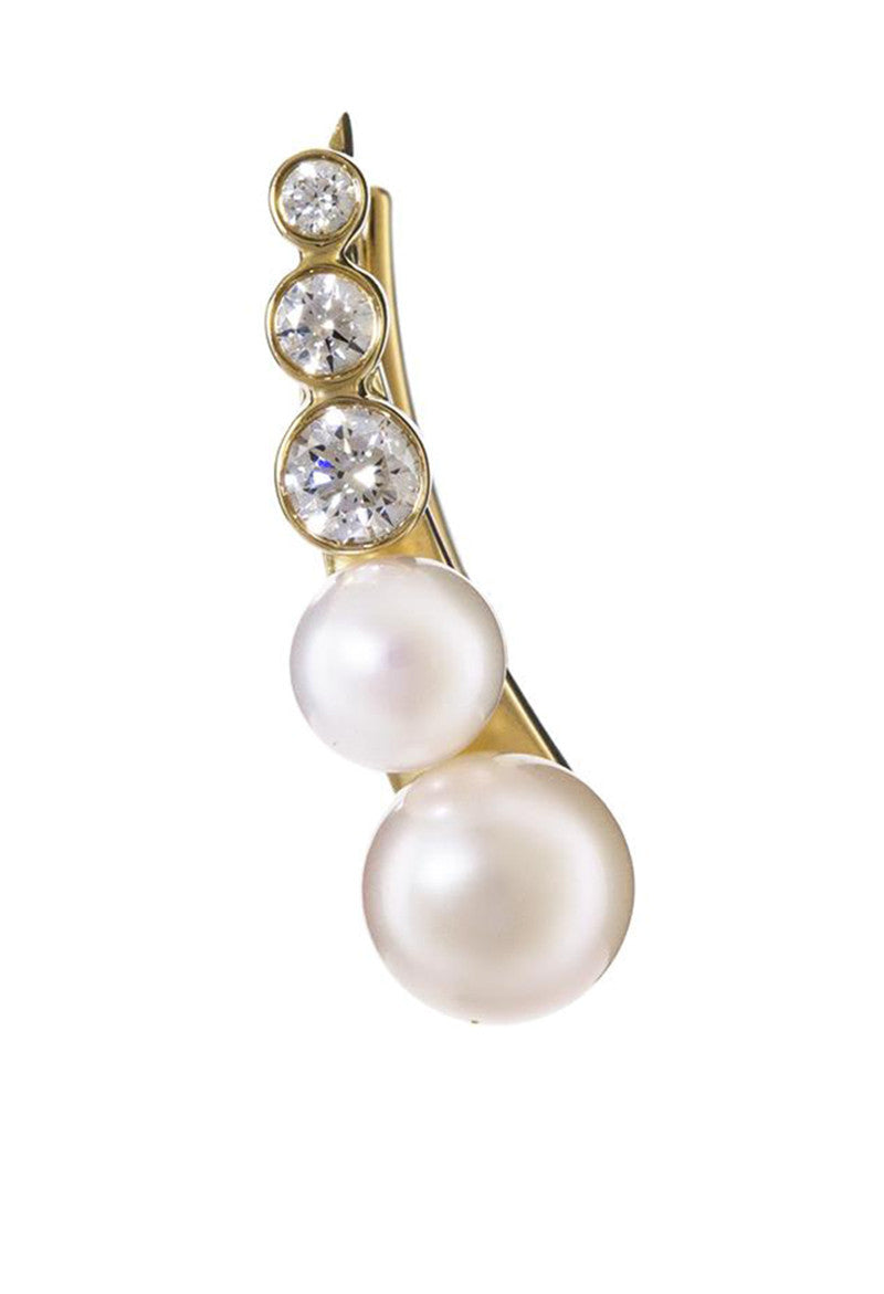 Two Akoya pearls with three white diamonds in descending size follow the contour of the ear. 18 kt. yellow gold with total carat weight of 0,13 ct. Top Wesselton VVS Diamonds .13 carat. Hook back for pierced ears.