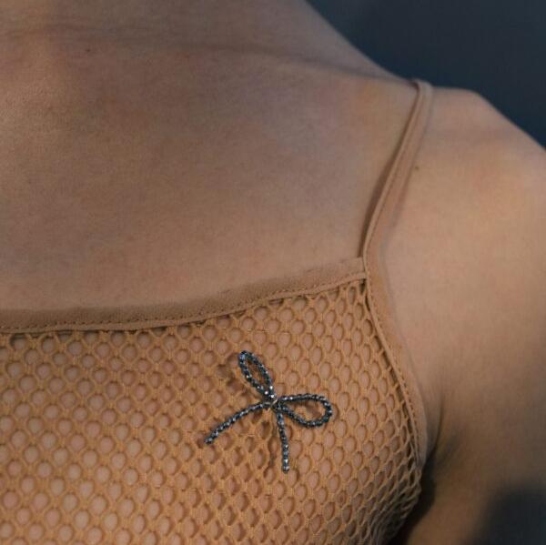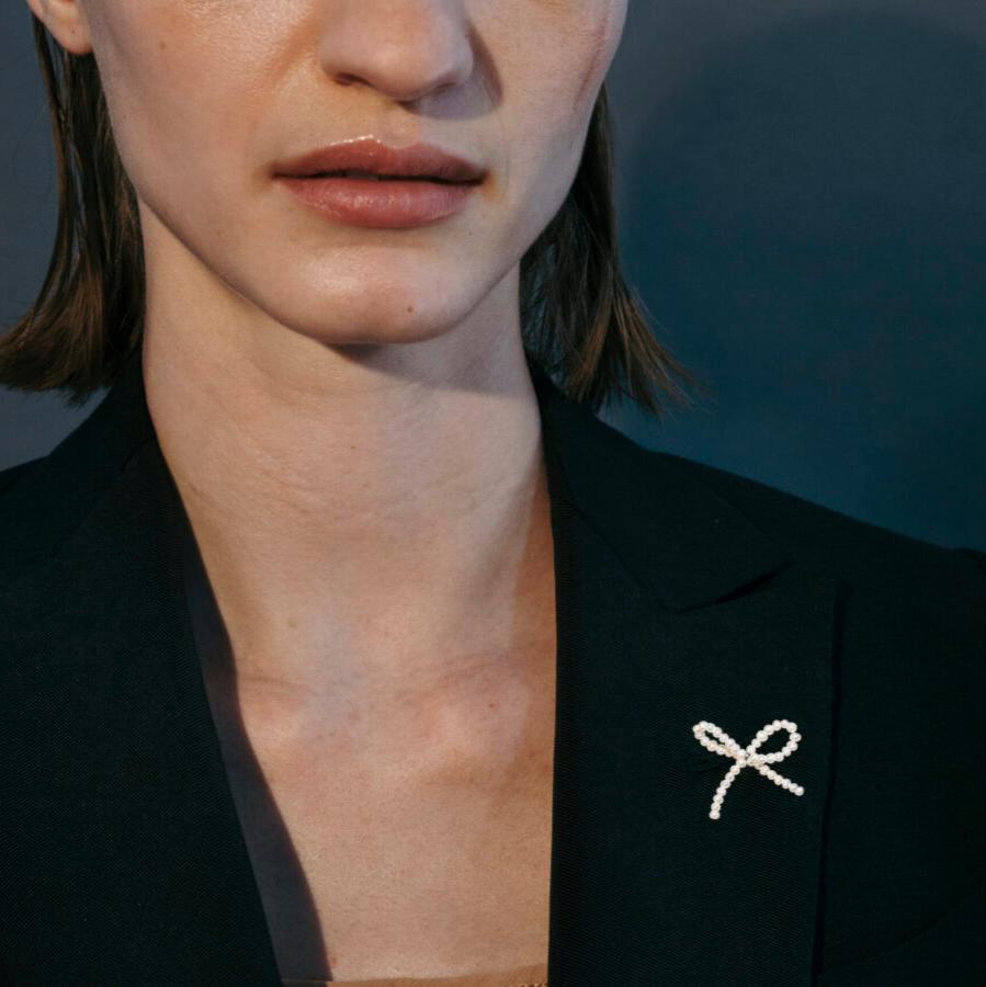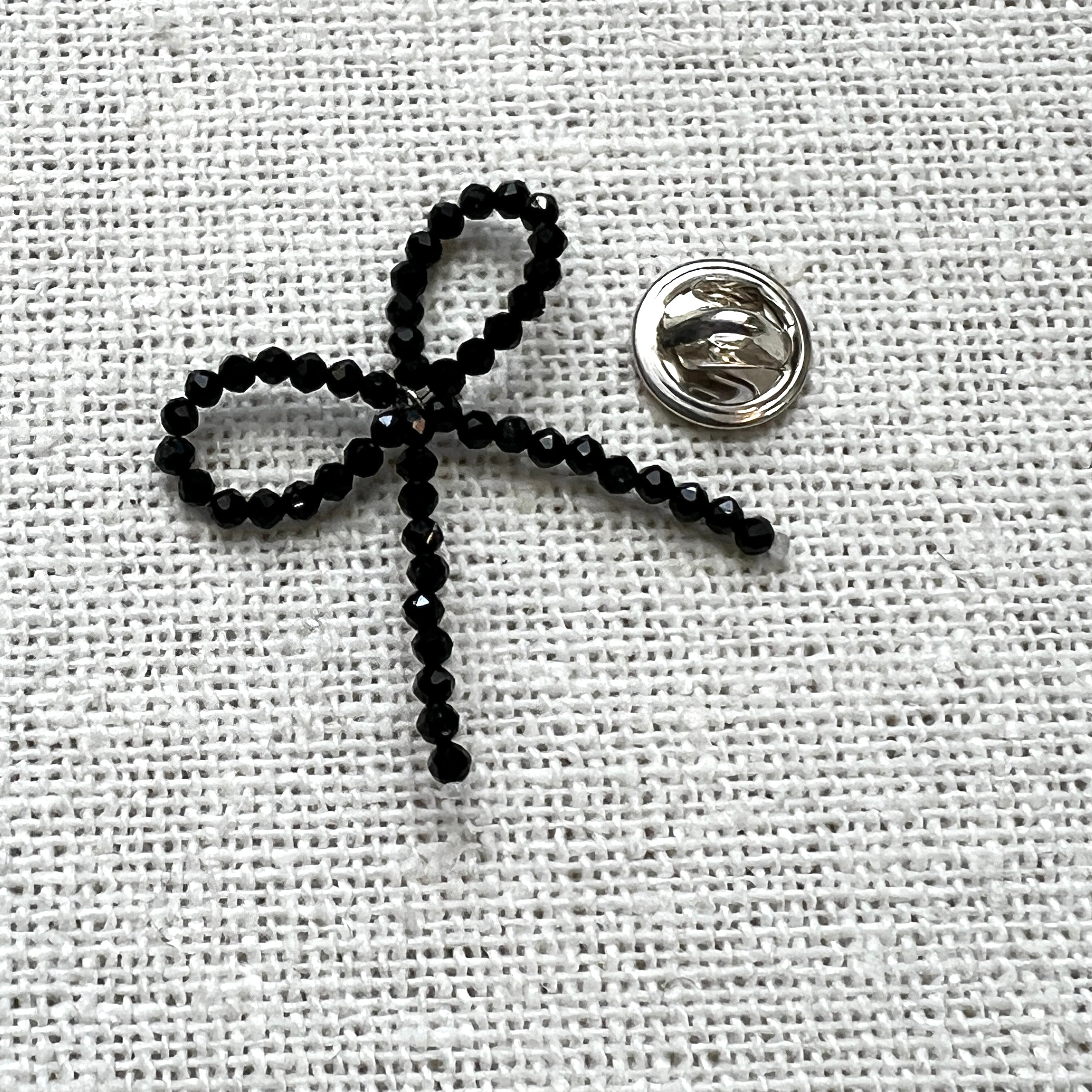 A sparkling little brooch in the shape of a bow. It has a glamorous but cool feeling, great on everything.