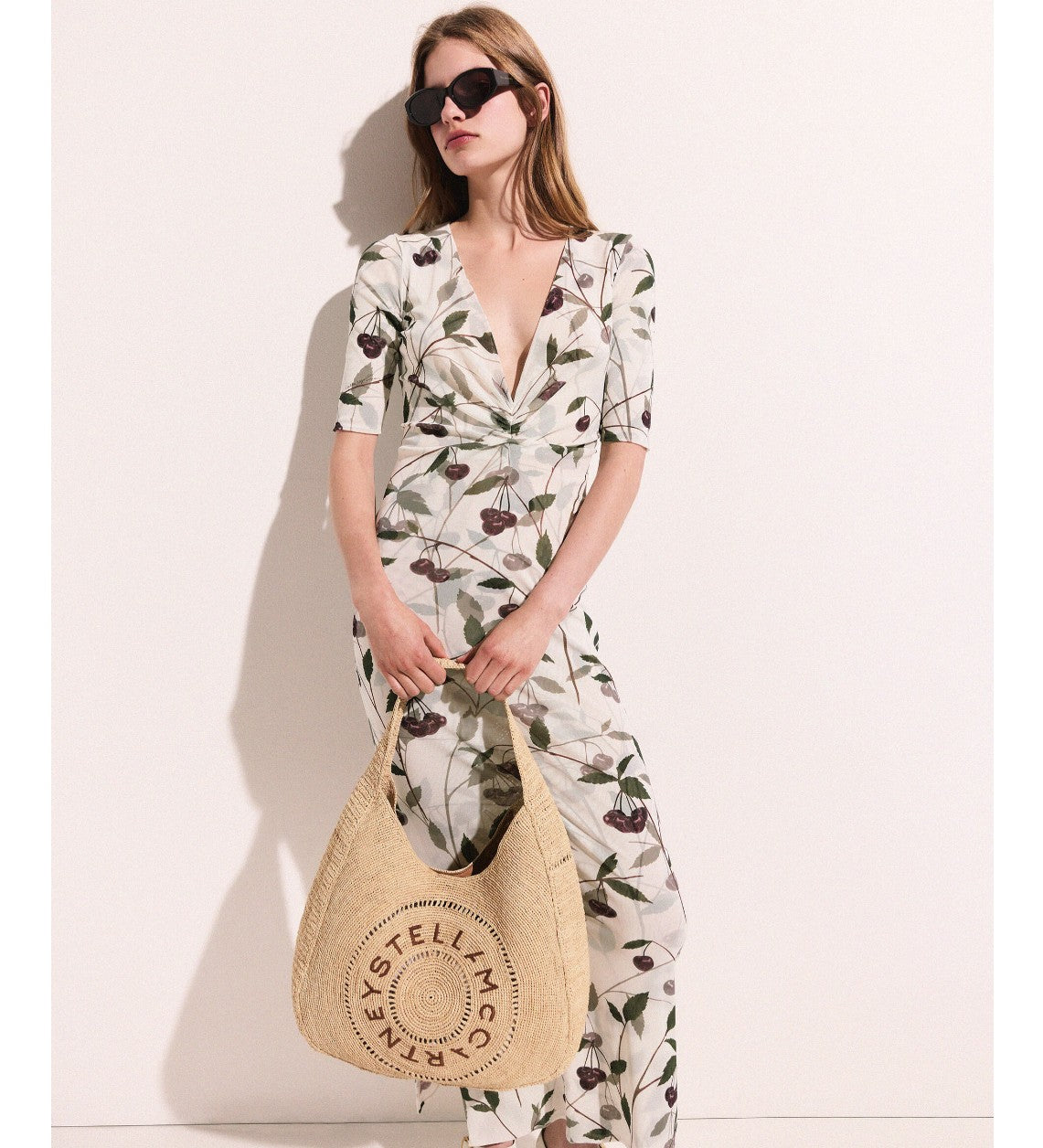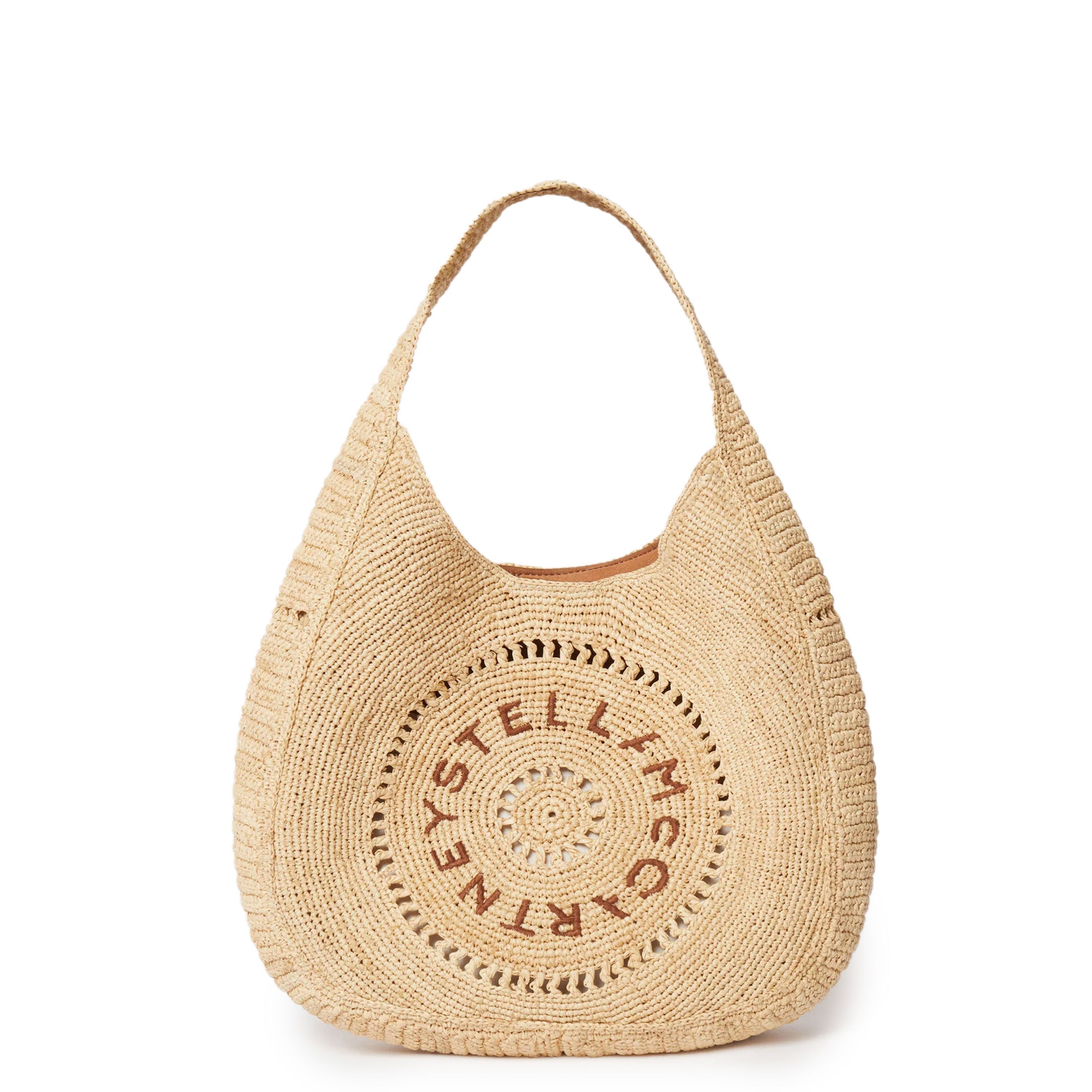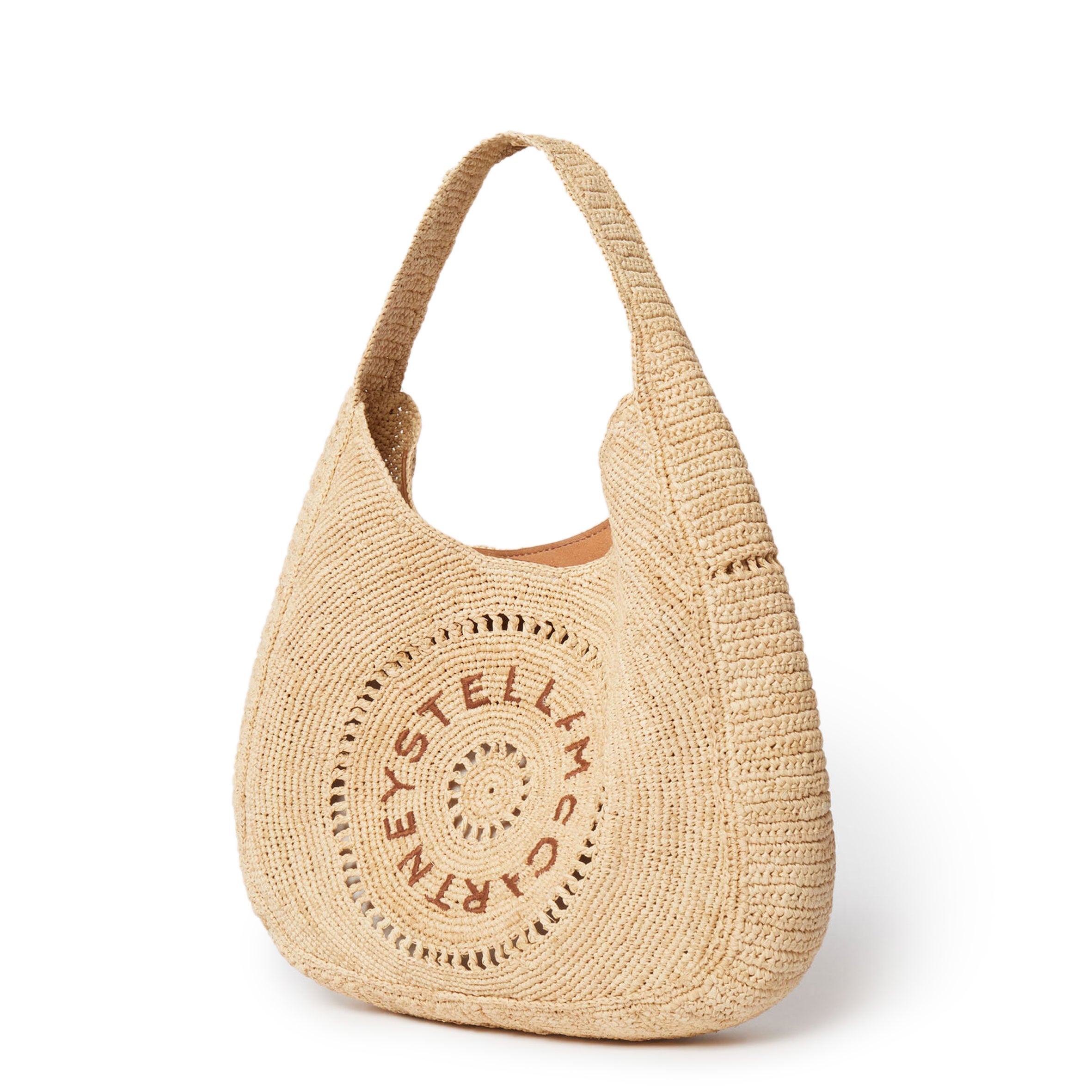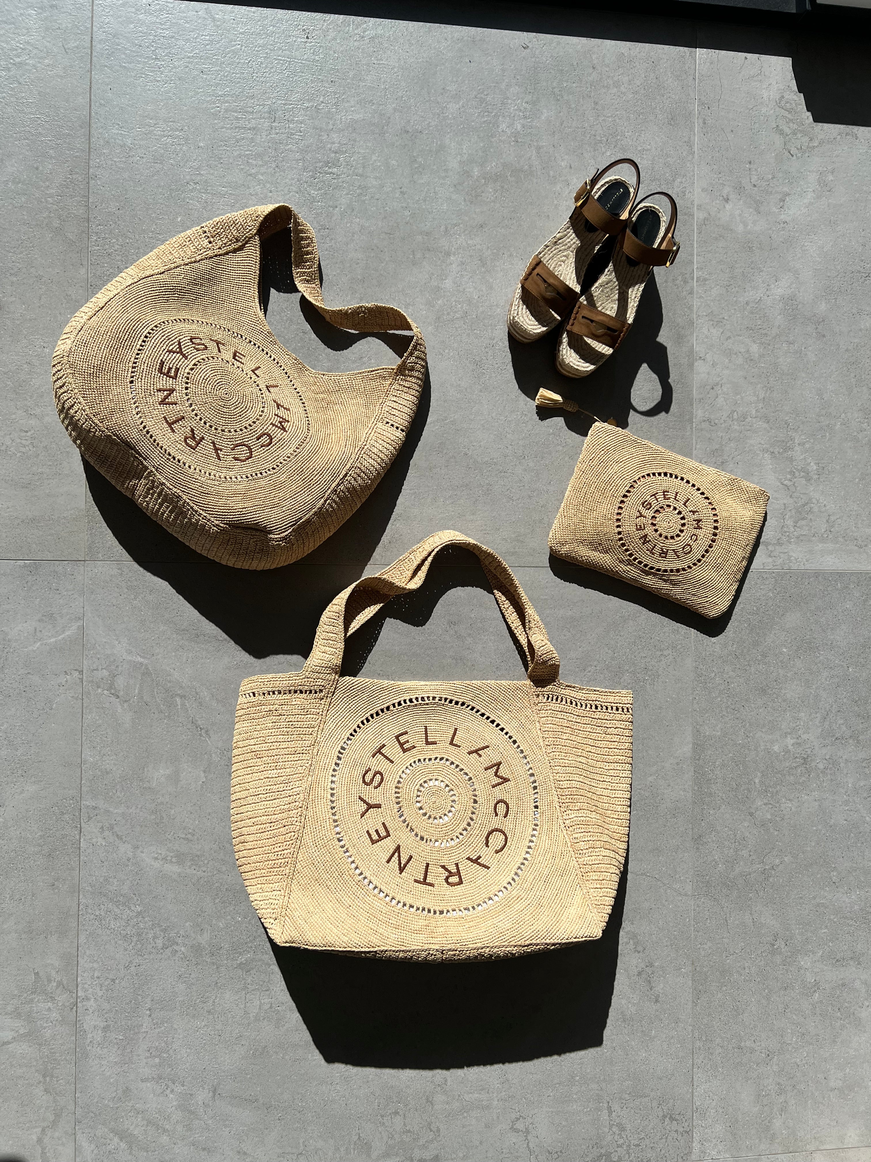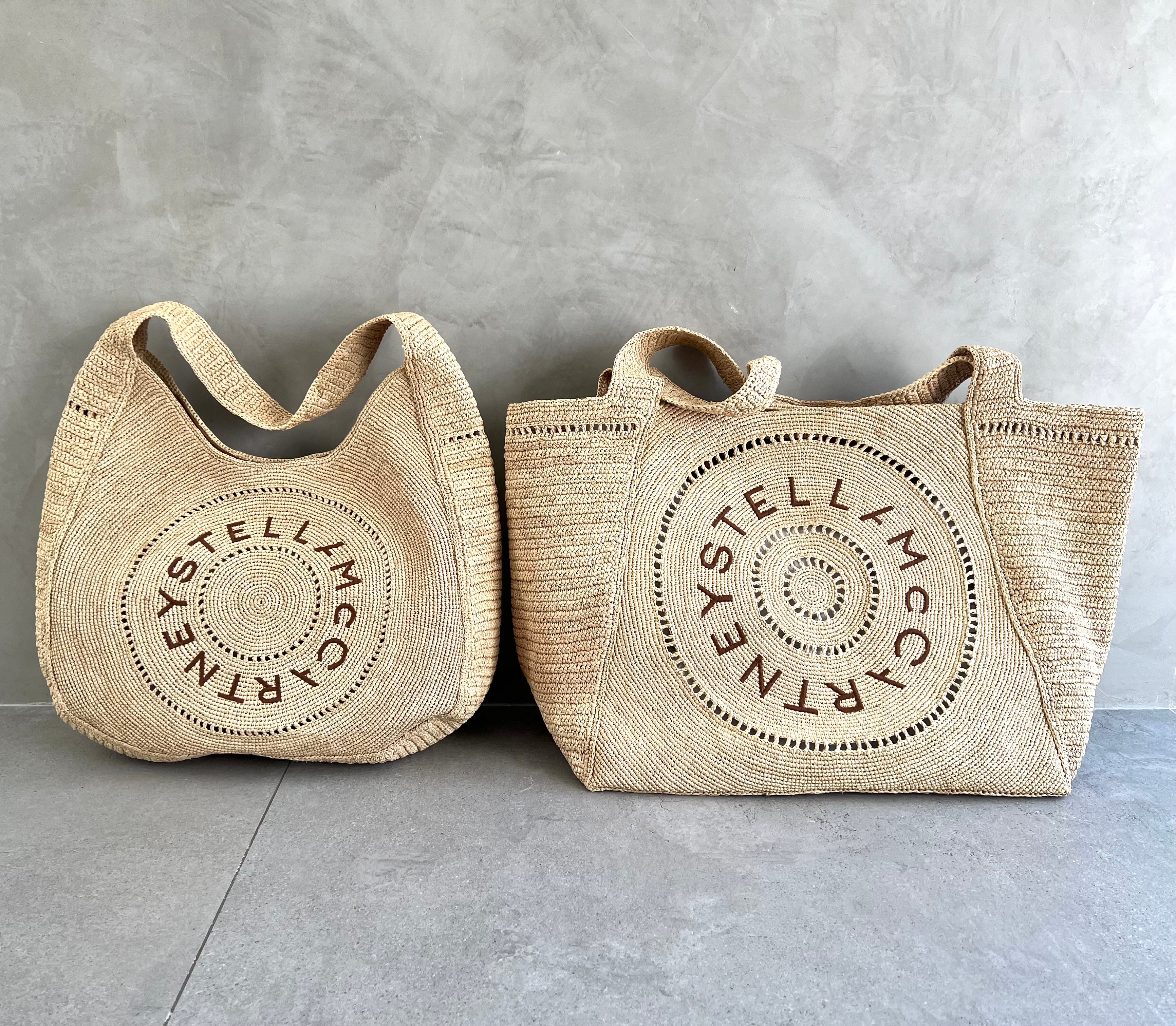 The slouchy Logo hobo tote bag is reimagined for High Summer in renewable raffia, handwoven in a fair-trade and safe workshop by female artisans in Madagascar – keeping traditional skills alive whilst protecting our planet for tomorrow. Raffia is an incredibly durable, easy-to-grow plant that supports soil health and absorbs greenhouse gasses. The luxury vegan bag is hand-finished with a Stella McCartney logo, embroidered on the front and lined with soft organic cotton