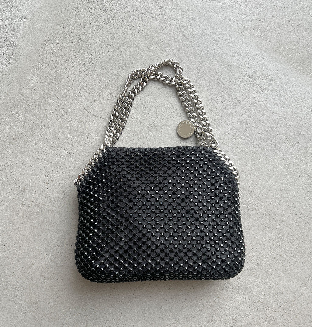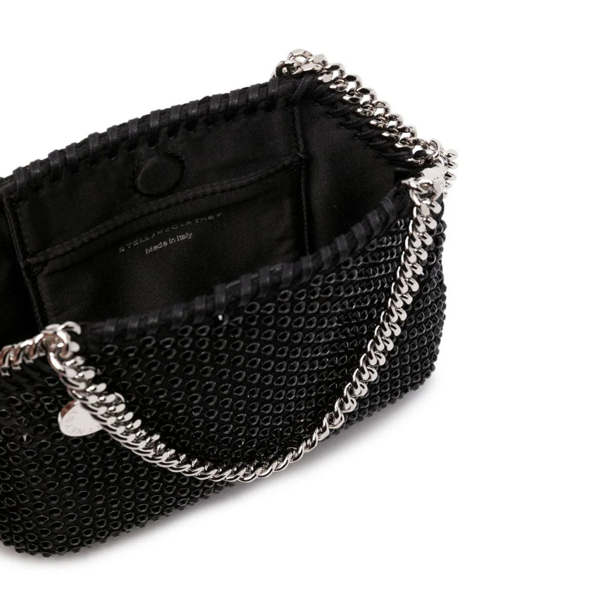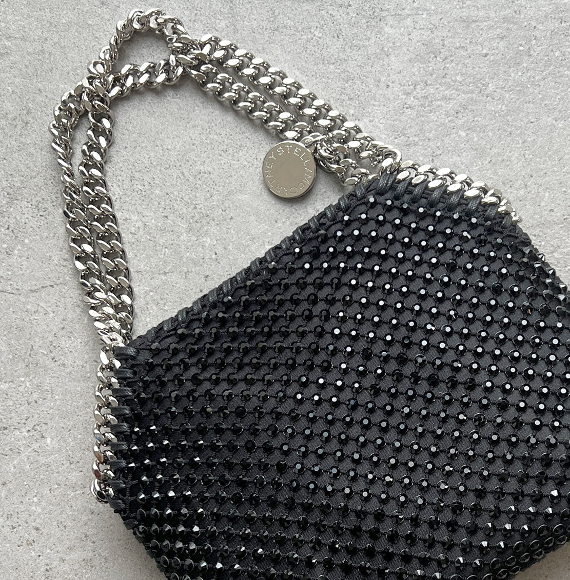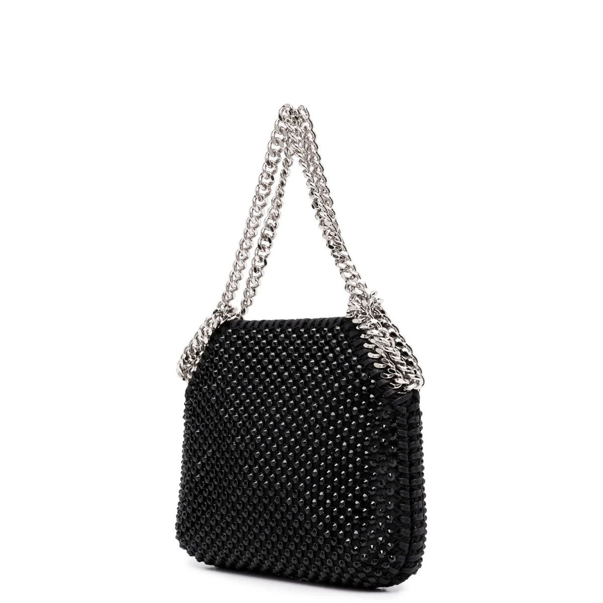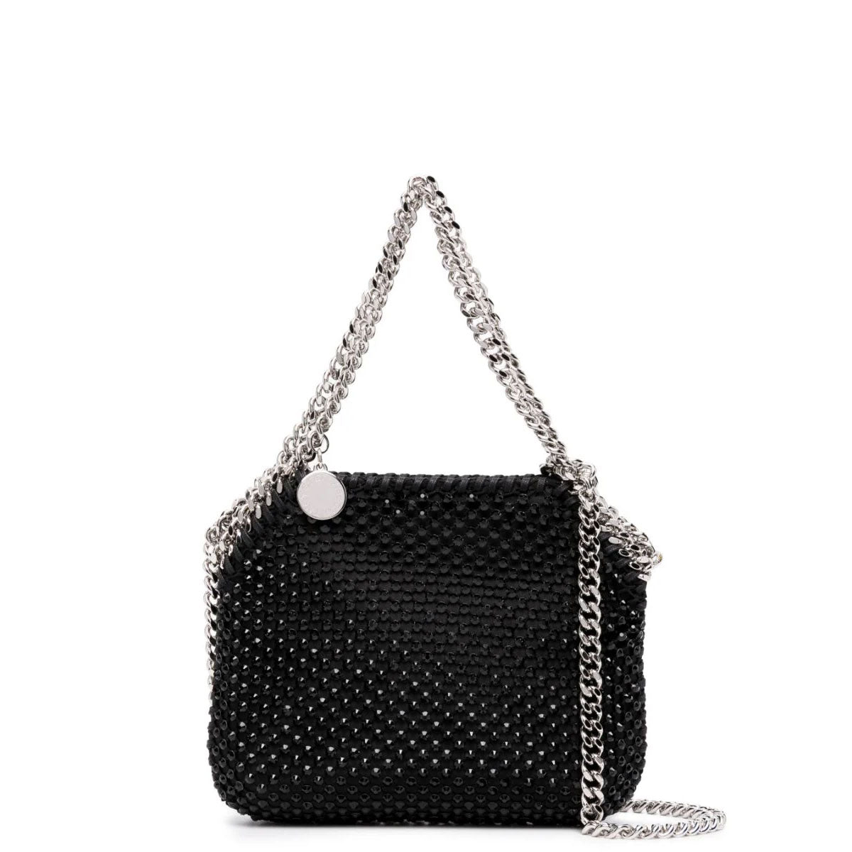 Primed for evening wear, this Falabella mini tote bag is carefully crafted from intricate crystal mesh. The Italian-made tote is elevated with our iconic diamond-cut chain and an engraved logo medallion charm. Features a shoulder strap with two top handles, One internal slip pocket and a magnetic snap fastening, Fully lined with recycled materials.
