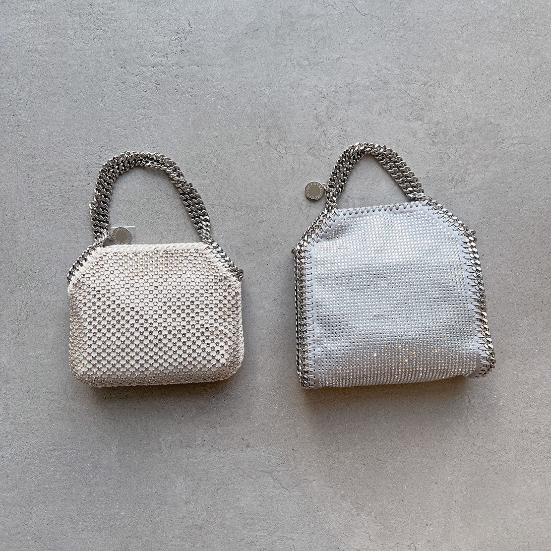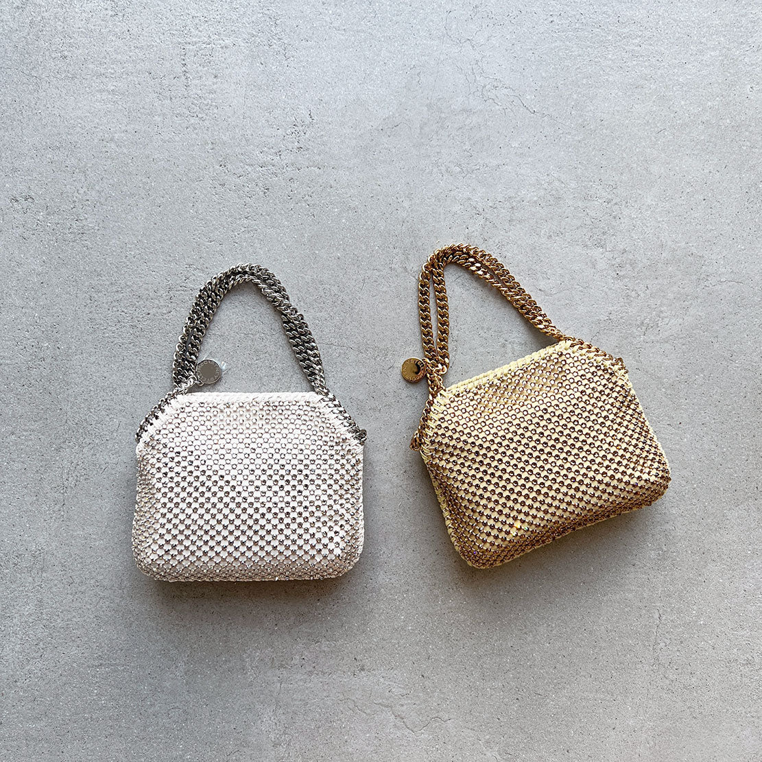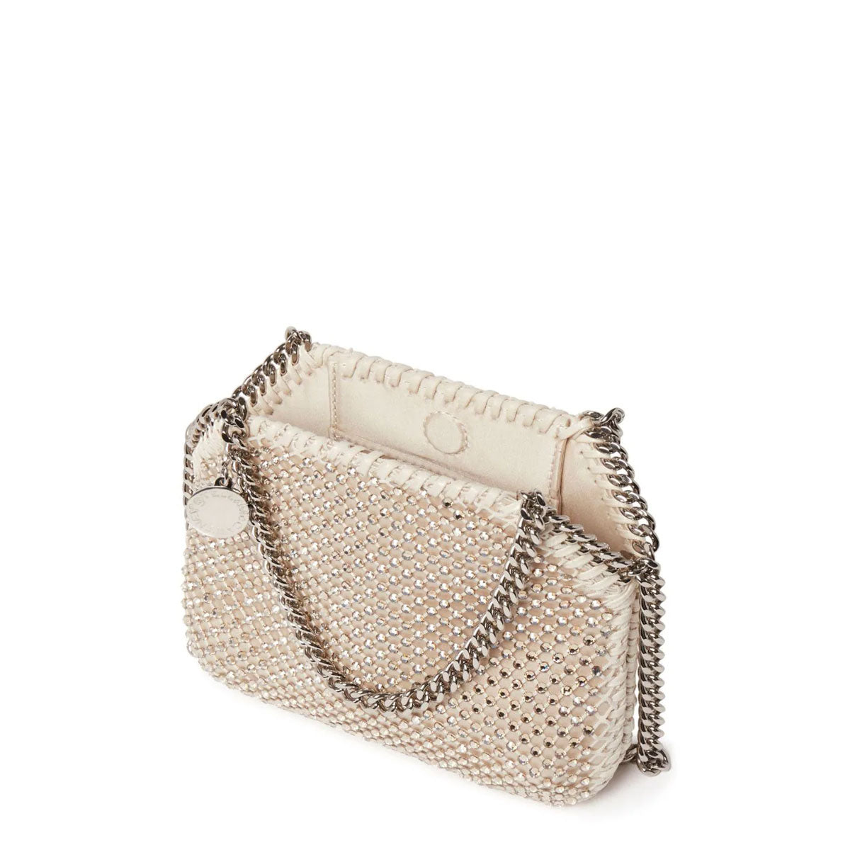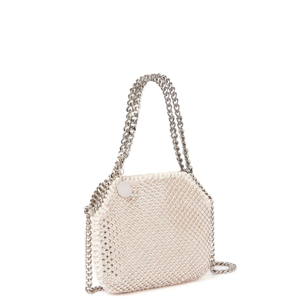 Primed for evening wear, this Falabella mini tote bag is carefully crafted from intricate crystal mesh. The Italian-made tote is elevated with our iconic diamond-cut chain and an engraved logo medallion charm. Features a shoulder strap with two top handles, One internal slip pocket and a magnetic snap fastening, Fully lined with recycled materials.