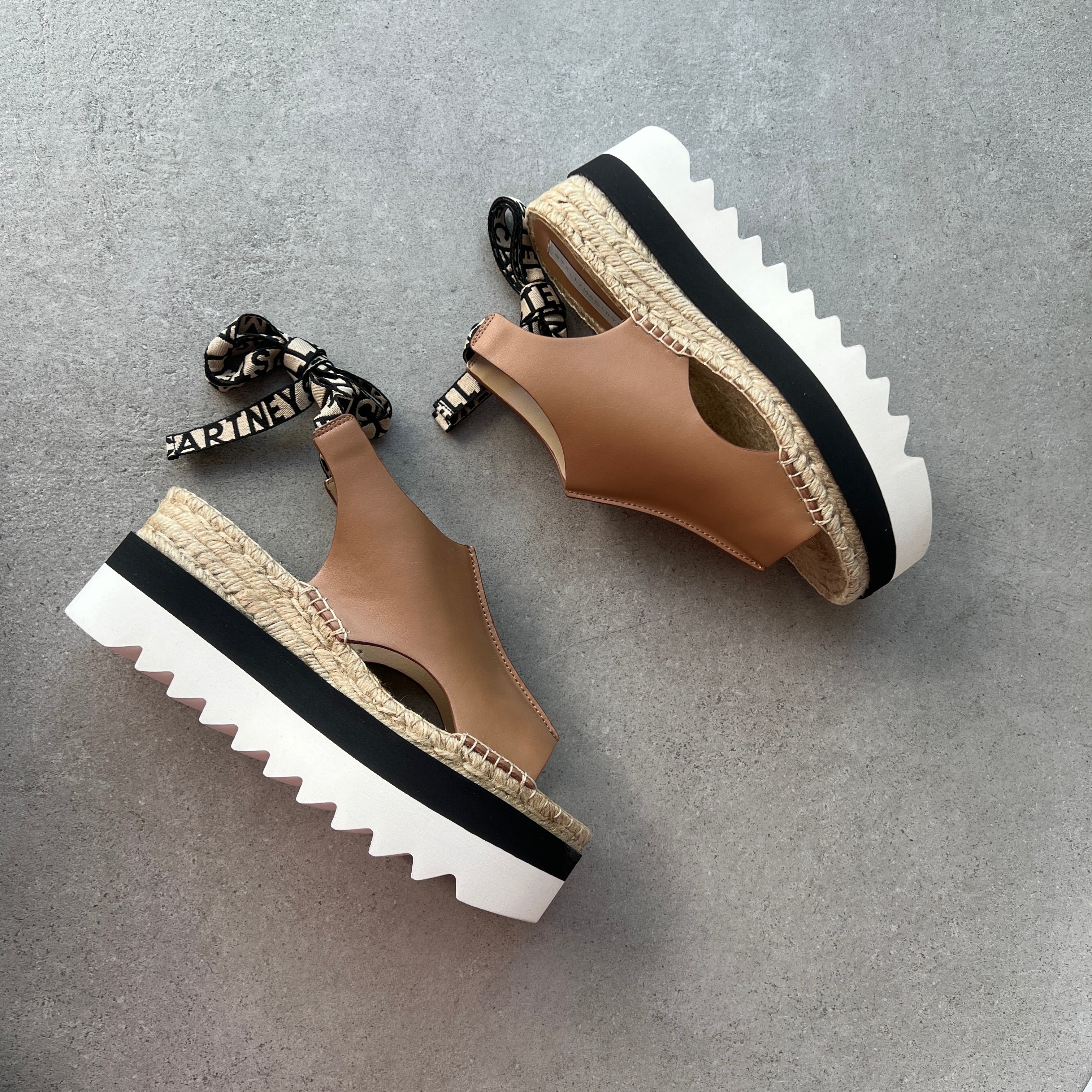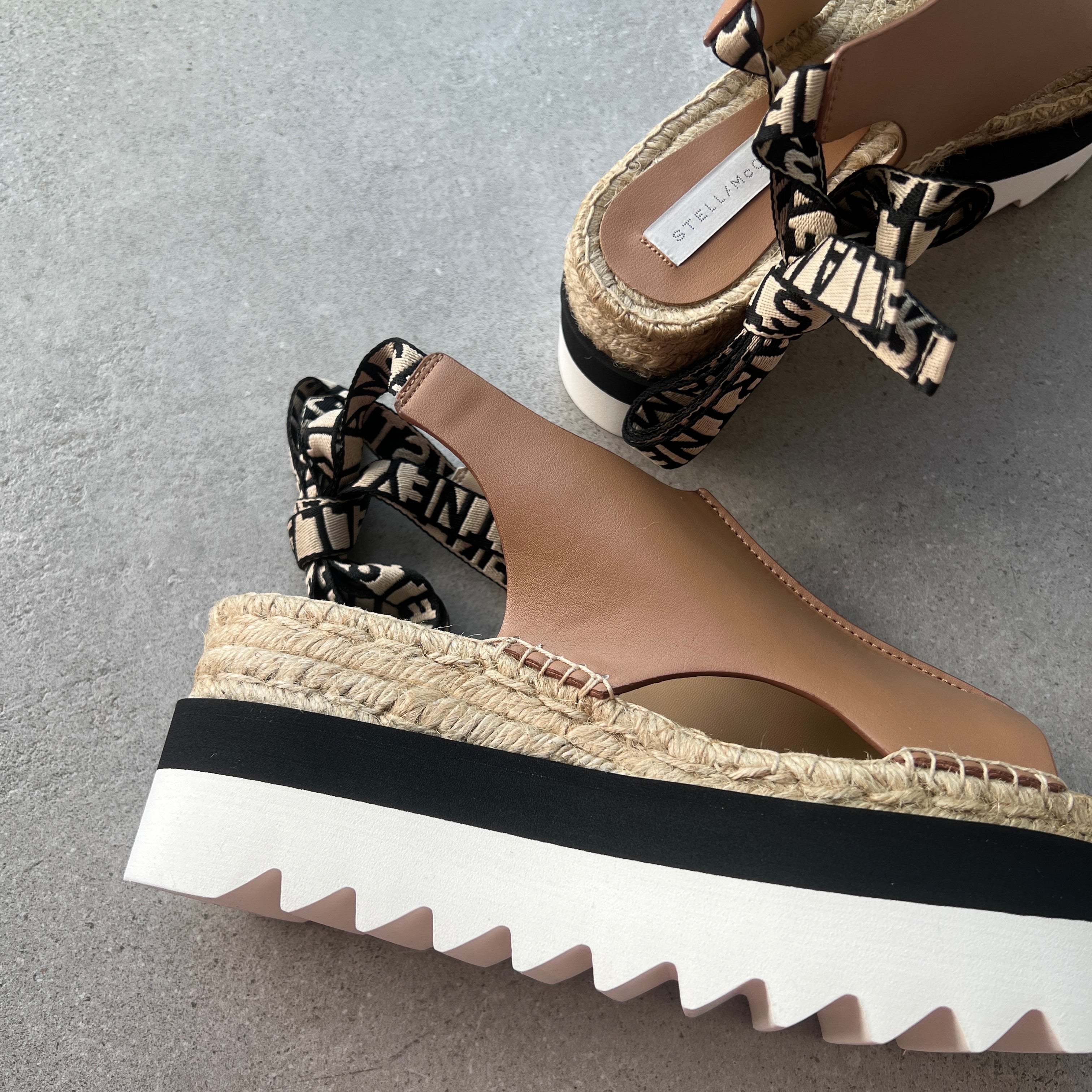 This pair is detailed with an iconic Stella McCartney logo lace-up ribbon. A braided jute midsole and saw-edge micro sole brings a thoroughly fresh take on a hippie aesthetic.