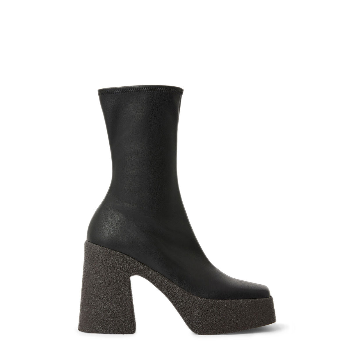 Elevate your foundational wardrobe with these Skyla platform ankle boots in stretch Alter Mat vegan leather. A timeless Stella icon, these ankle boots have a signature angular square toe and textured platform sole and block heel.