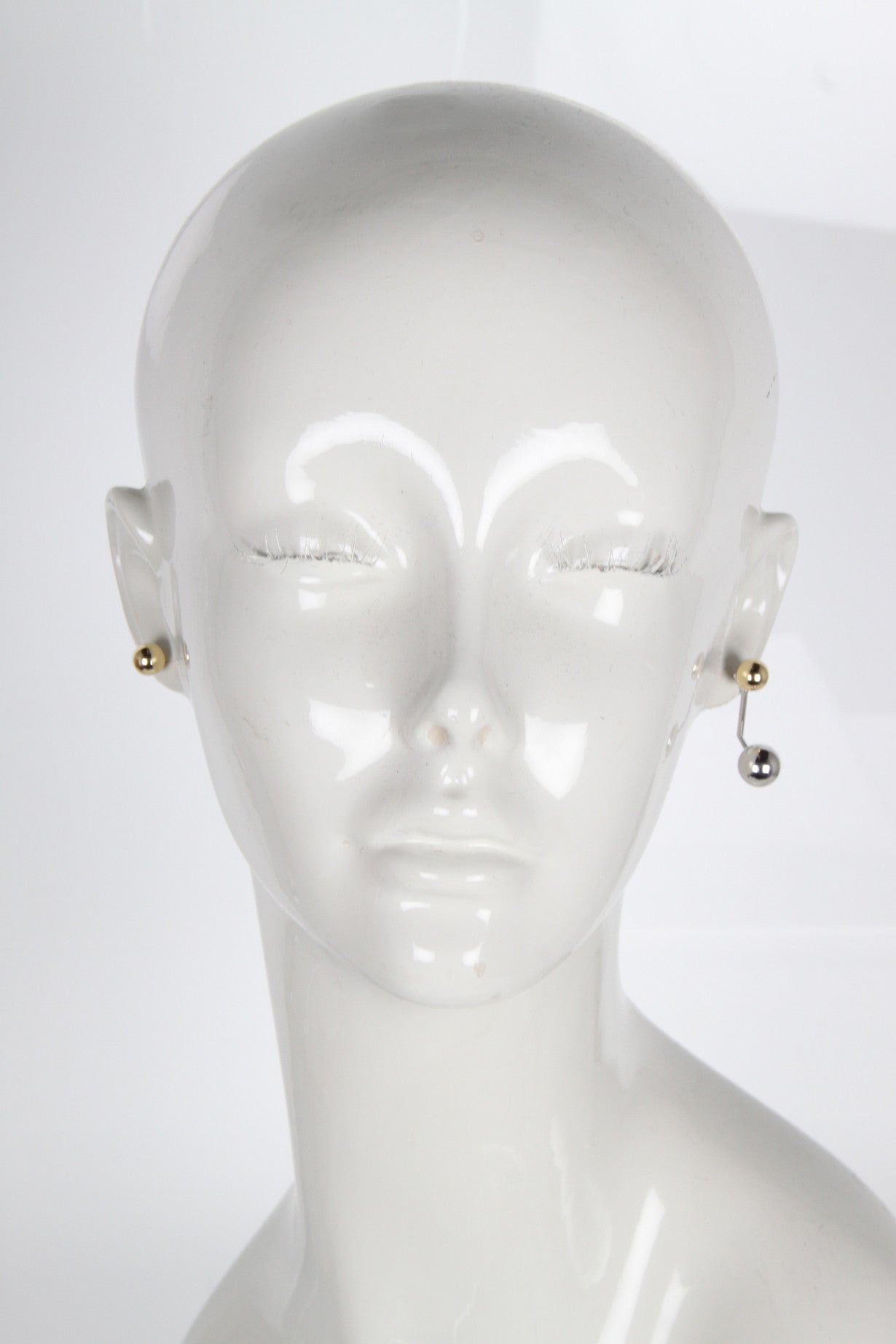 Joomi Lim sphere earrings. Two gold spheres and one floating sphere in rhodium. Brass dipped in gold and rhodium. Made in NYC