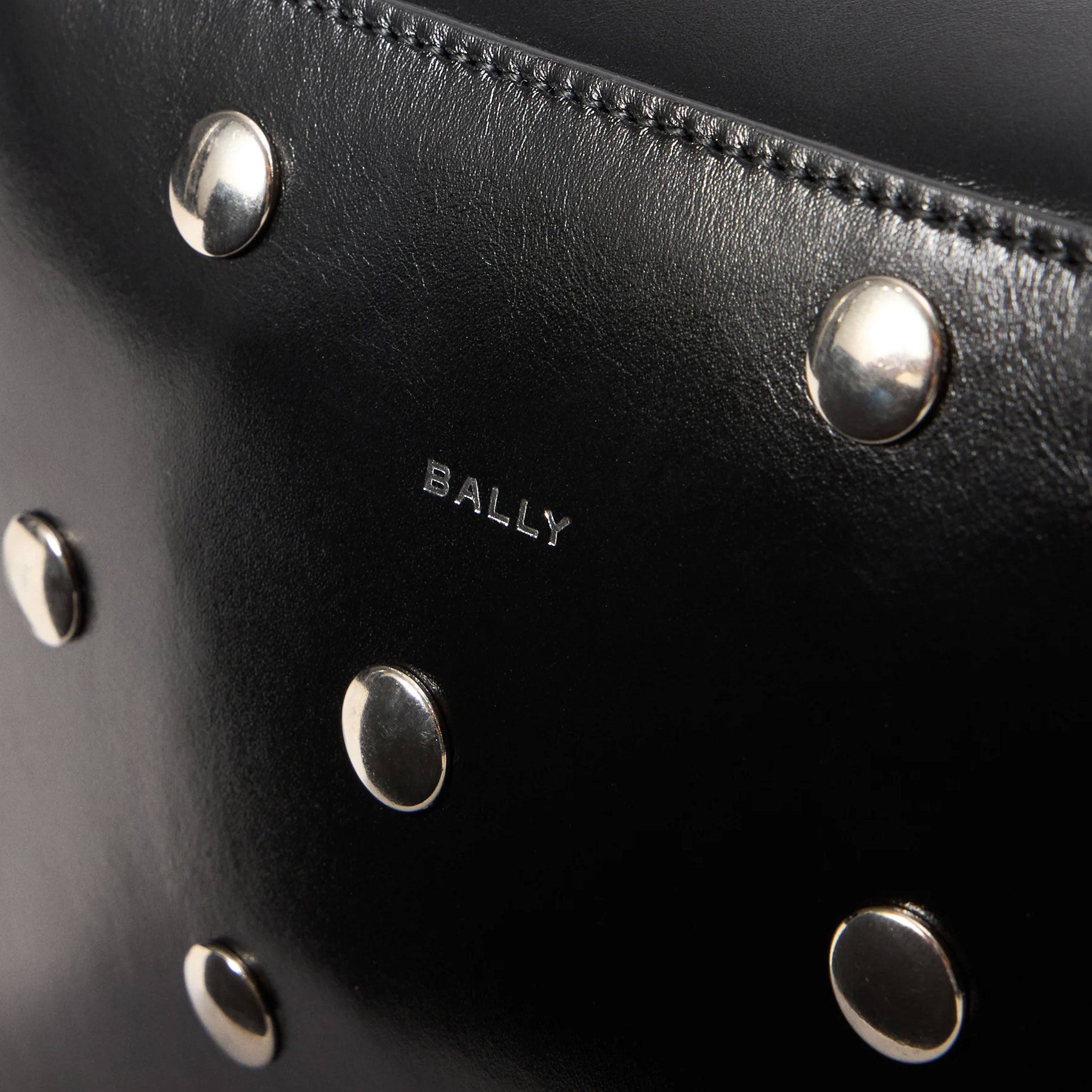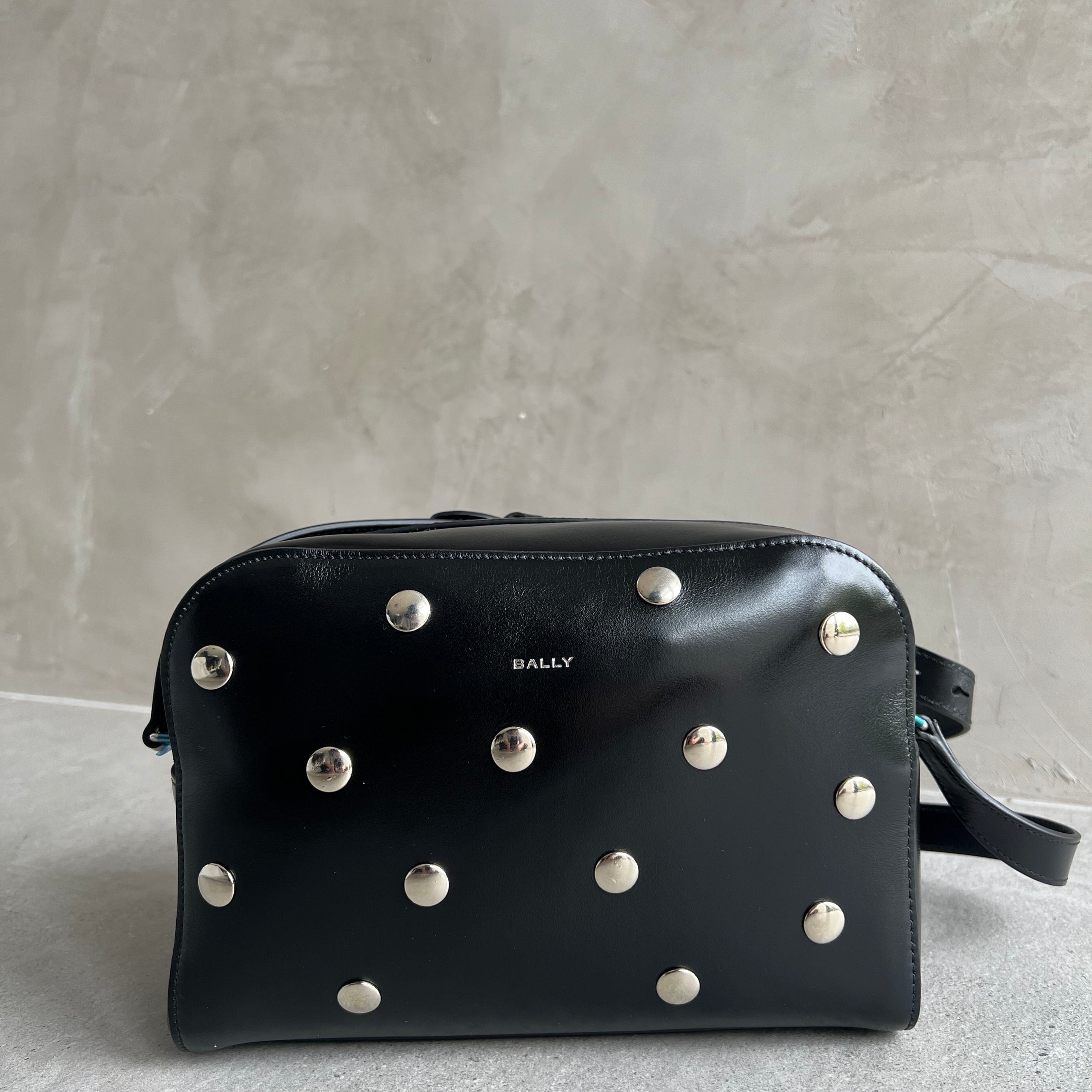 This Easy Bally crossbody bag is a sophisticated and versatile accessory. Creafted in black shiny calfskin with stud details and a small silver-tone foil logo on the front.