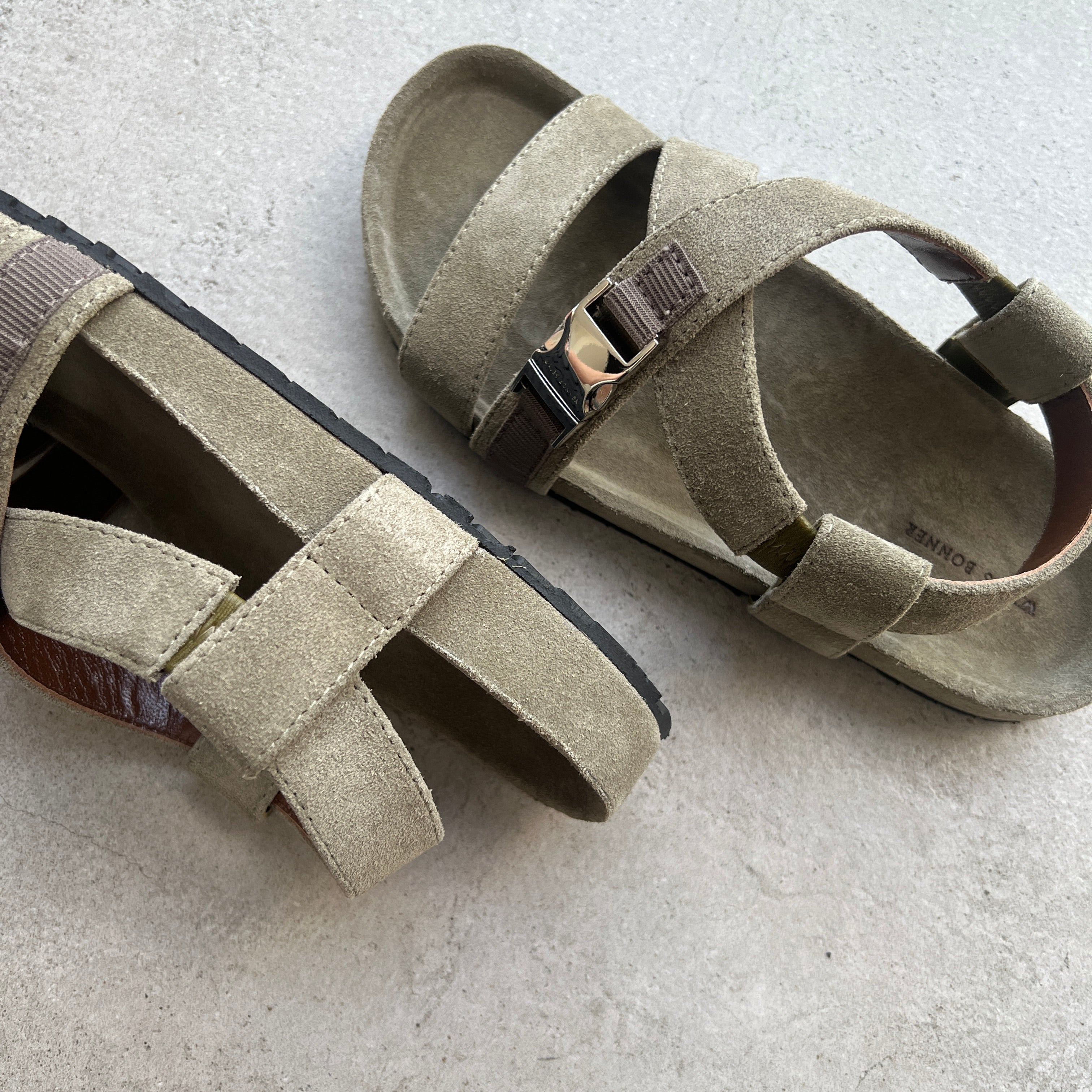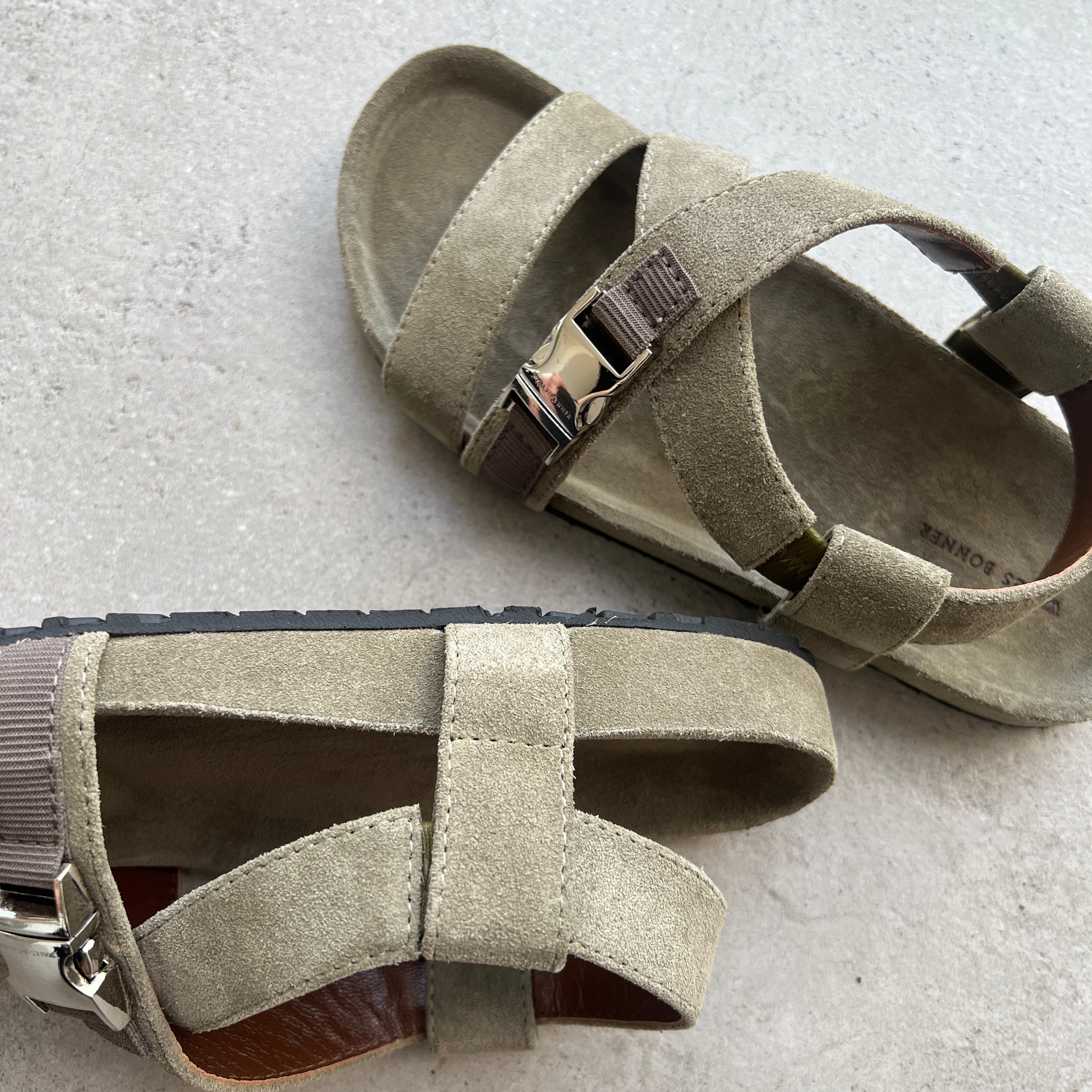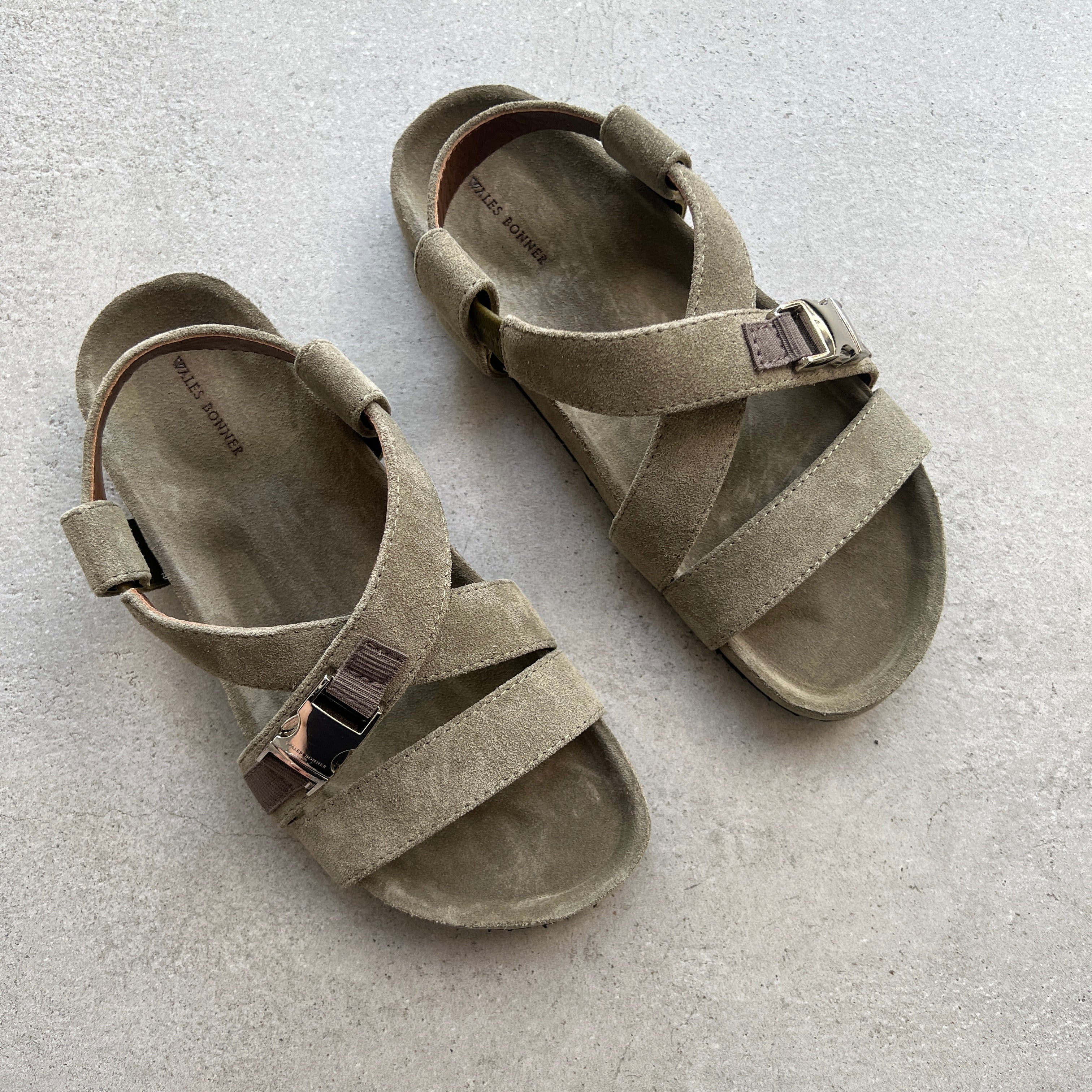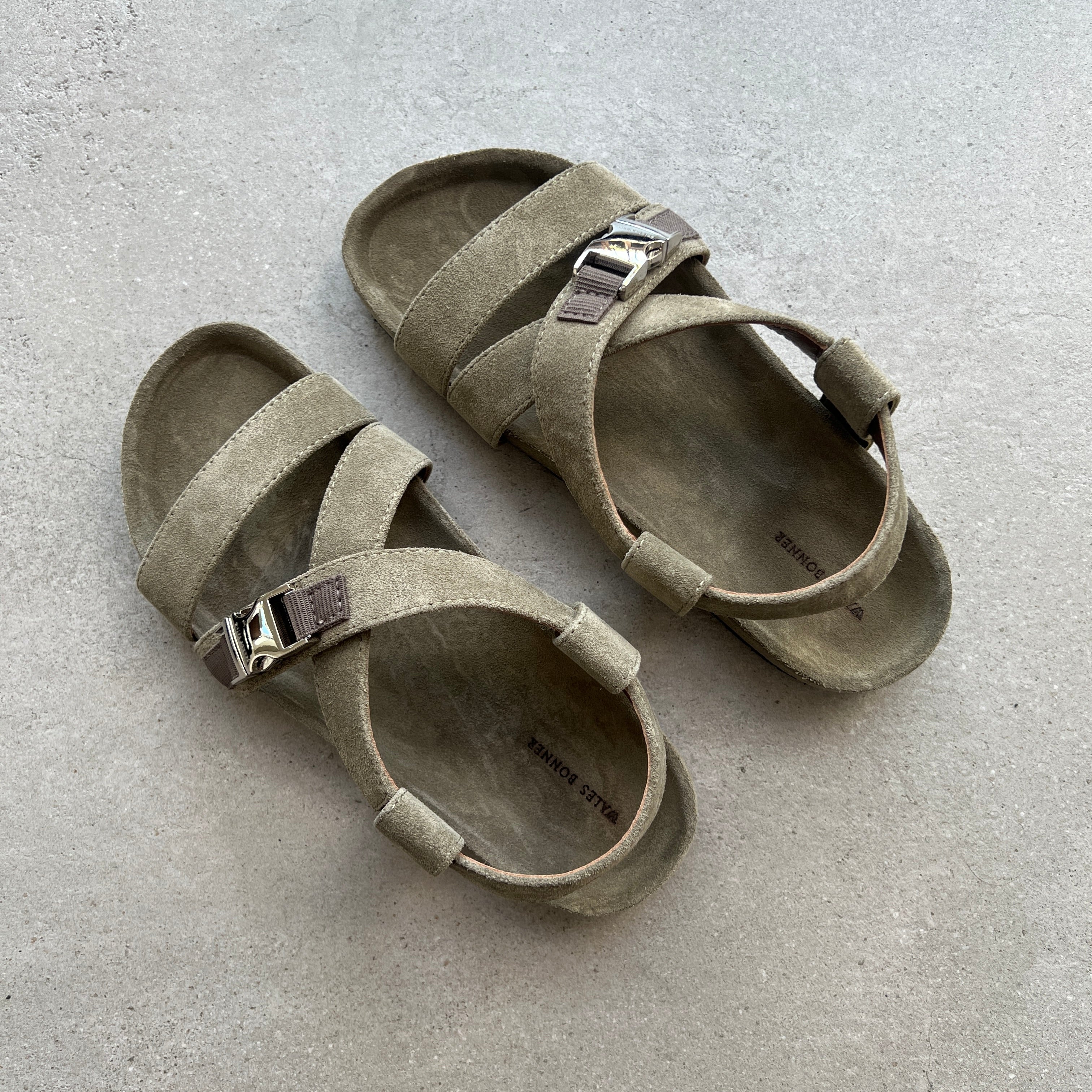The Promise Sandal in khaki suede features a metal buckle closure and a padded leather sole embossed with the Wales Bonner logo.