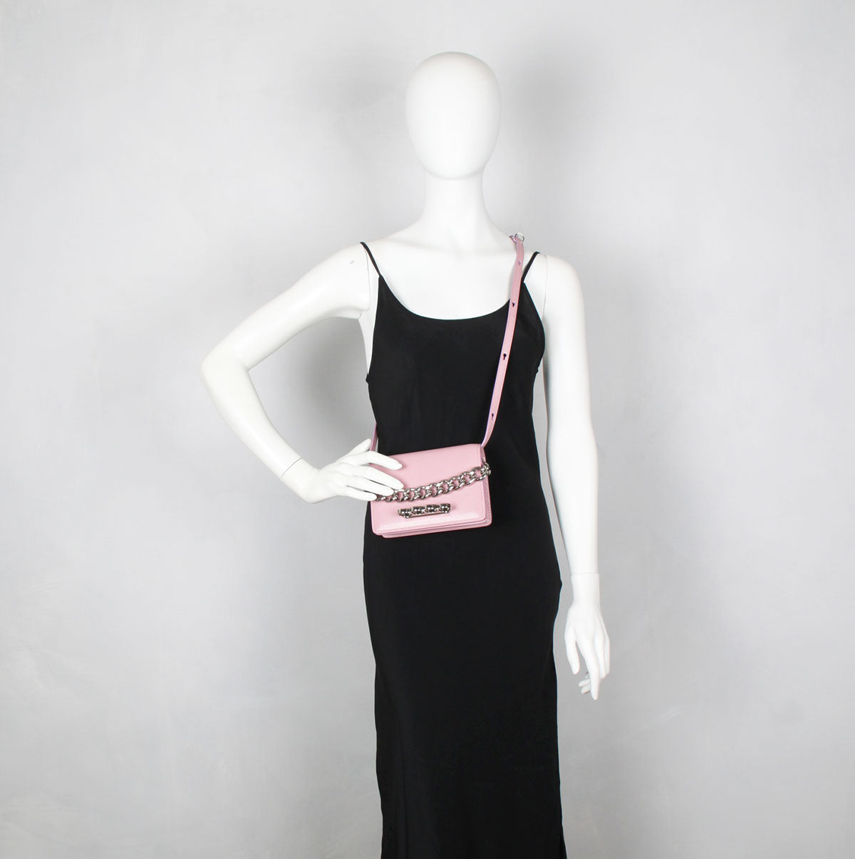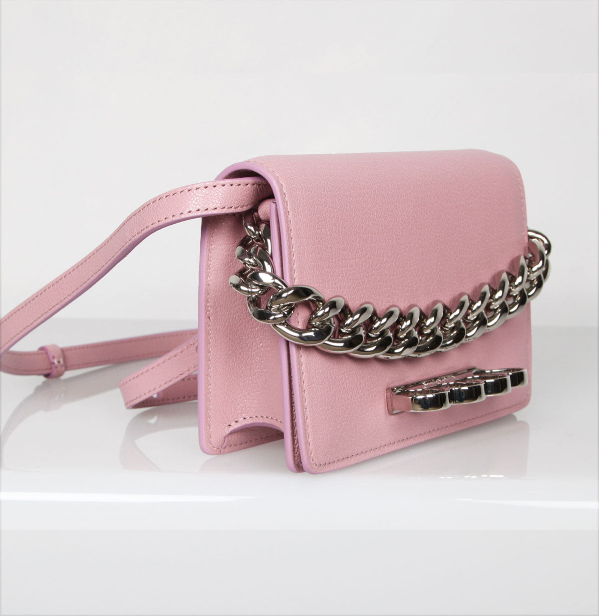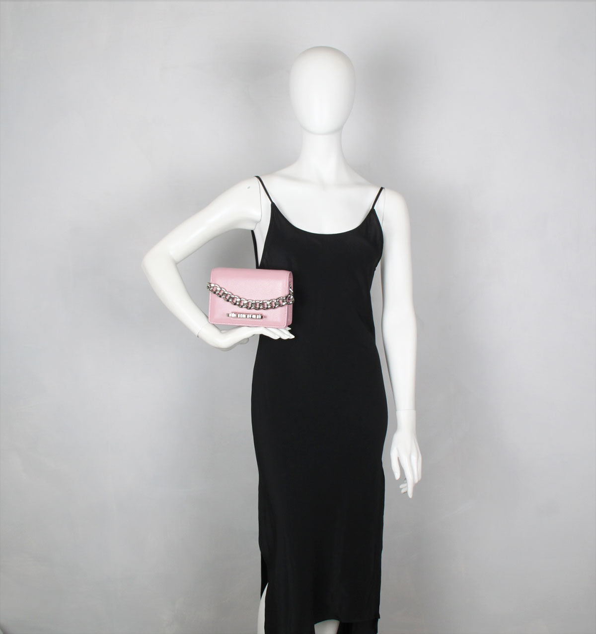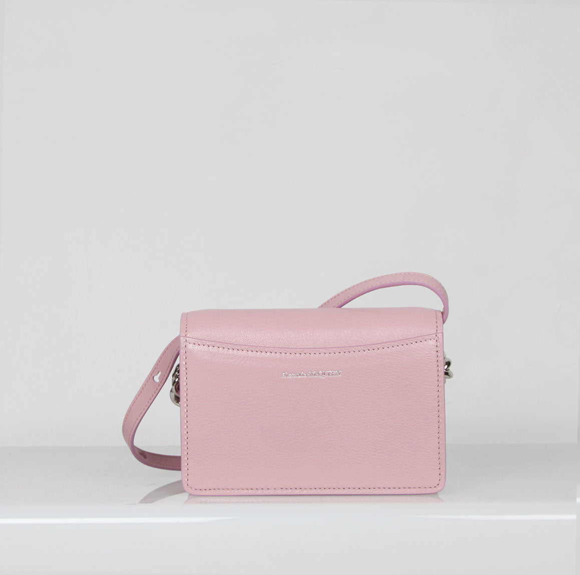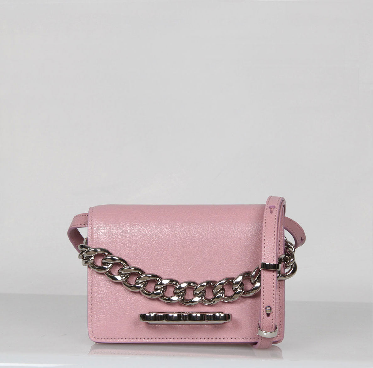 Goat leather Four Ring Mini bag in Antic Pink with a short silver-finished chain. The bag can be worn multiple ways: hand-held using the short chain strap or hand-held as a clutch using the Four Ring handle.