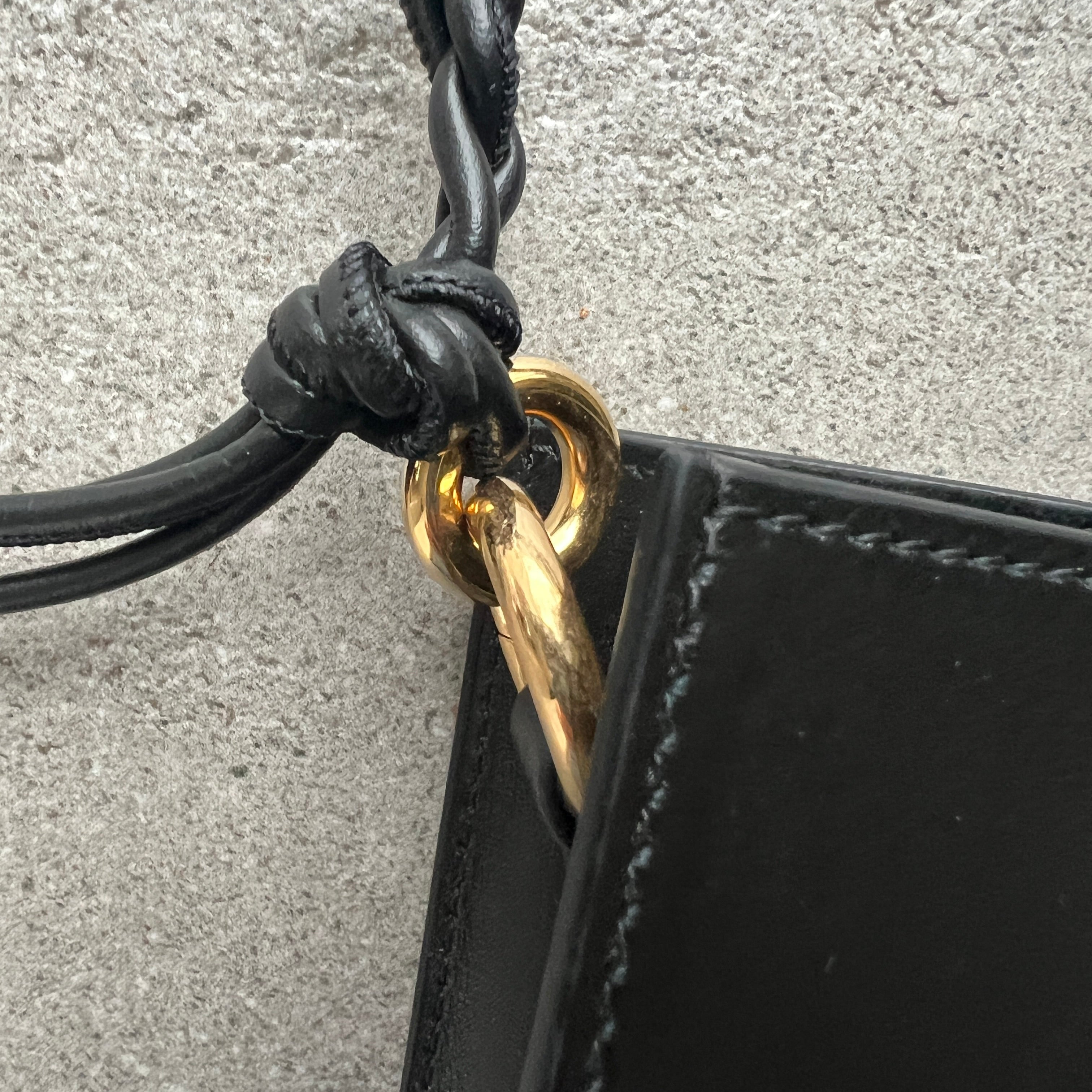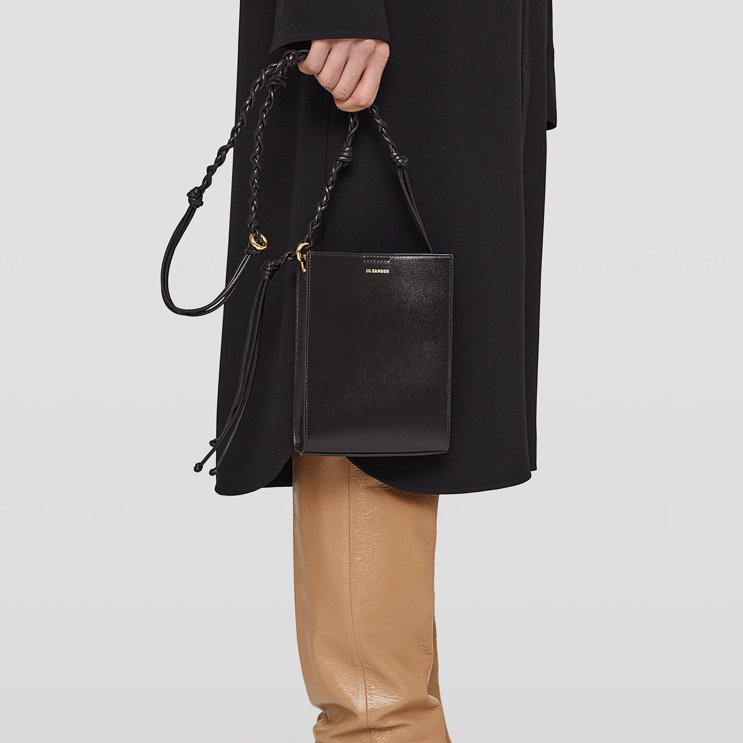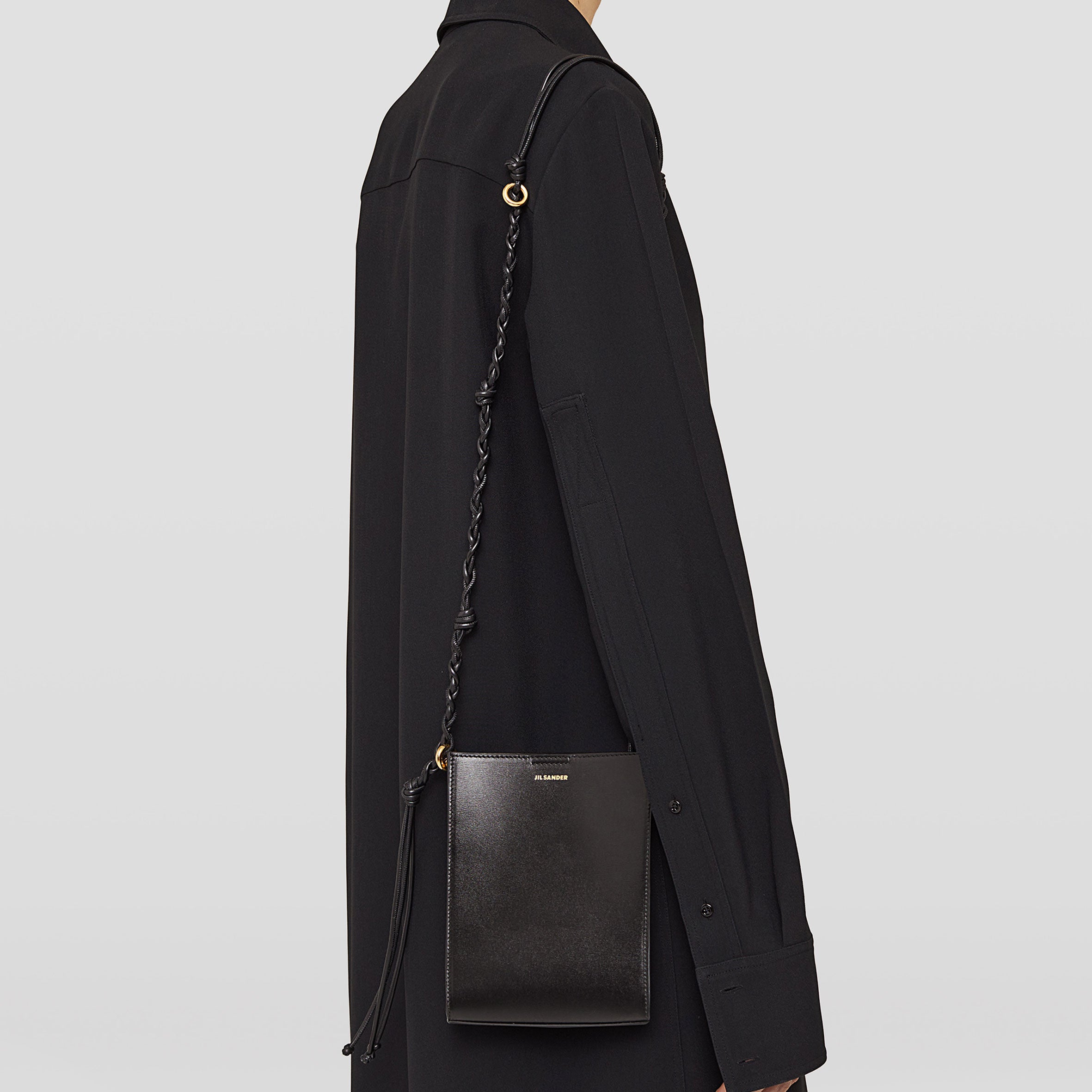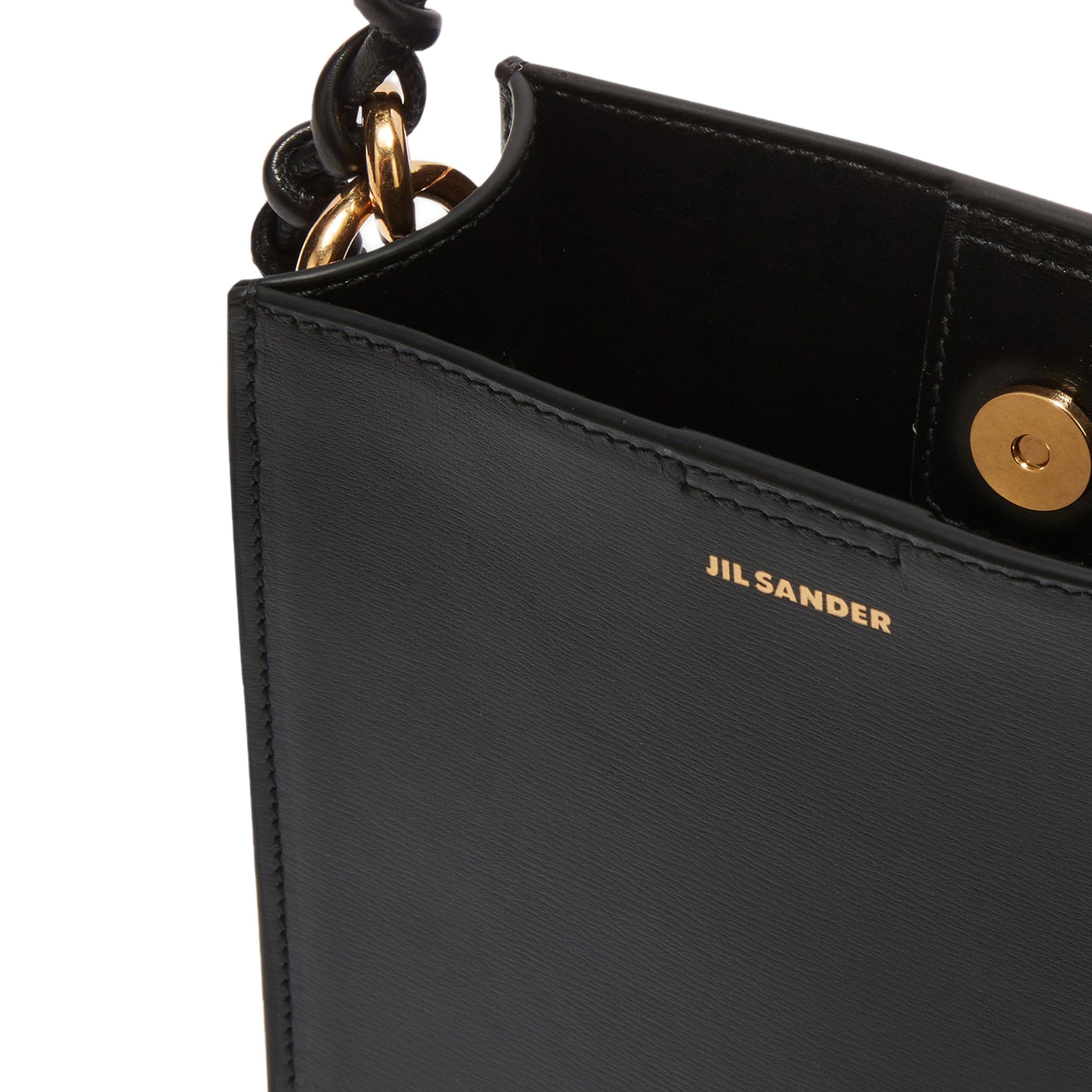 Black ‘Tangle Ring’ shoulder bag from JIL SANDER. Made of calf leather, this item fastens via a zip and showcases a printed logo on the front. It is complete with a braided strap accentuated with metal rings and fringes, gold-tone metal hardware and one internal compartment with a card slot.