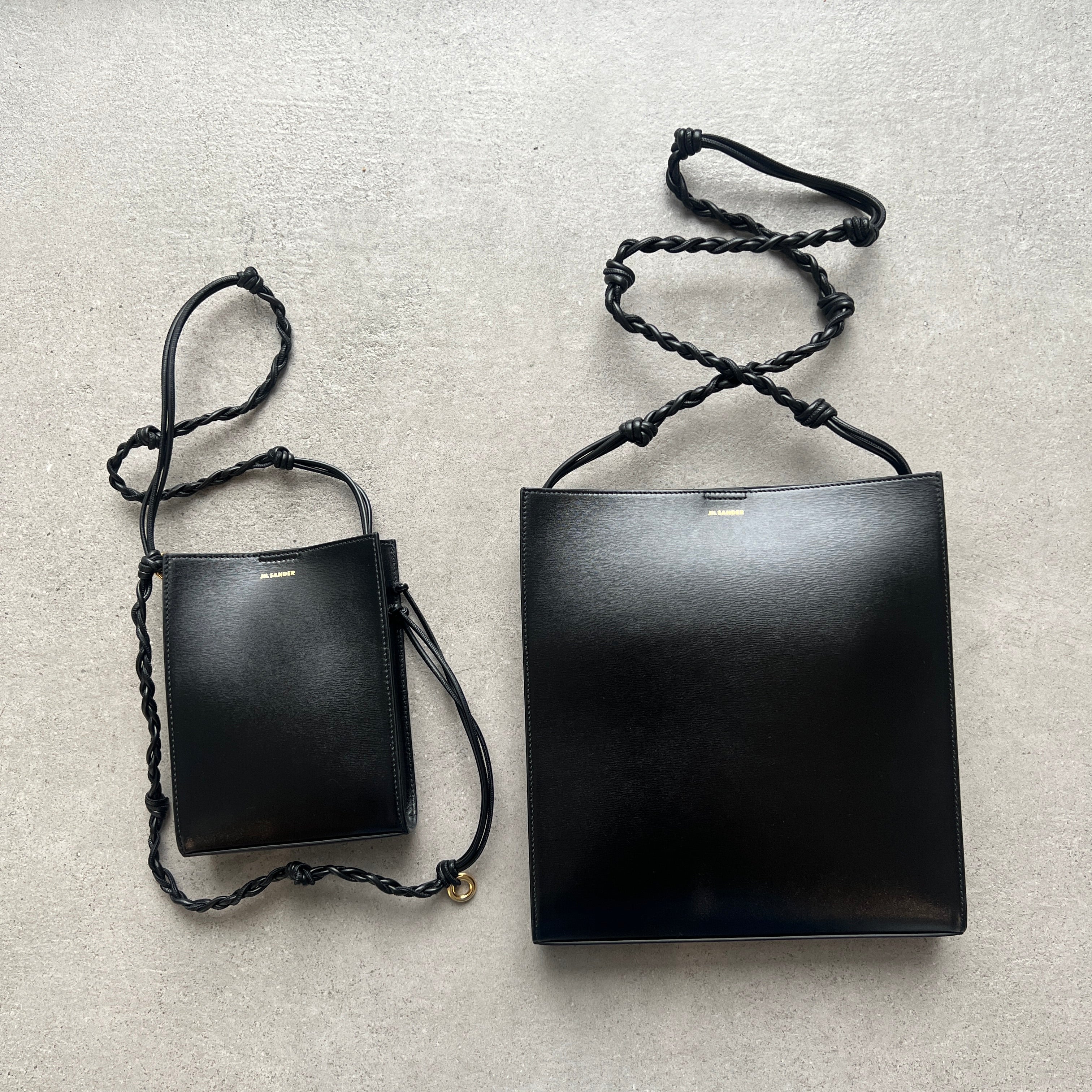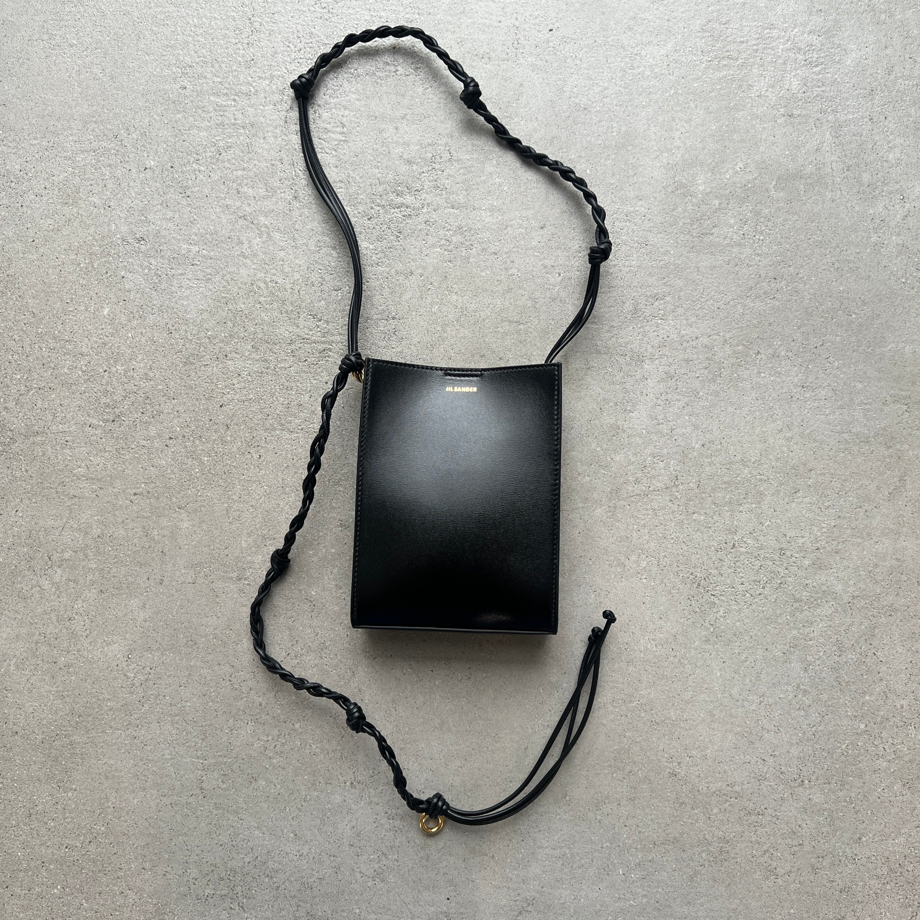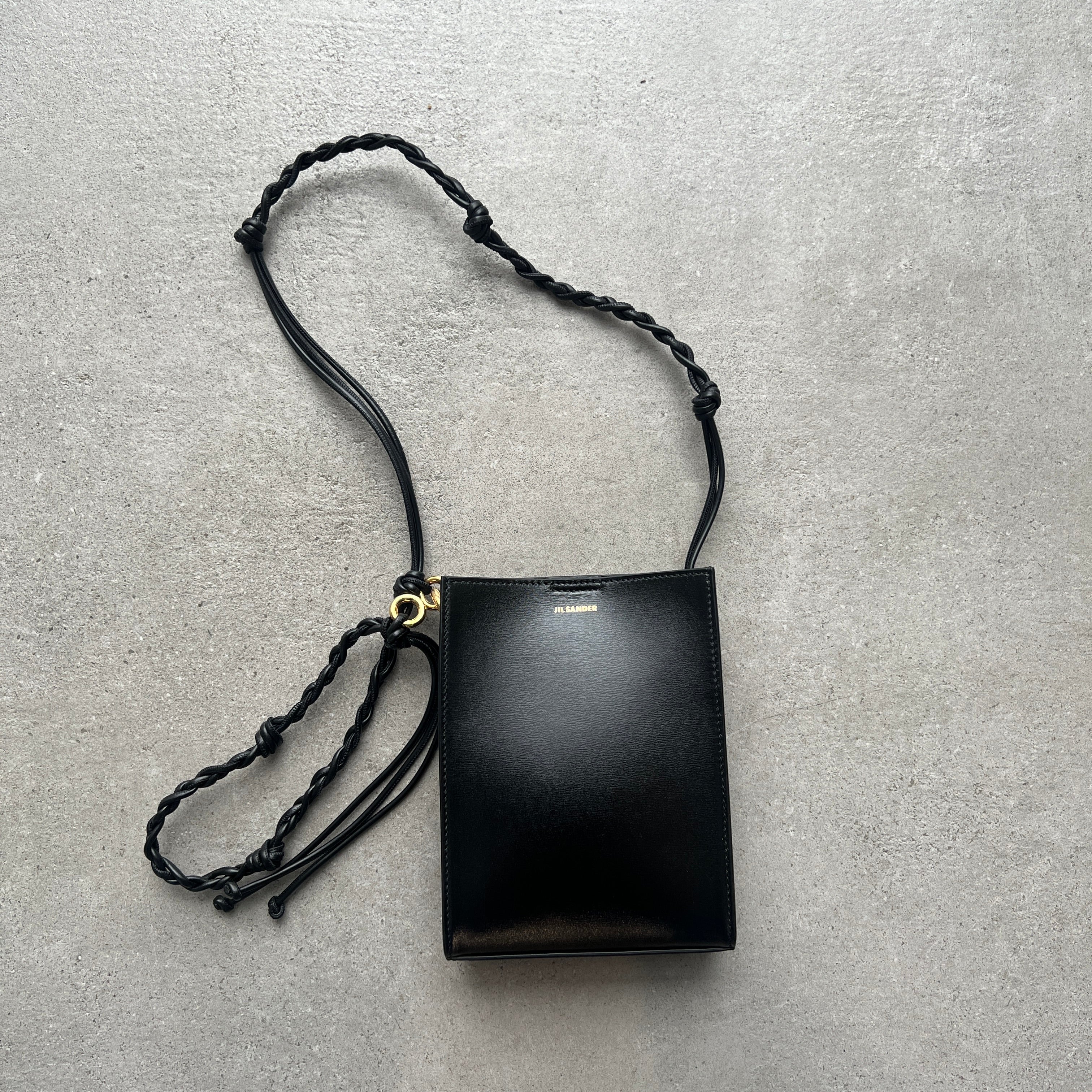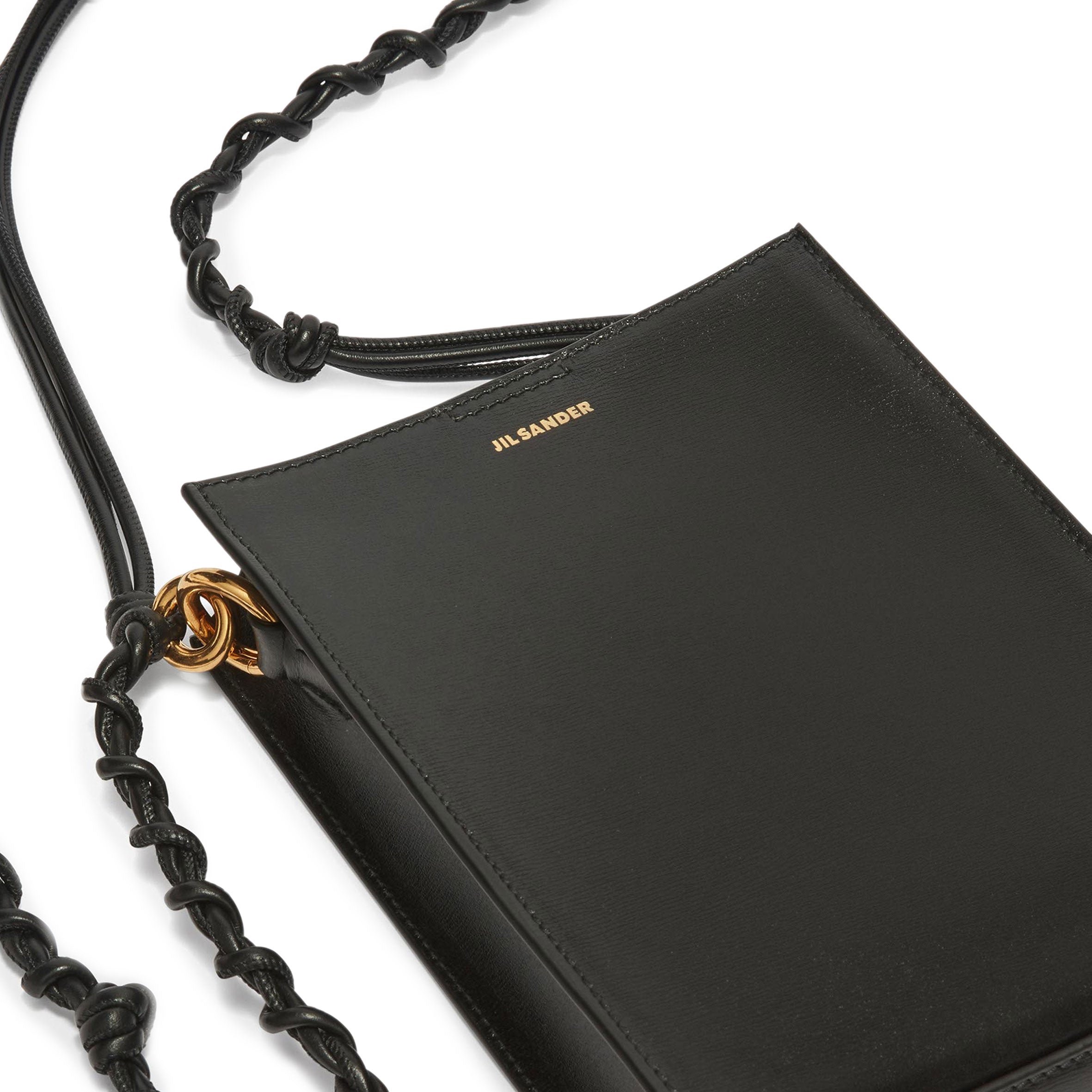 Black ‘Tangle Ring’ shoulder bag from JIL SANDER. Made of calf leather, this item fastens via a zip and showcases a printed logo on the front. It is complete with a braided strap accentuated with metal rings and fringes, gold-tone metal hardware and one internal compartment with a card slot.