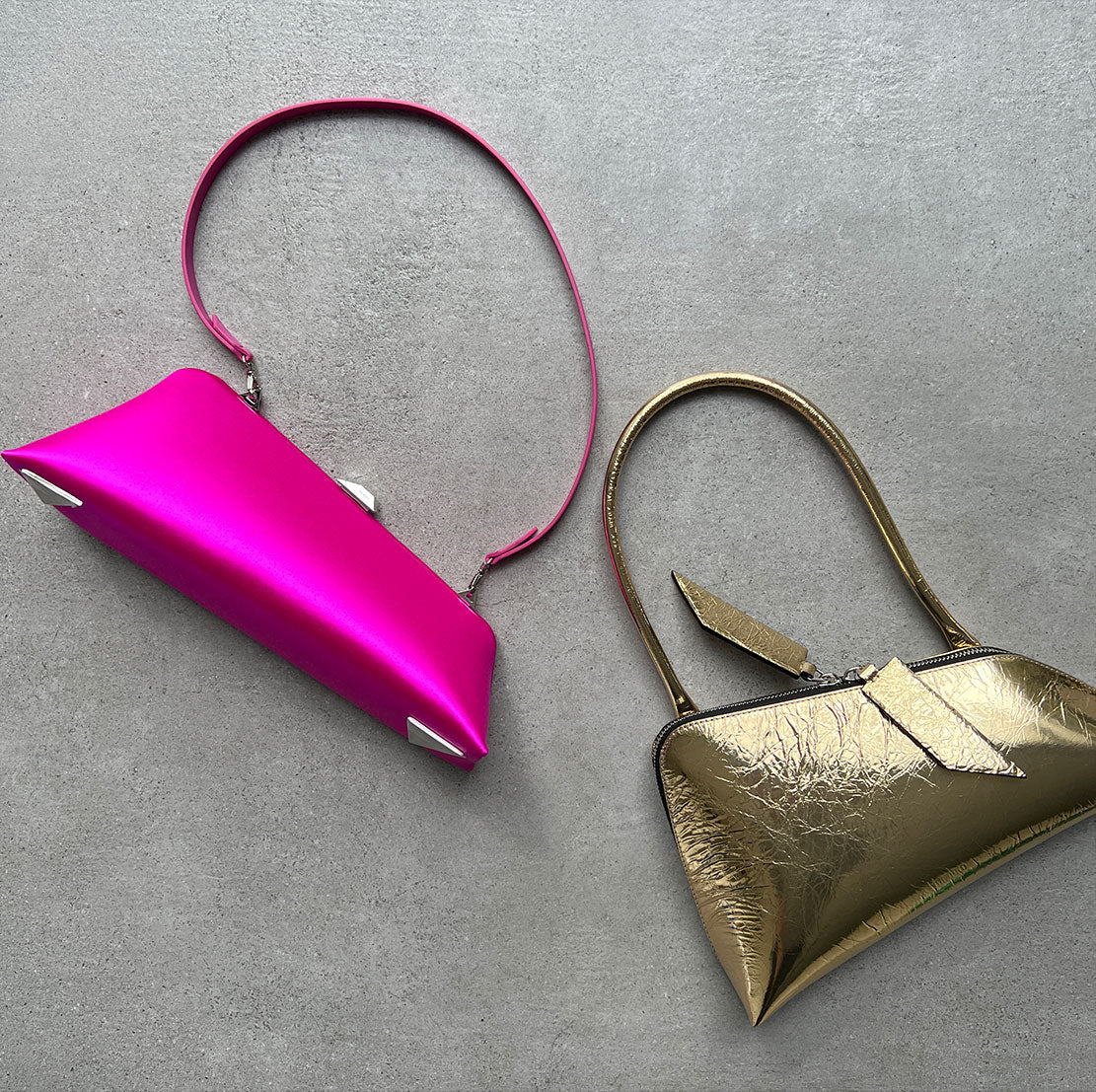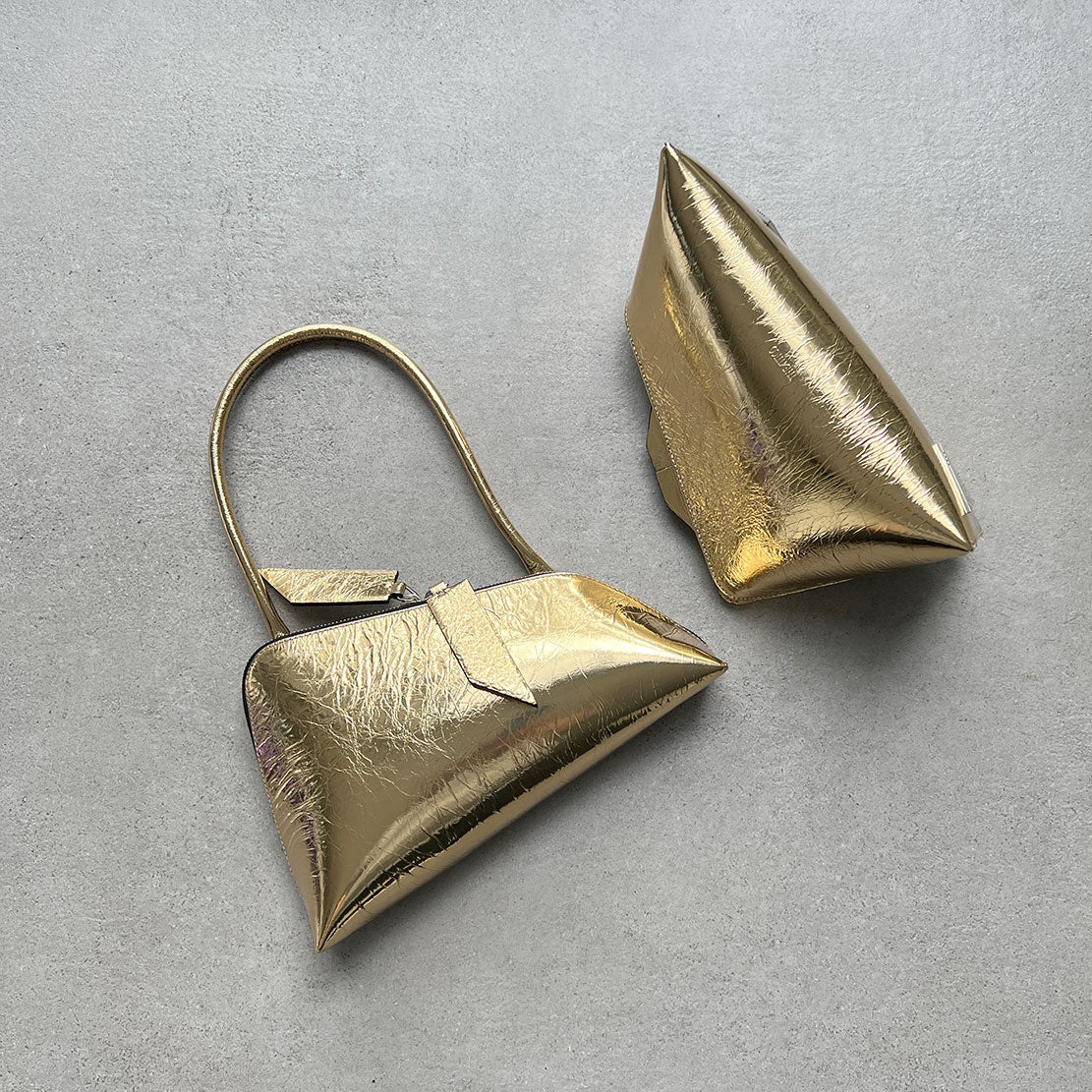 "Sunrise" shoulder bag in Craq Gold finish with shoulder strap and ziptop closure.