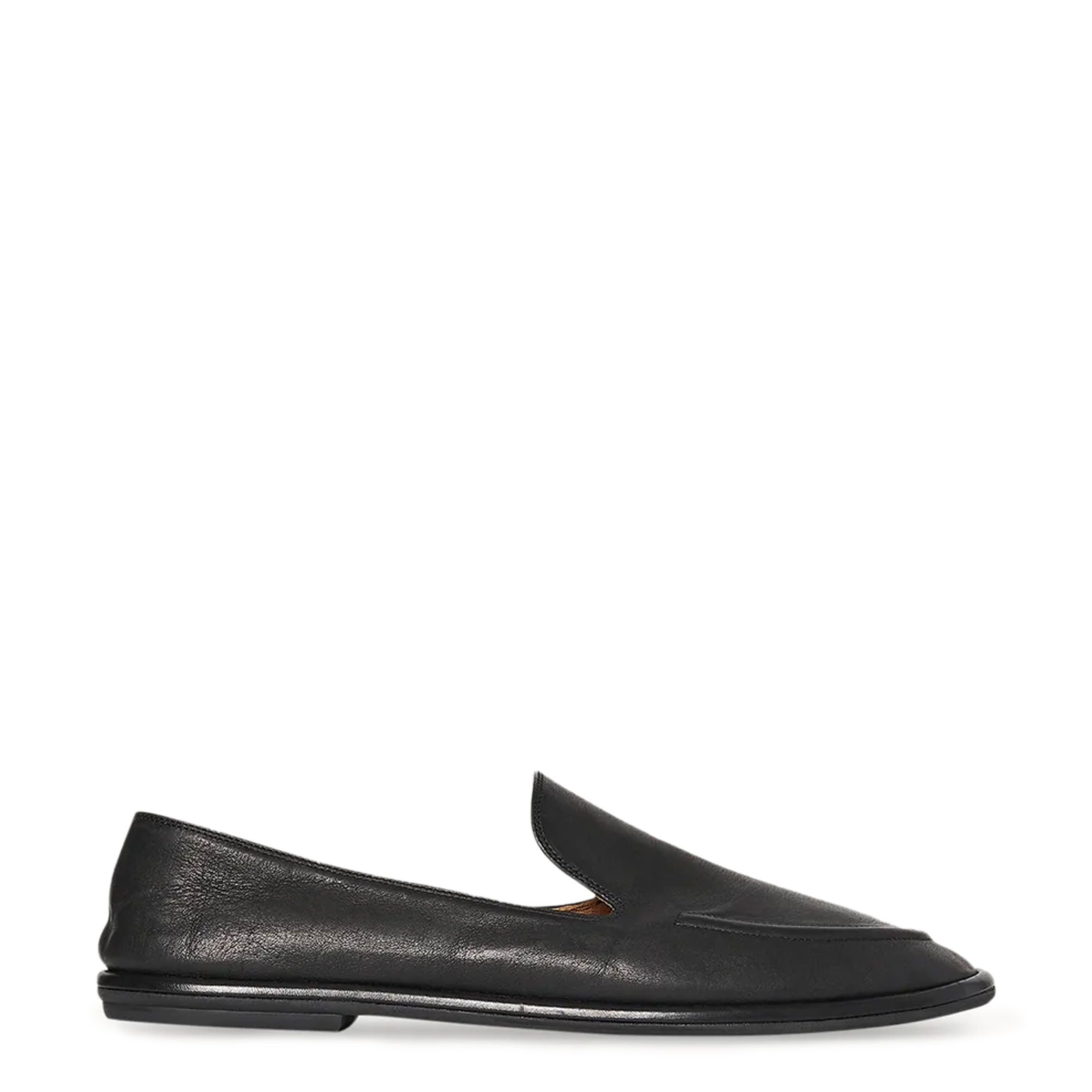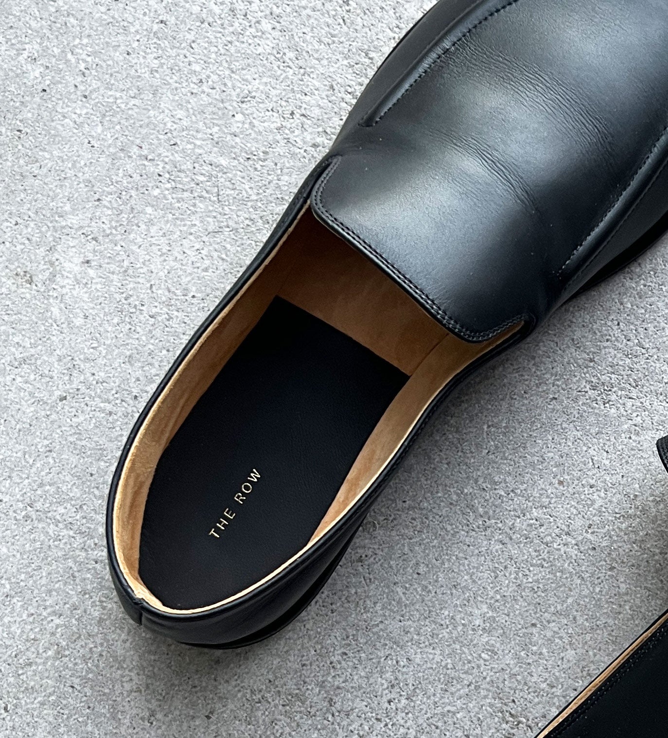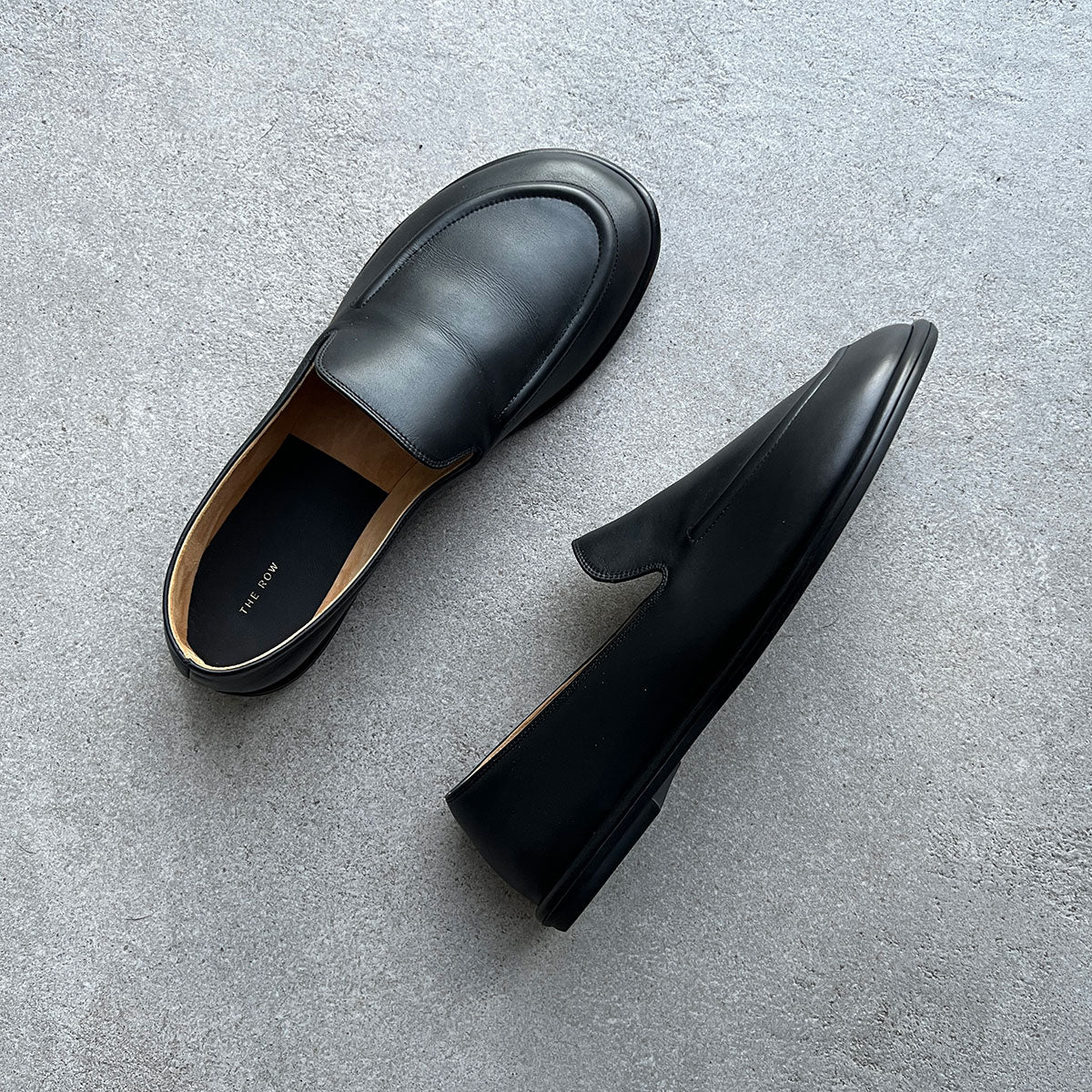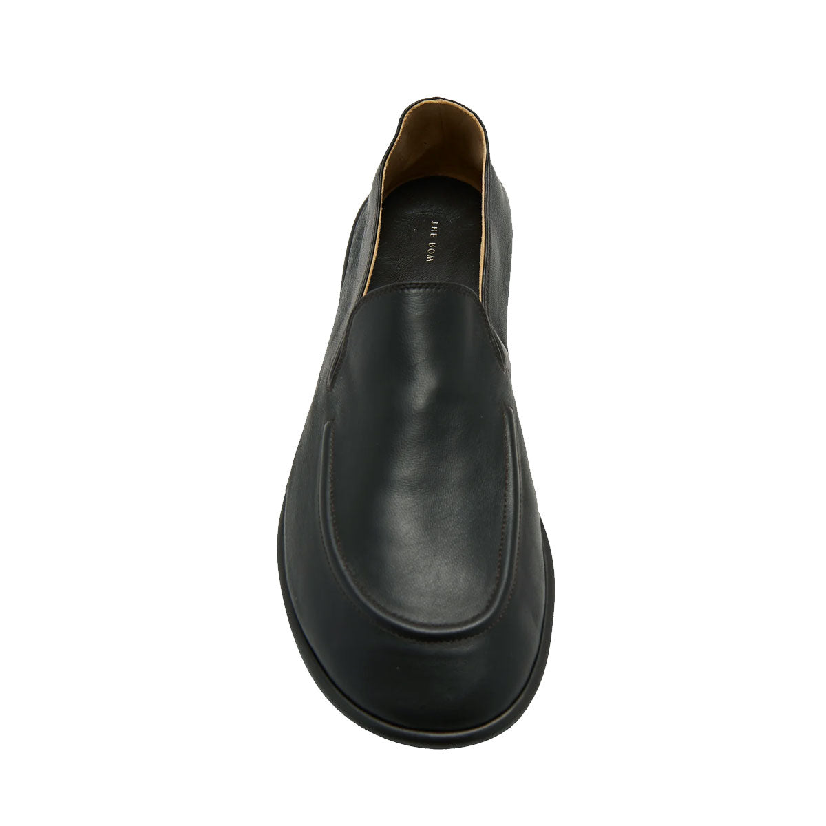 Deconstructed loafer in unlined vegetable-tanned calfskin with round toe, raised stitching toe detail and matte velvety rubber sole.