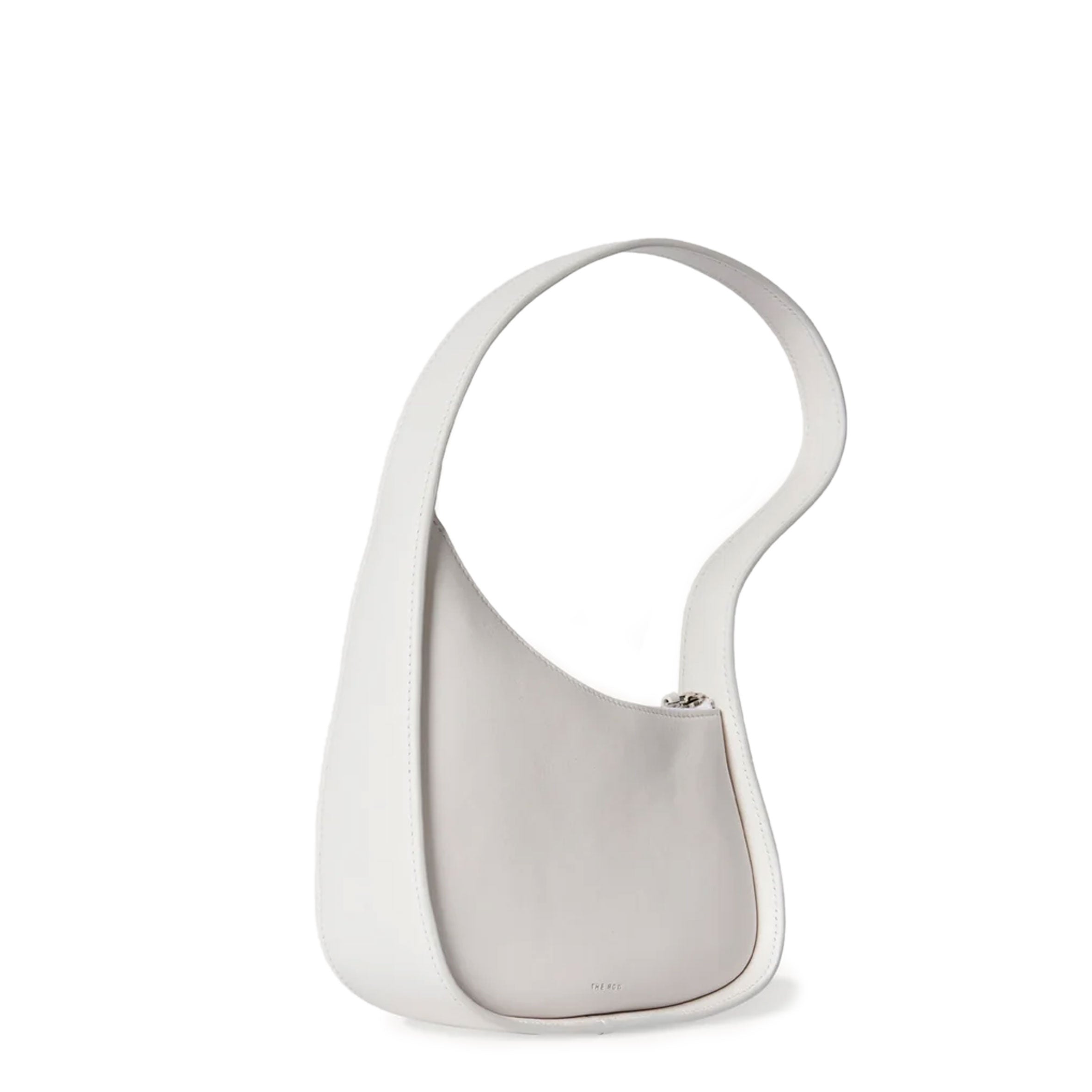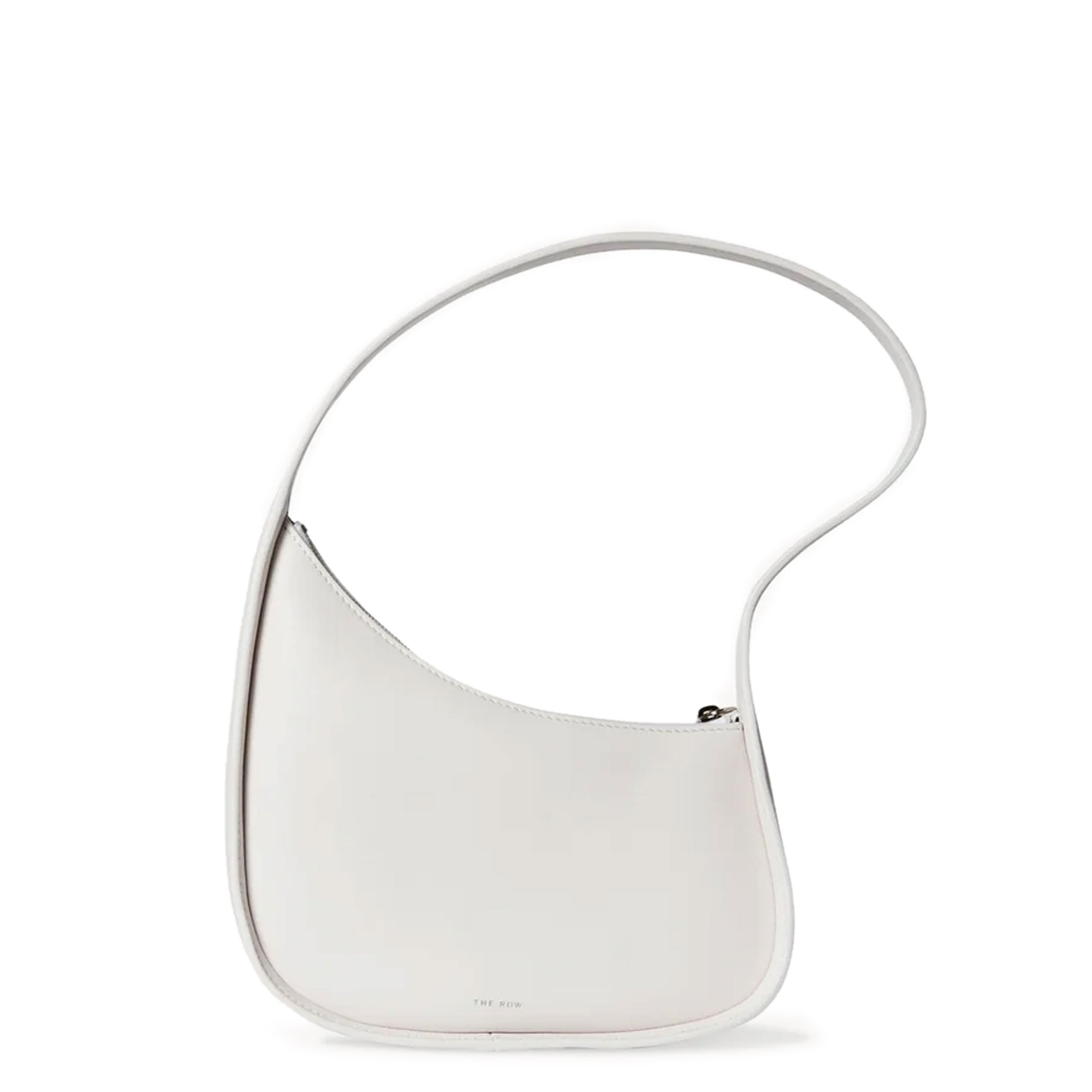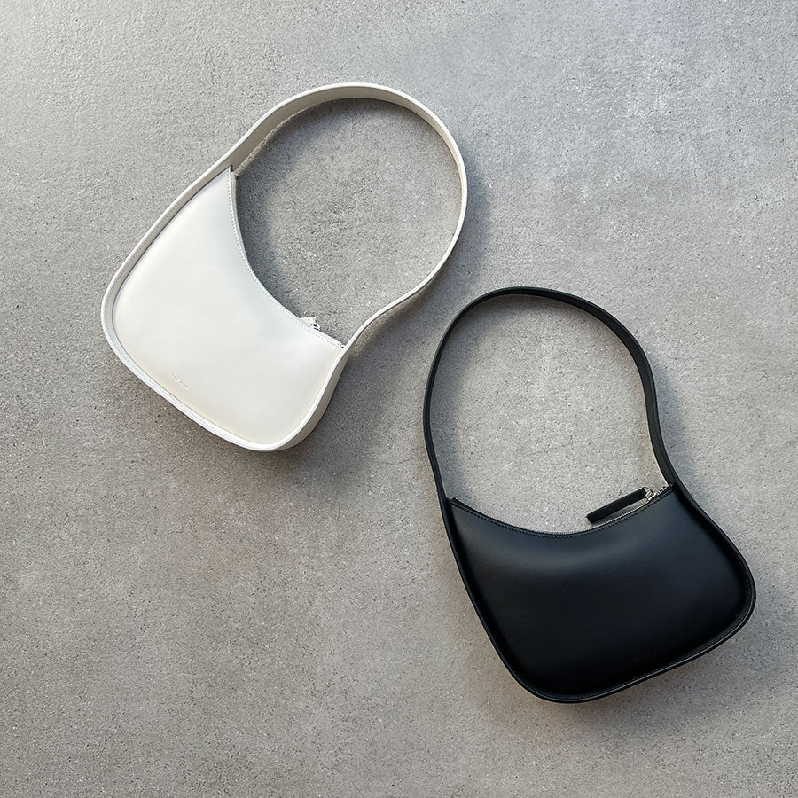 Ergonomic, semi-rigid bag in smooth calfskin leather with flat shoulder strap and curved zipper closure.