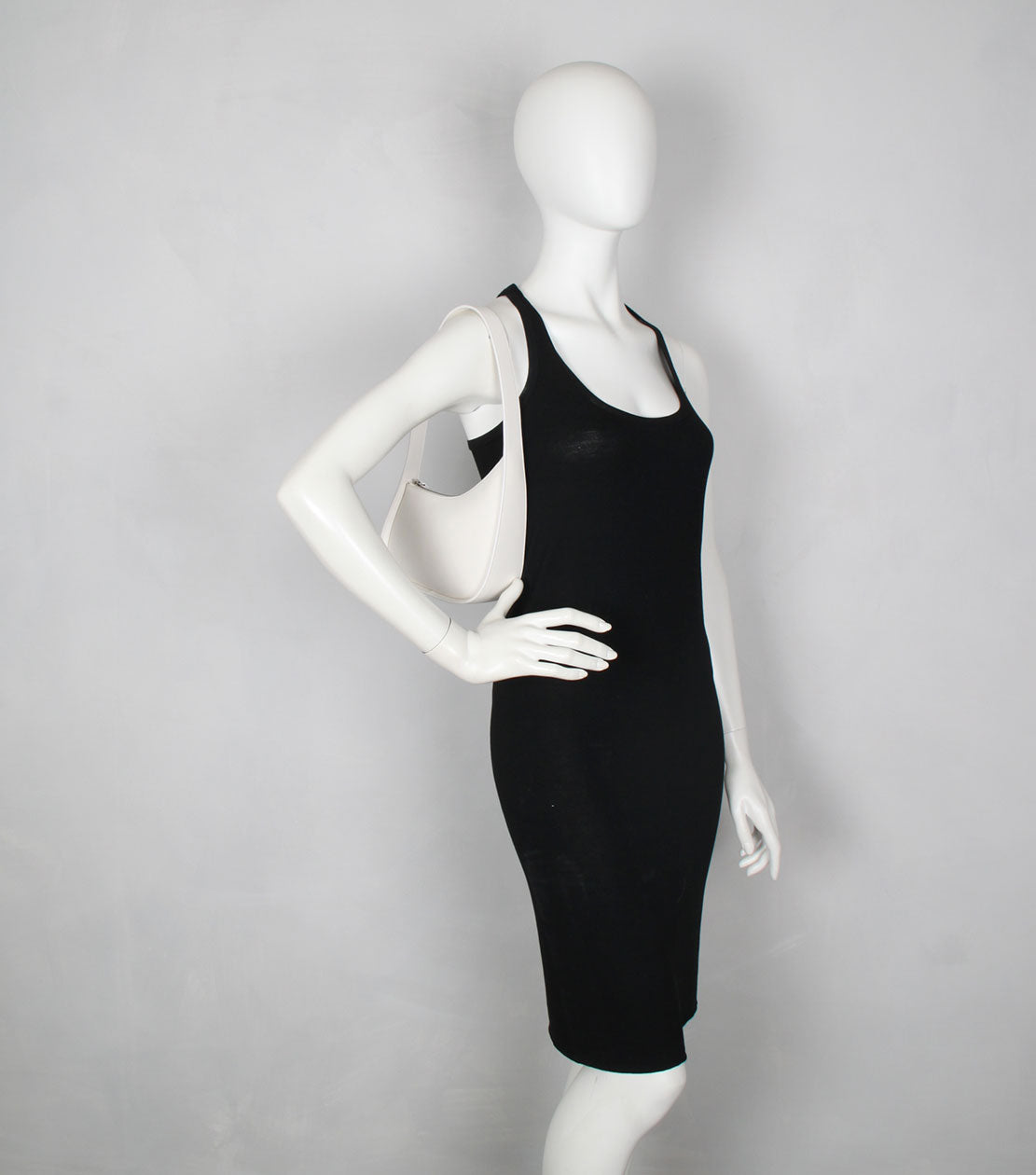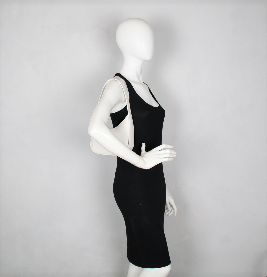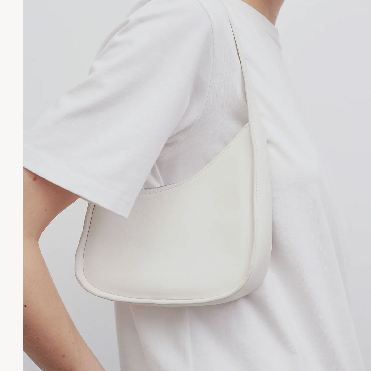 Ergonomic, semi-rigid bag in smooth calfskin leather with flat shoulder strap and curved zipper closure.